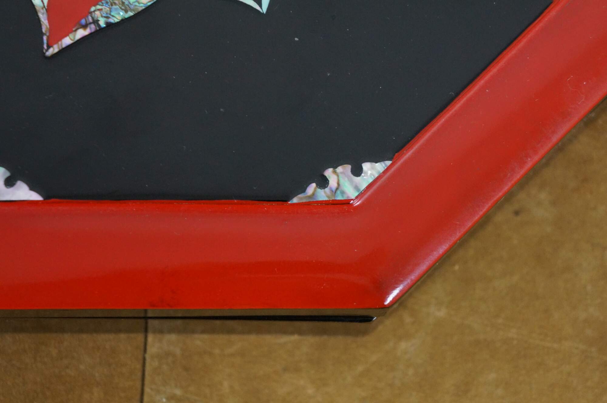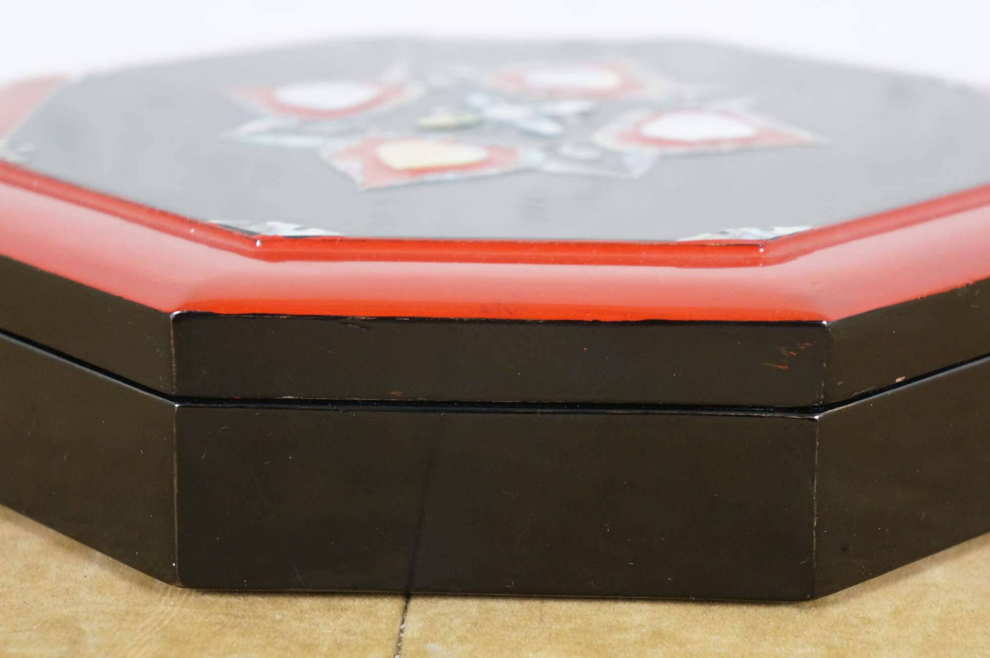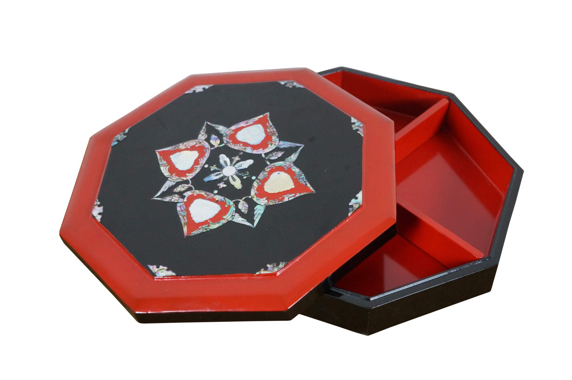 1970s octagonal red and black lacquerware bento or trinket box with floral mother of pearl design inlaid on the lid. Red interior with removable four section divider.