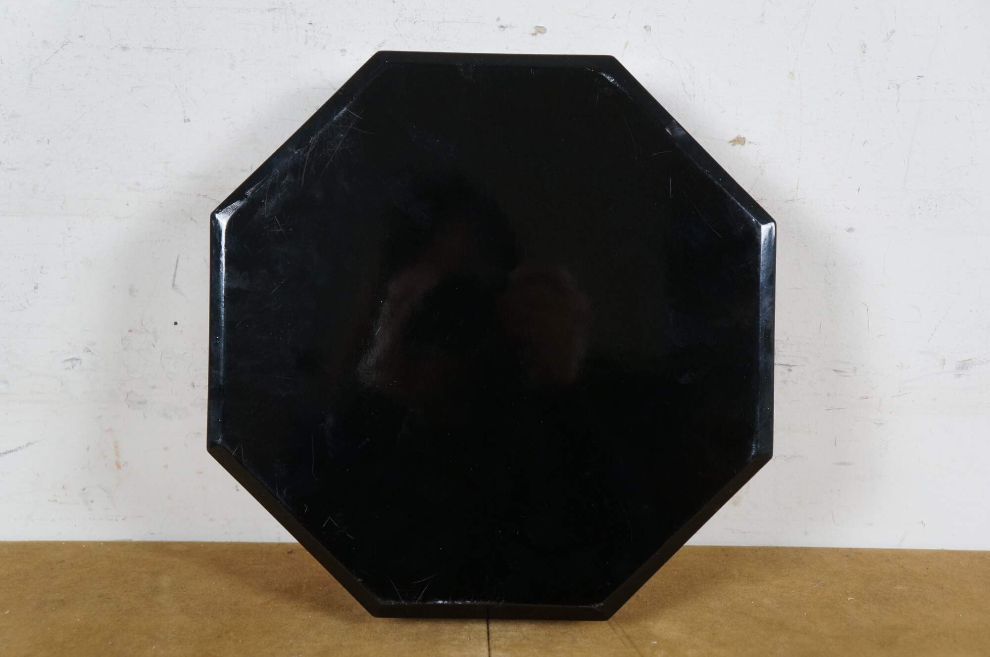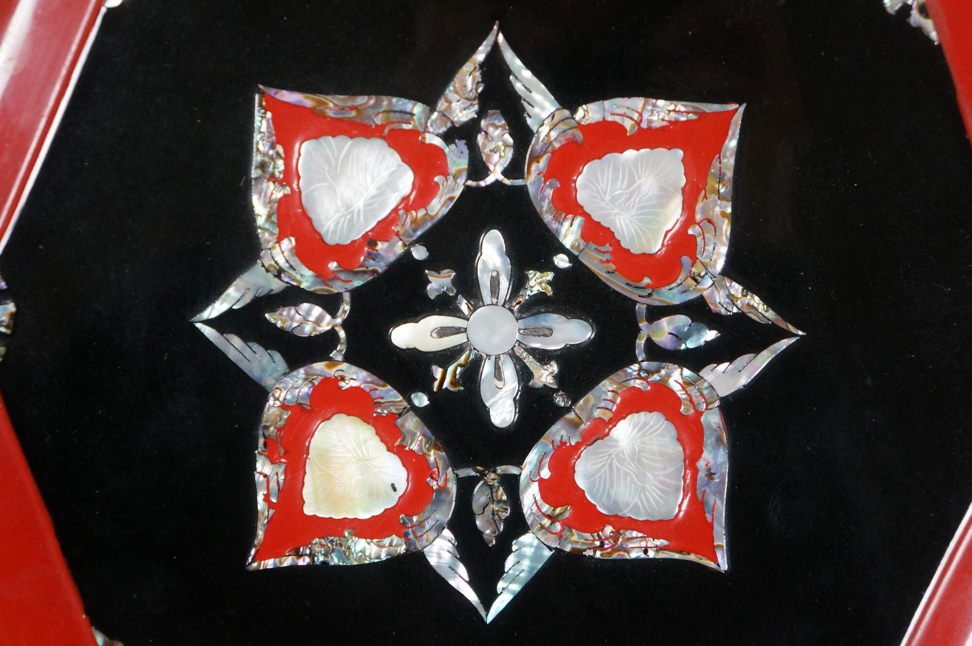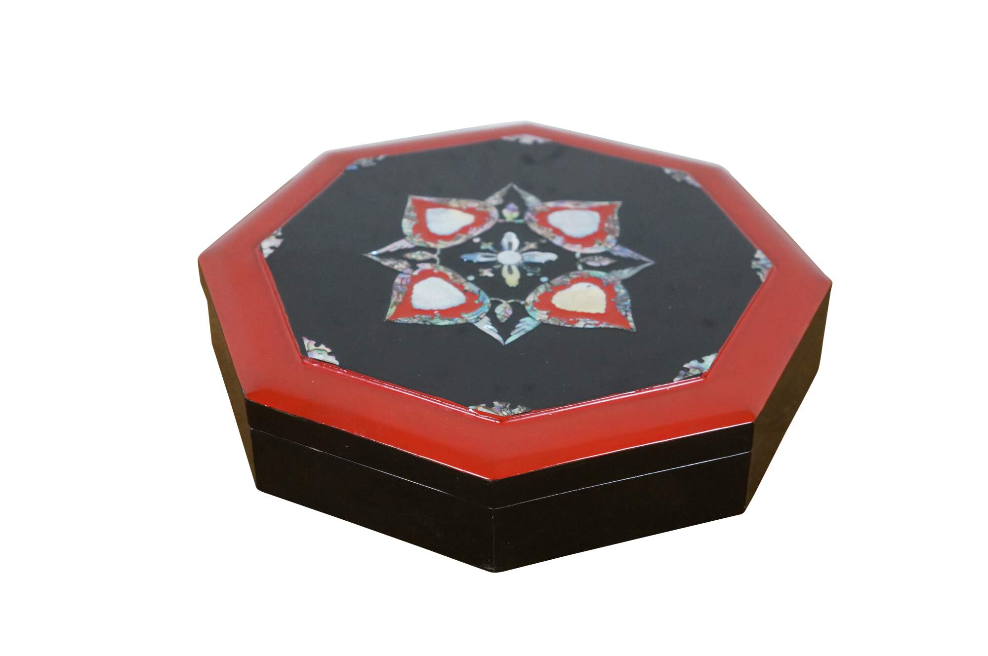 1970s octagonal red and black lacquerware bento or trinket box with floral mother of pearl design inlaid on the lid. Red interior with removable four section divider.