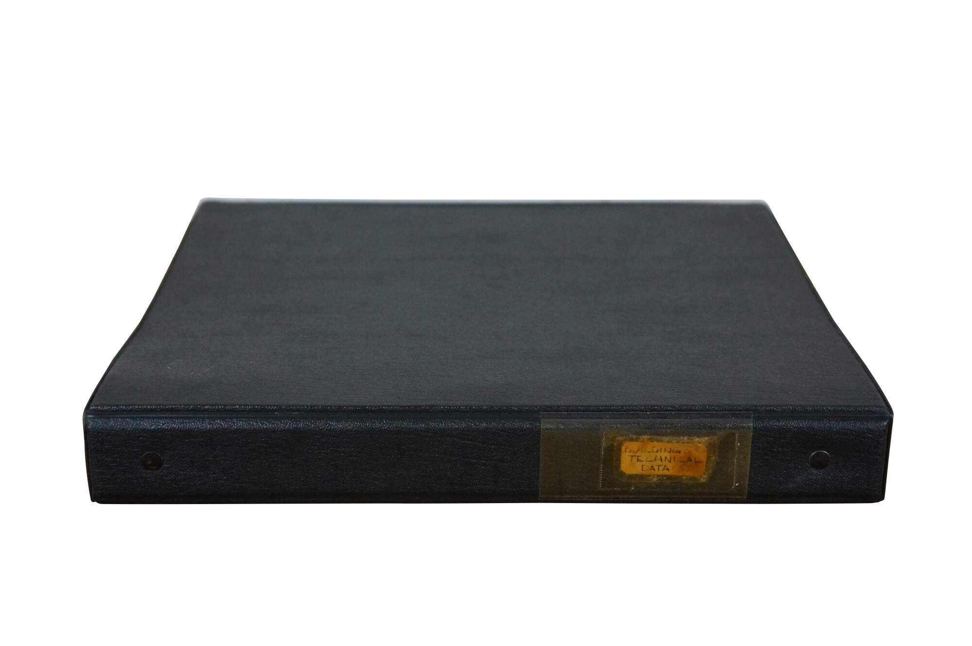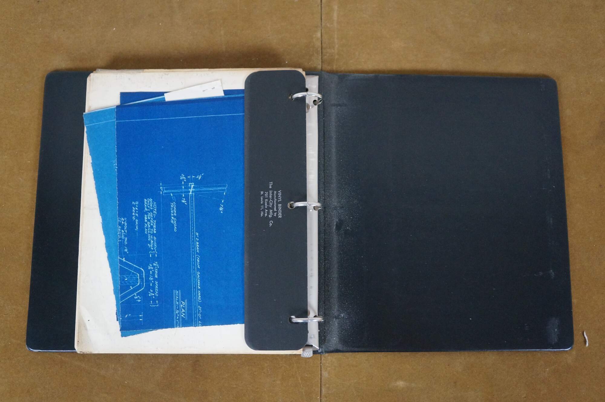 Rare early to mid 20th century binder of Building Techinical Data from The National Cash Register Company, containing hand written notes tracking information such as the erection dates of NCR buildings, building values for insurance purposes, and technical notes and blue prints for structures and parts of structures. Black vinyl binder manufactured by The Inter-City Manufacturing Company of St Louis, MO.