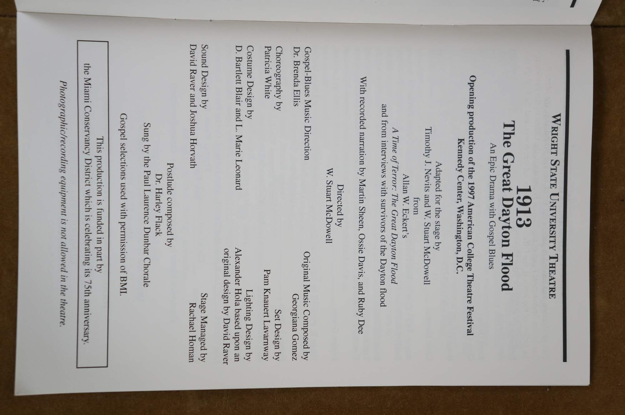 Vintage 1997 Stage Wright theatre program and tickets. The Wright State University Department of Theatre Arts presents 1913: The Great Dayton Flood (An Epic Drama with Gospel Blues) by Timothy J. Nevits and W. Stuart McDowell at the Victoria Theatre.