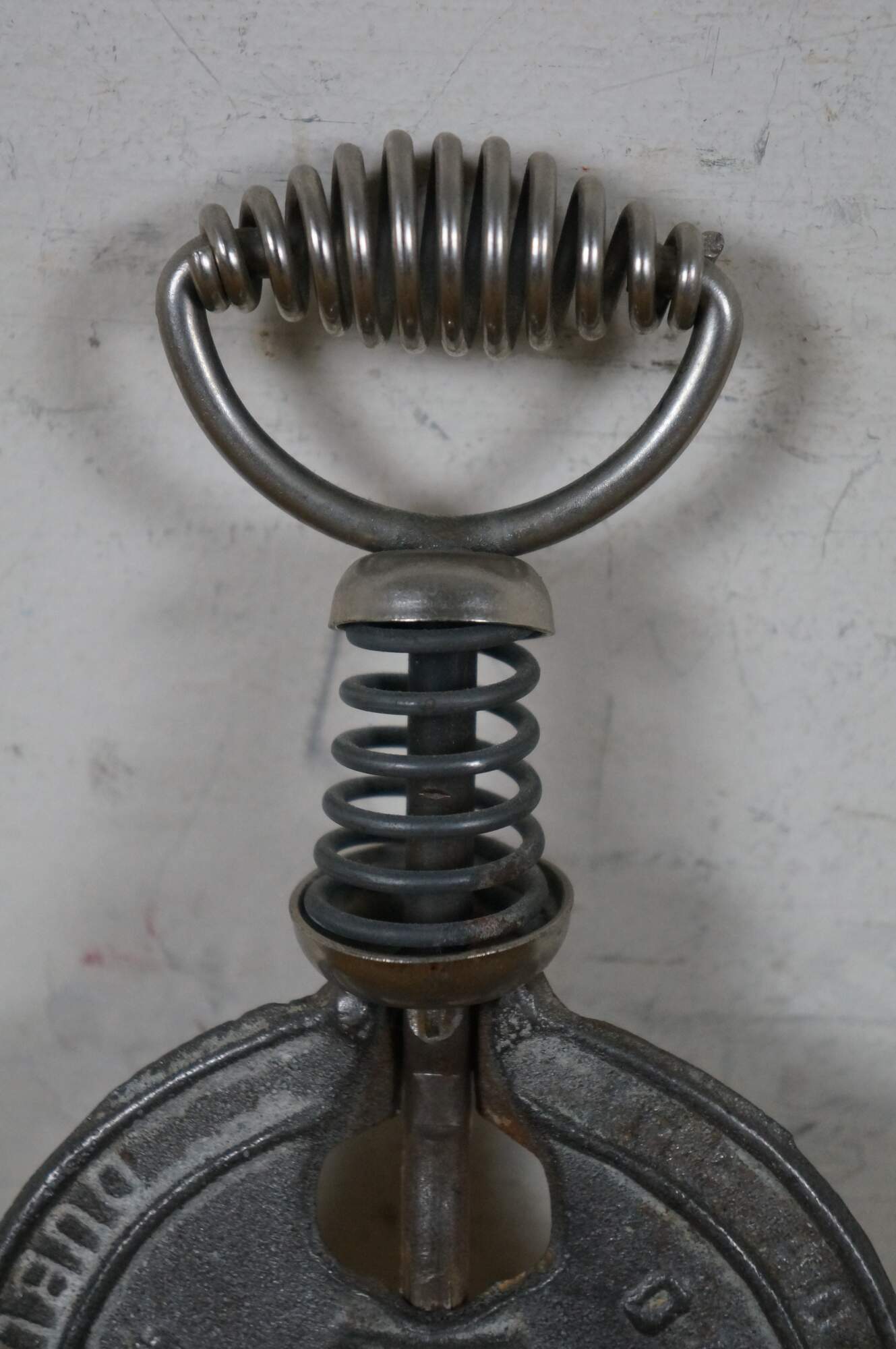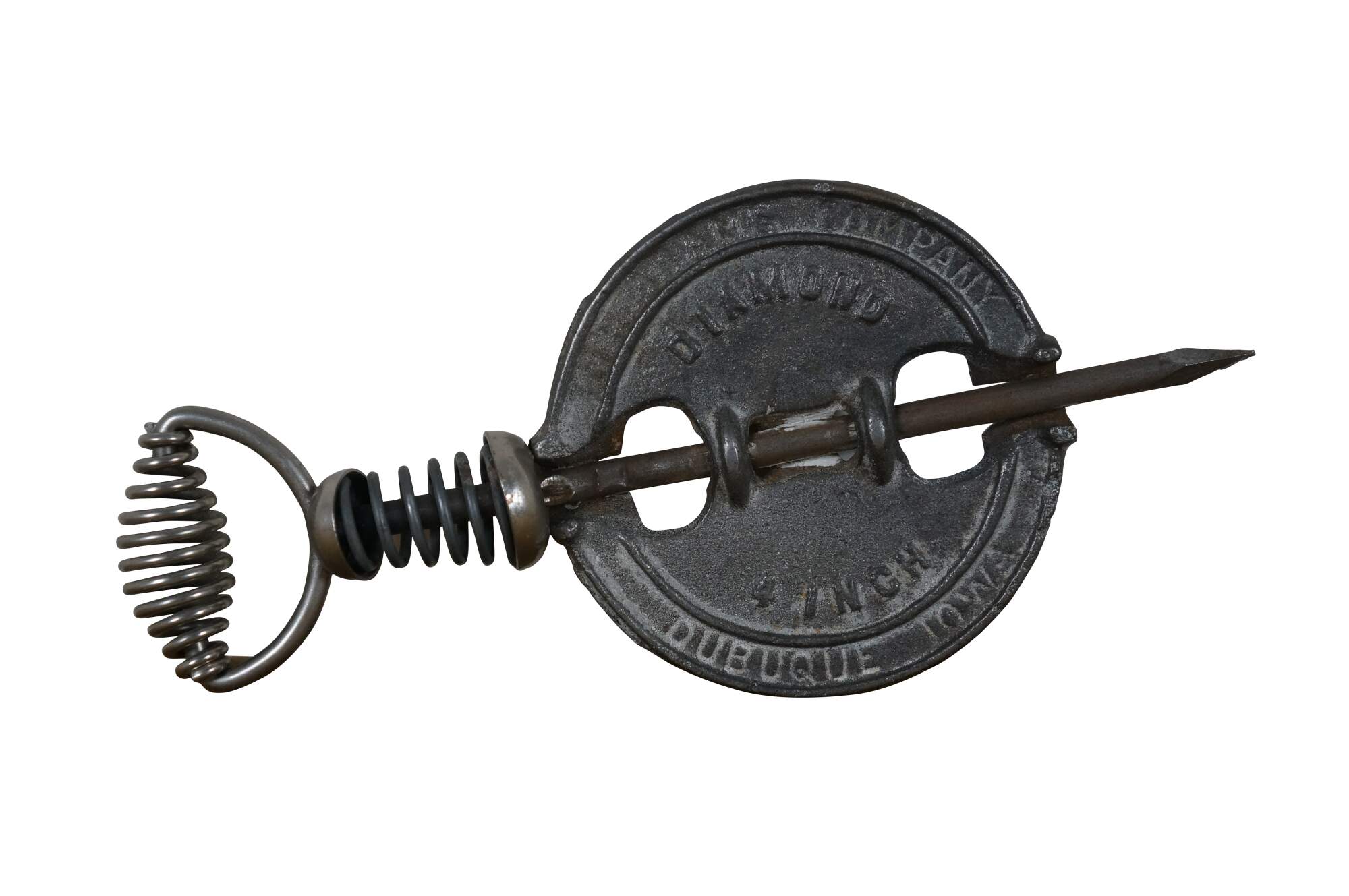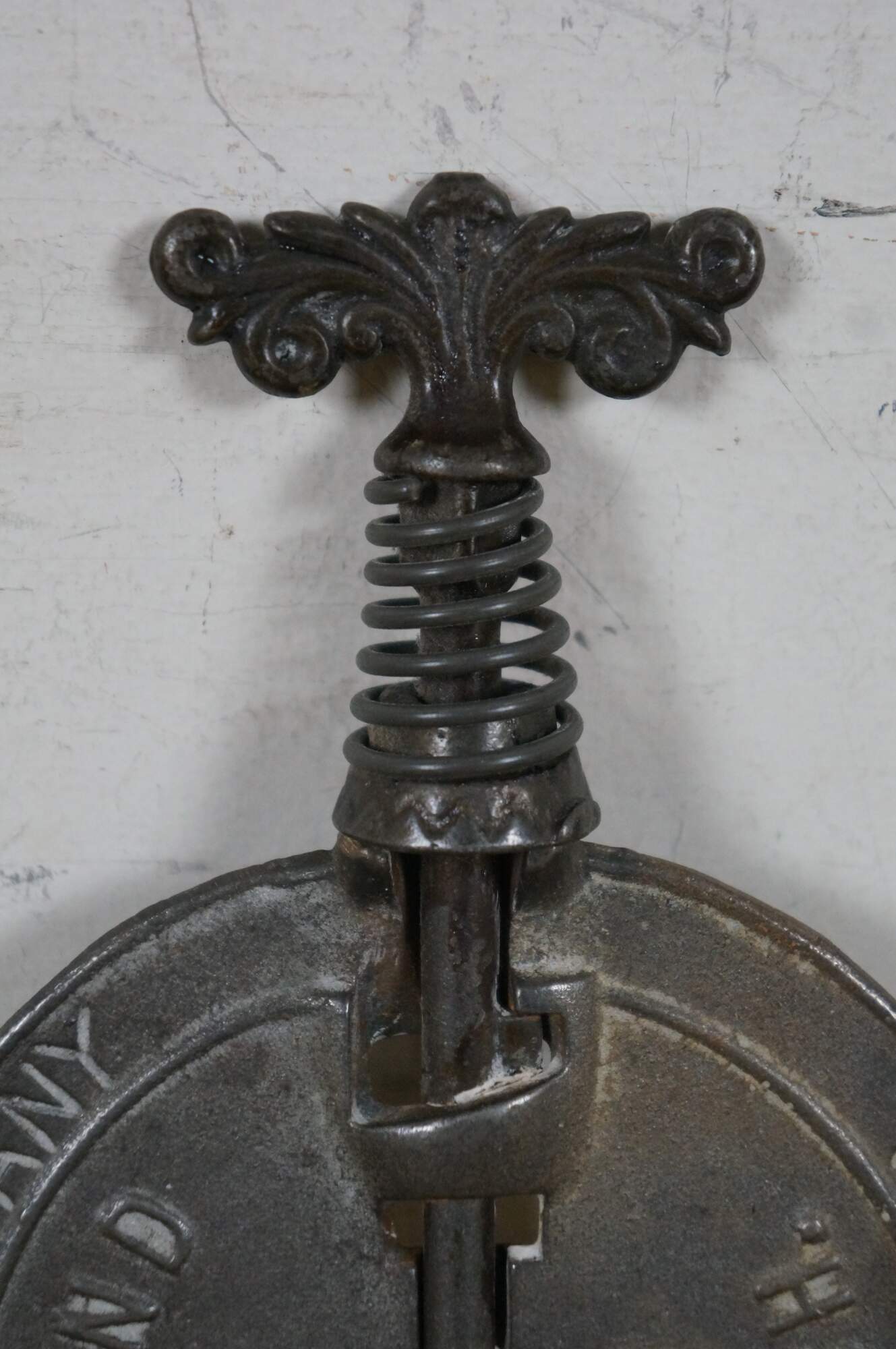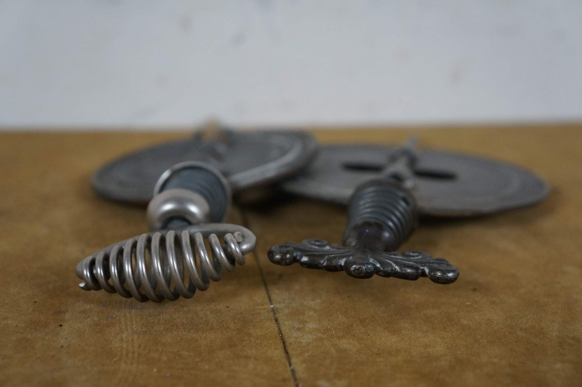 Pair of antique iron Diamond stove dampers produced by The Adams Company of Dubuque, Iowa. 5 inch damper sports an ornate foliate handle. 4 inch damper has a spring shaped handle.