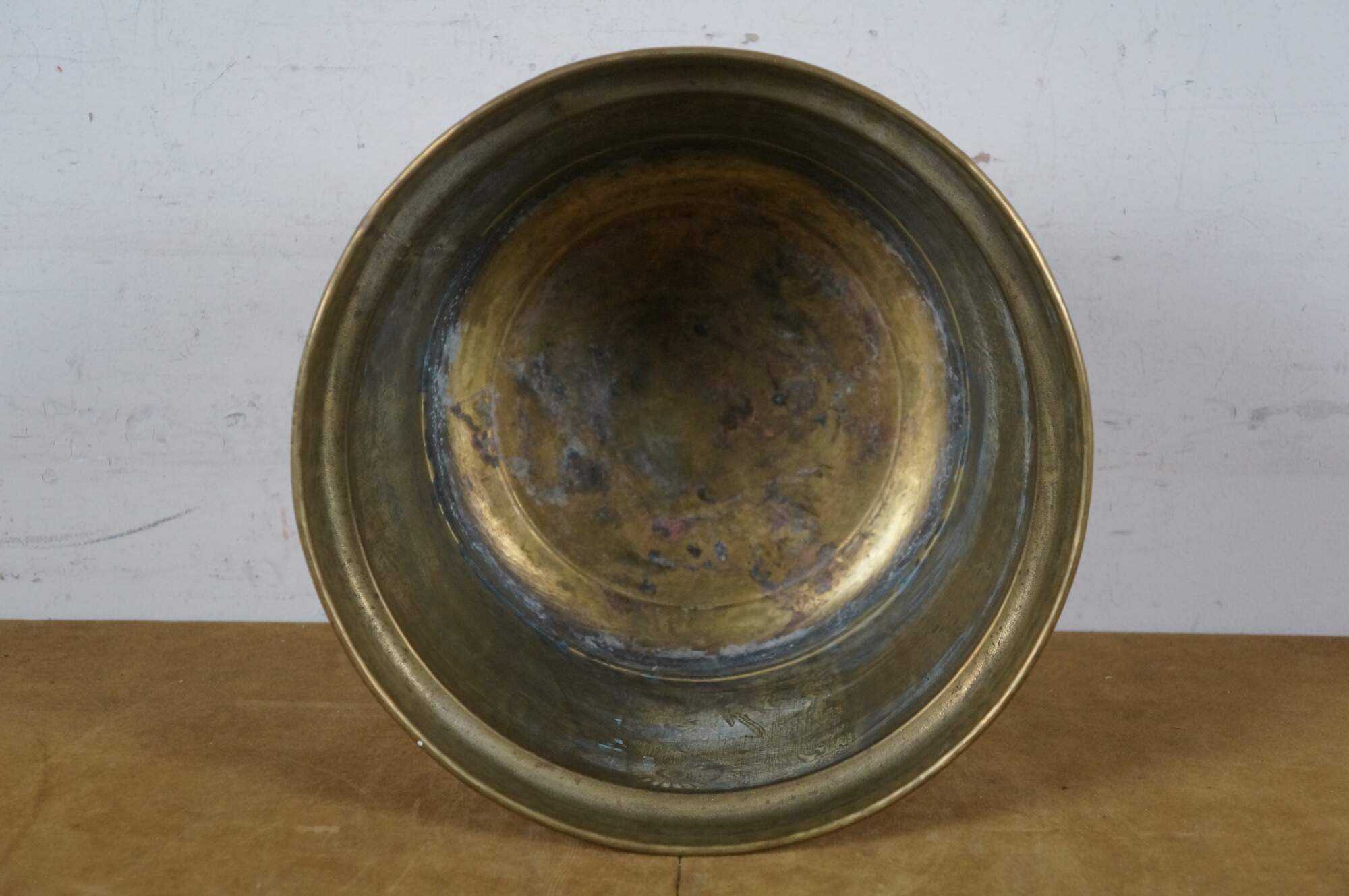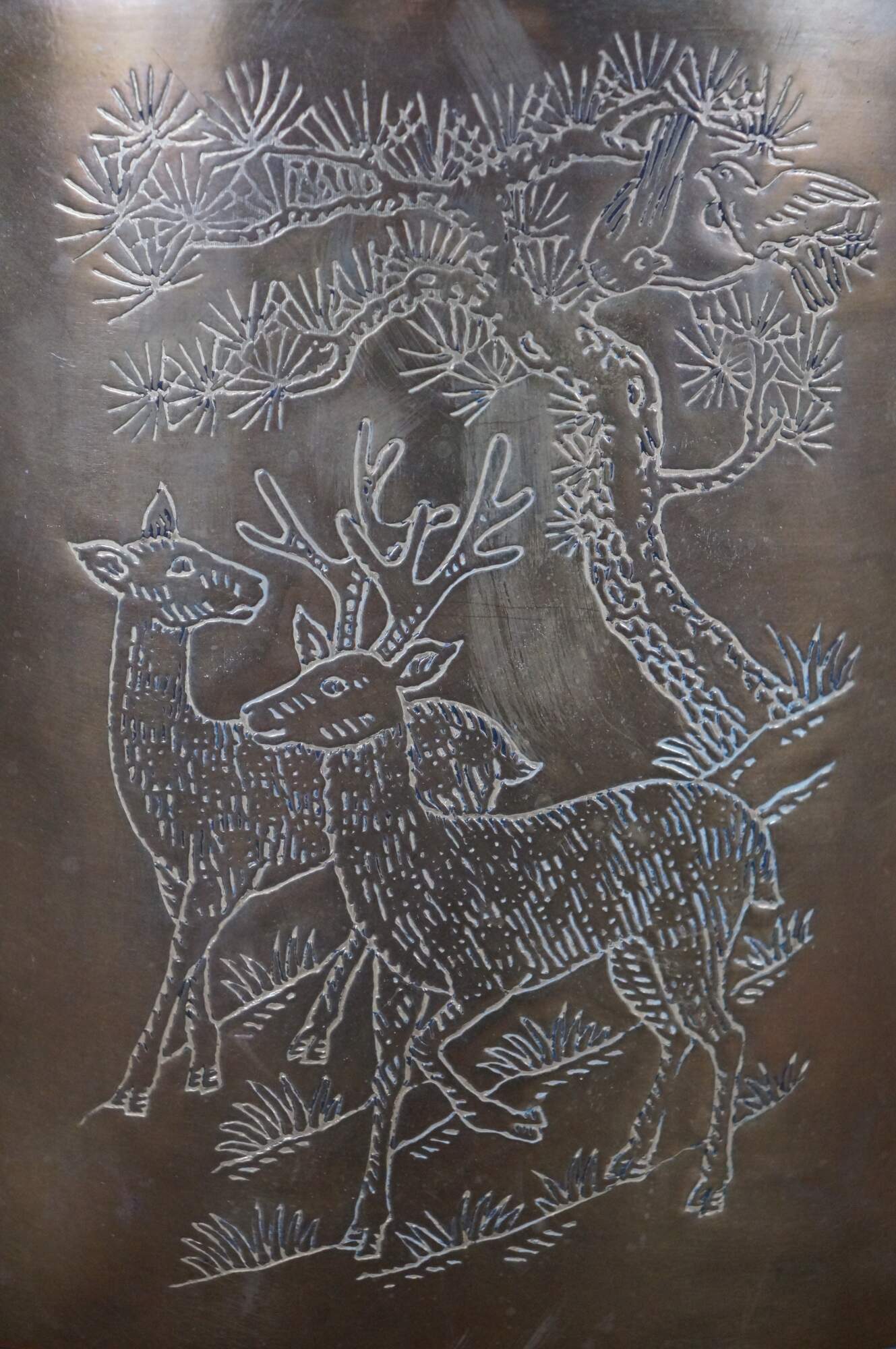 Late 20th century brass planter, etched with images of a Bengal tiger, pair of deer, eagle, and sparrows. Made in Hong Kong by Napcoware.
