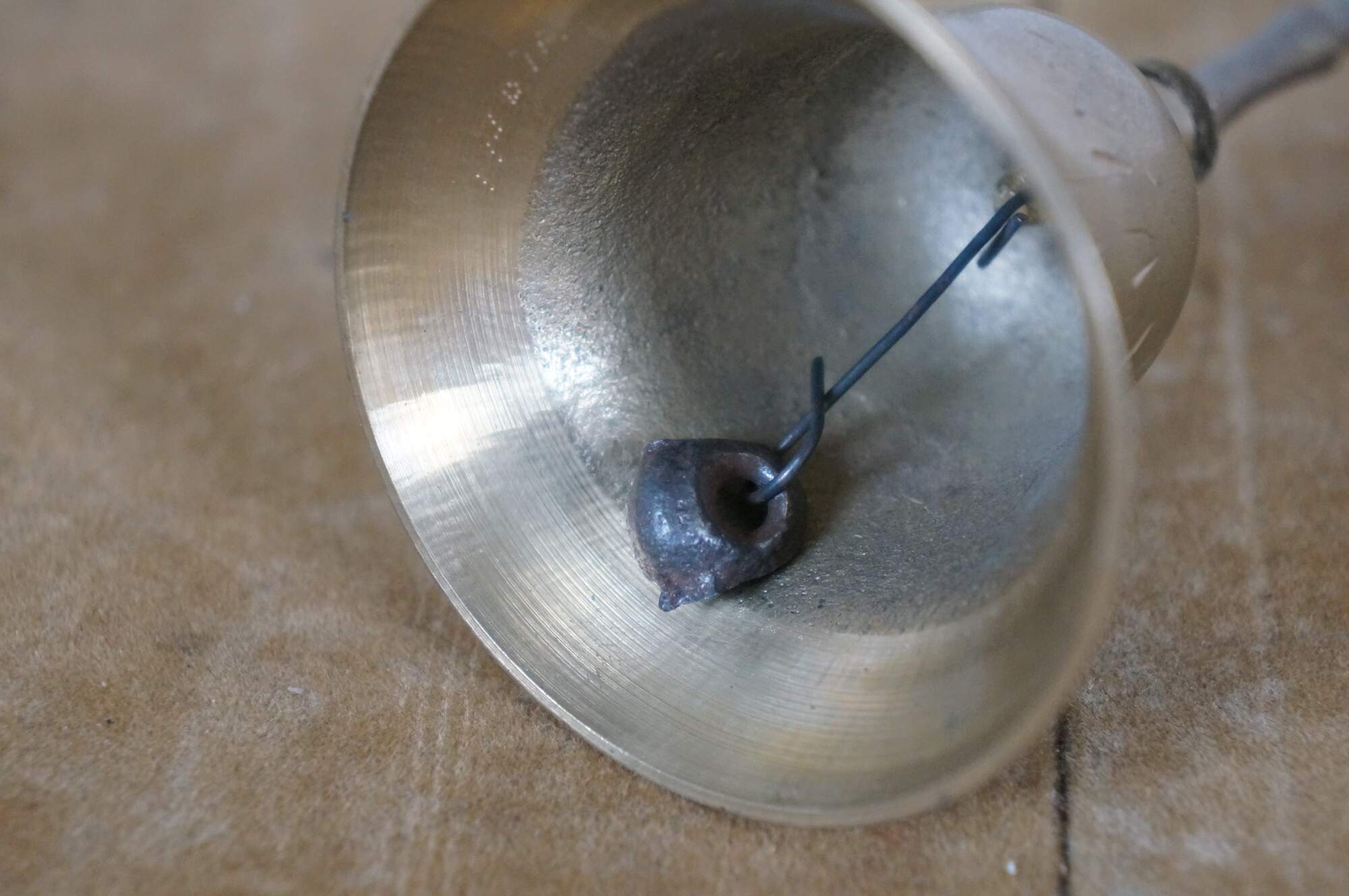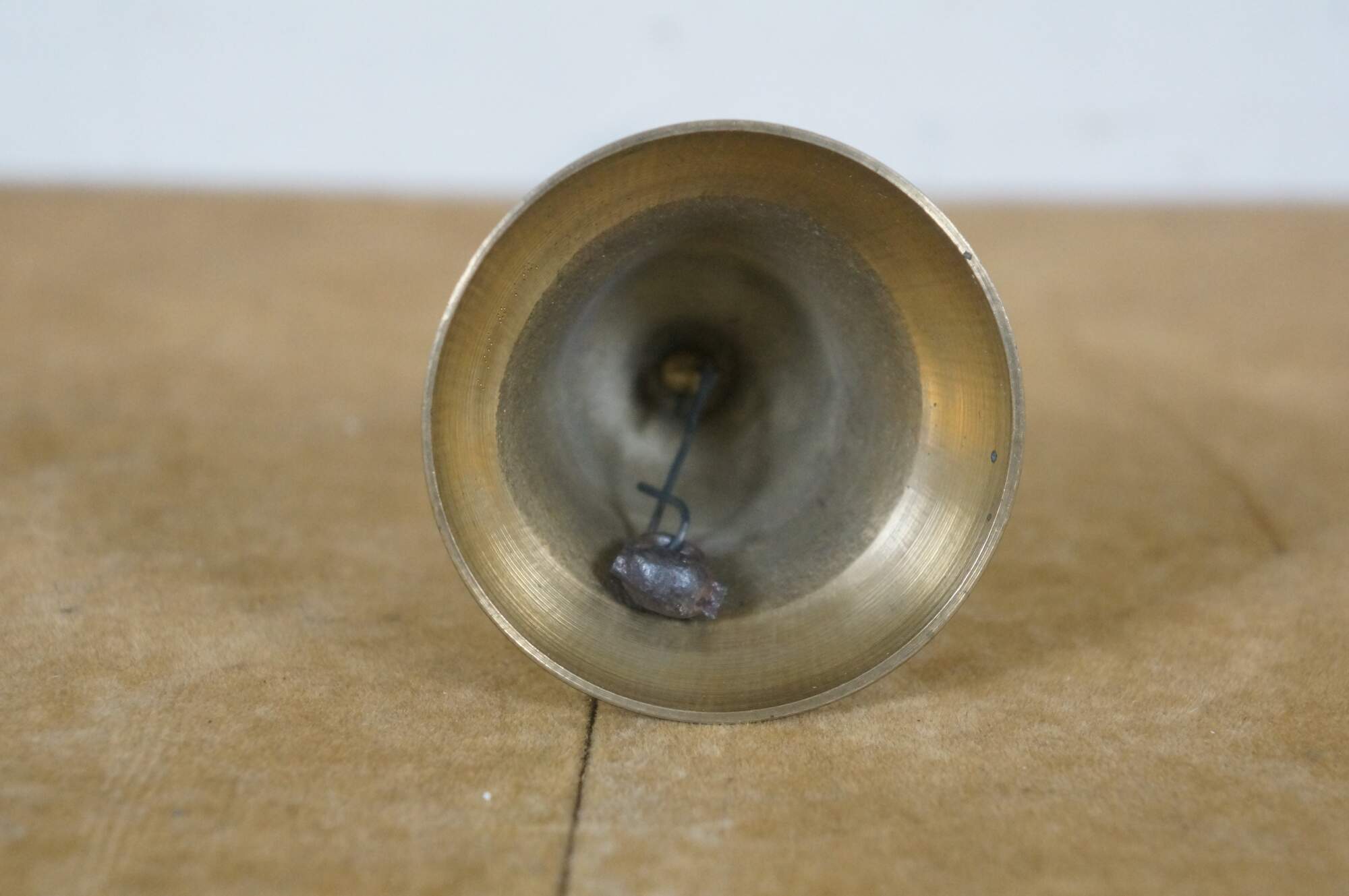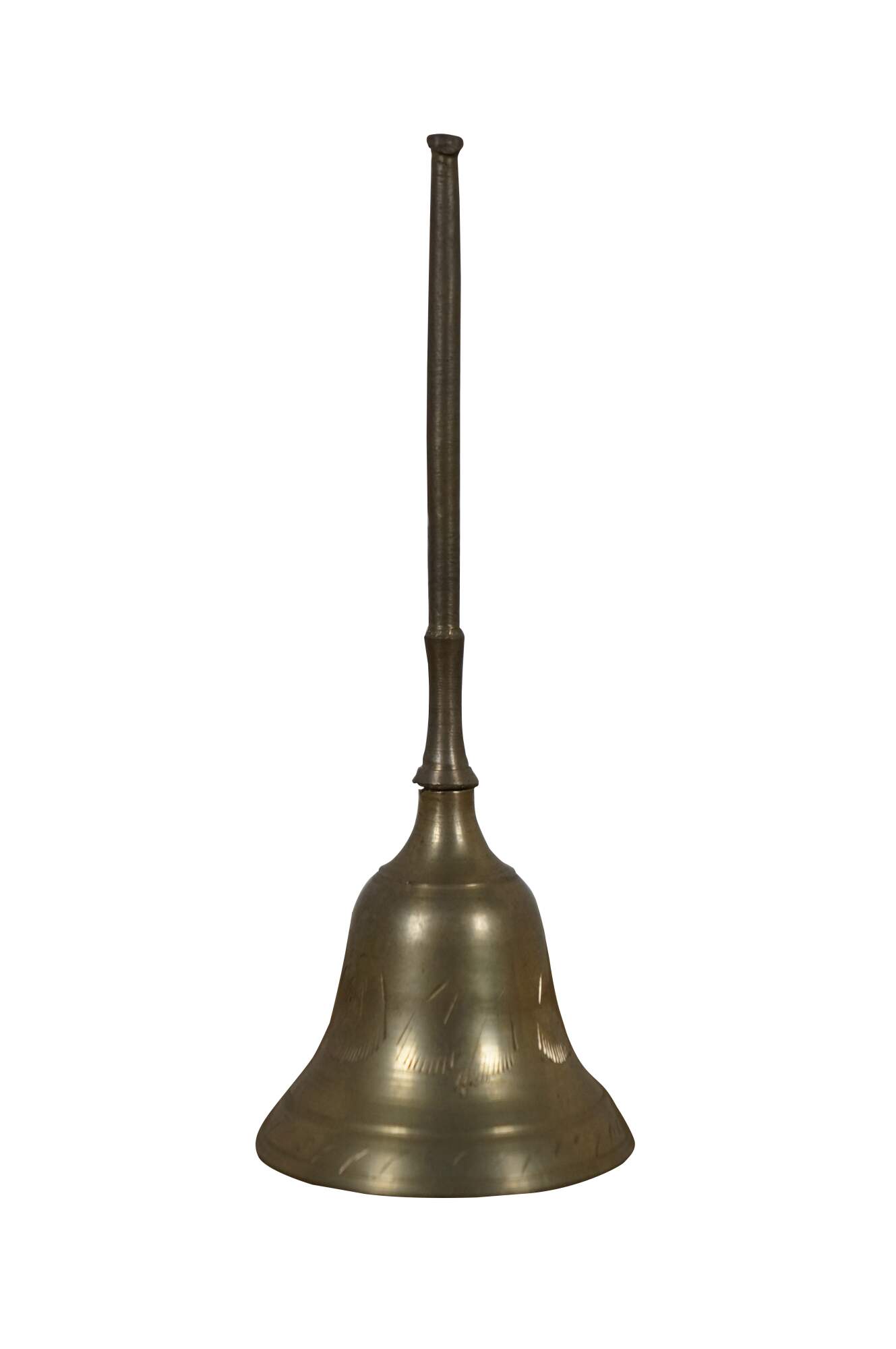 Vintage 20th-century brass hand bell with straight handle and lightly etched leaf design. Made in India.