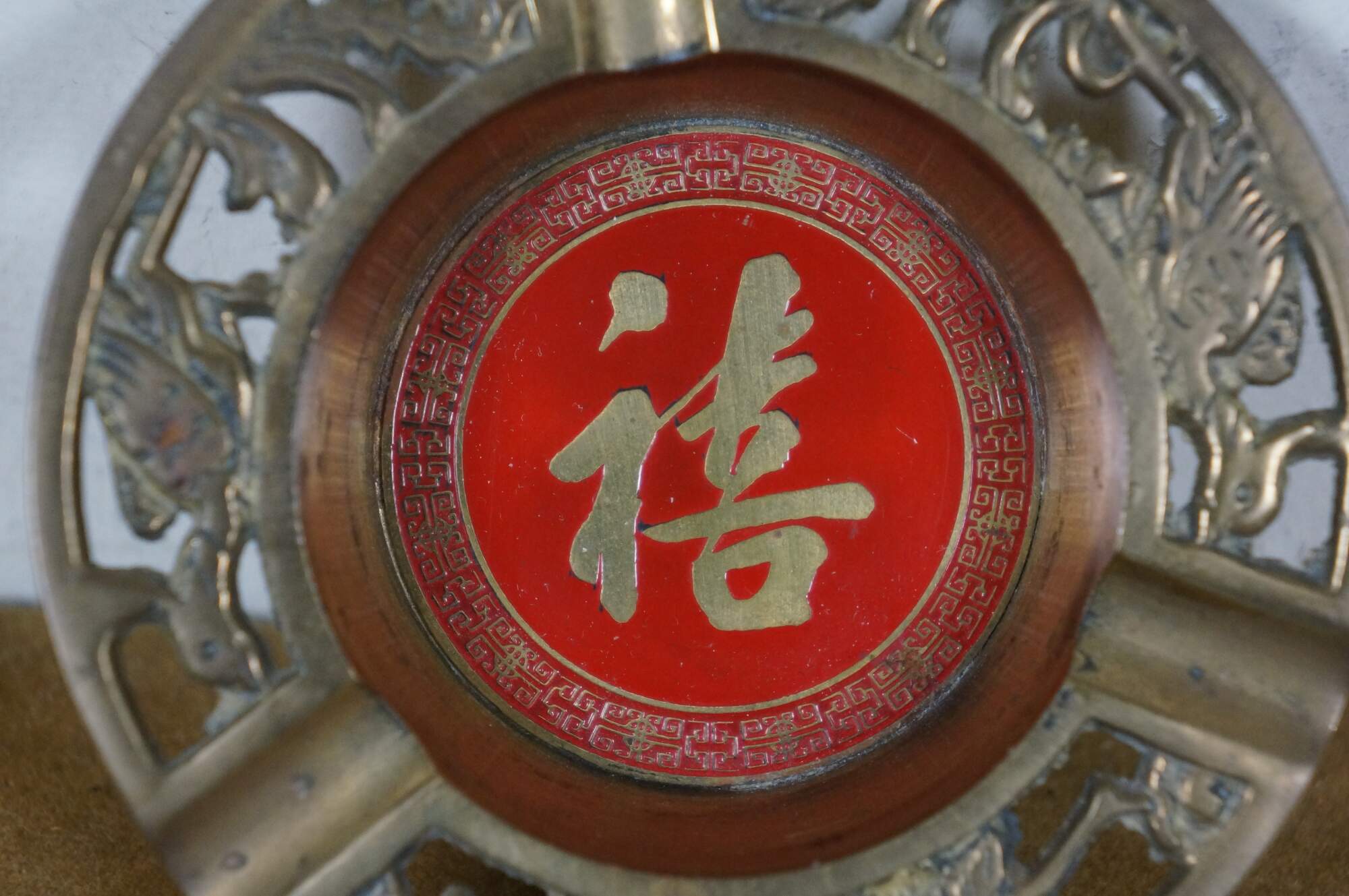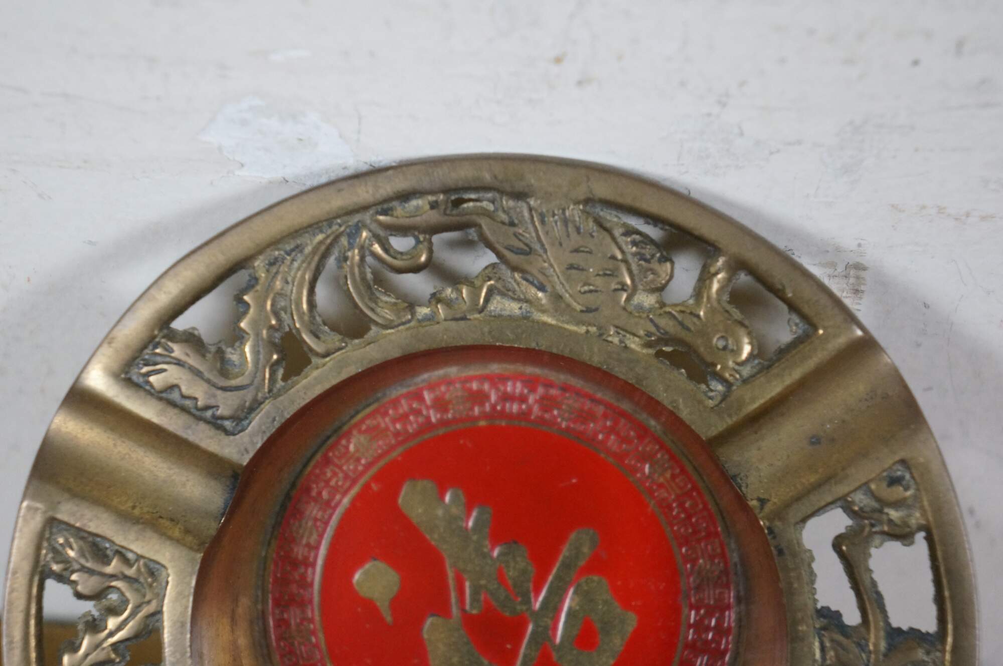 Pair of vintage 20th century Chinese / Asian personal sized brass ashtrays. Pierced edge decorated with flowers and phesants; red enameled center with gilt calligraphy. Three cigarette rests. Made in Taiwan.