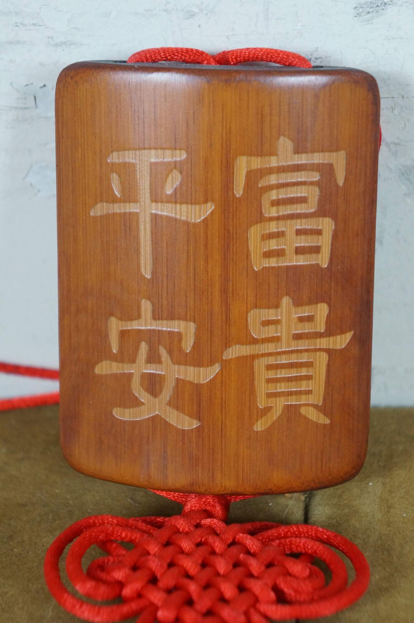 Vintage 20th century Chinese lucky wall hanging featuring a small carved bamboo panel suspended between two woven knots of red cord over a red tassel.
