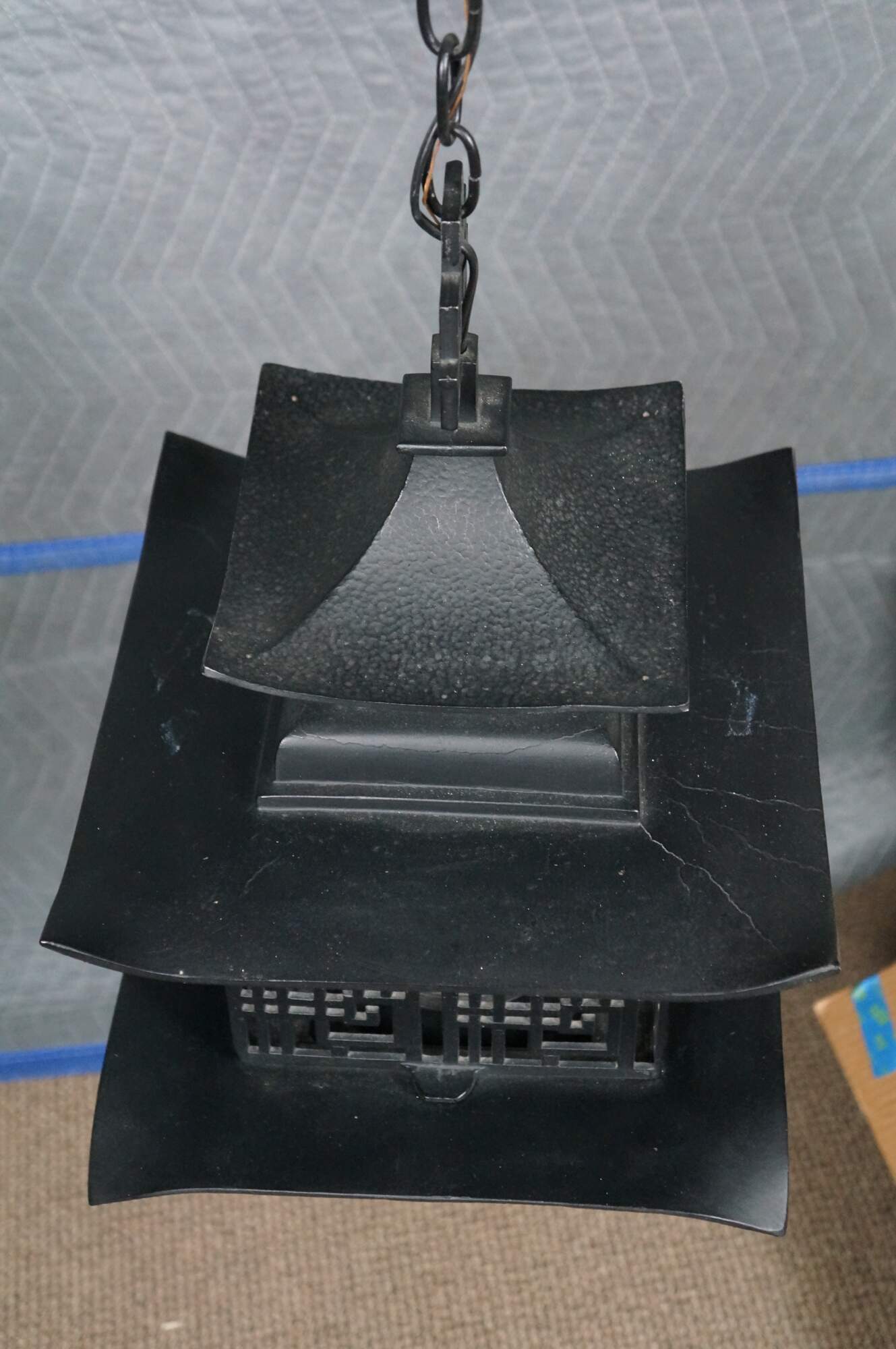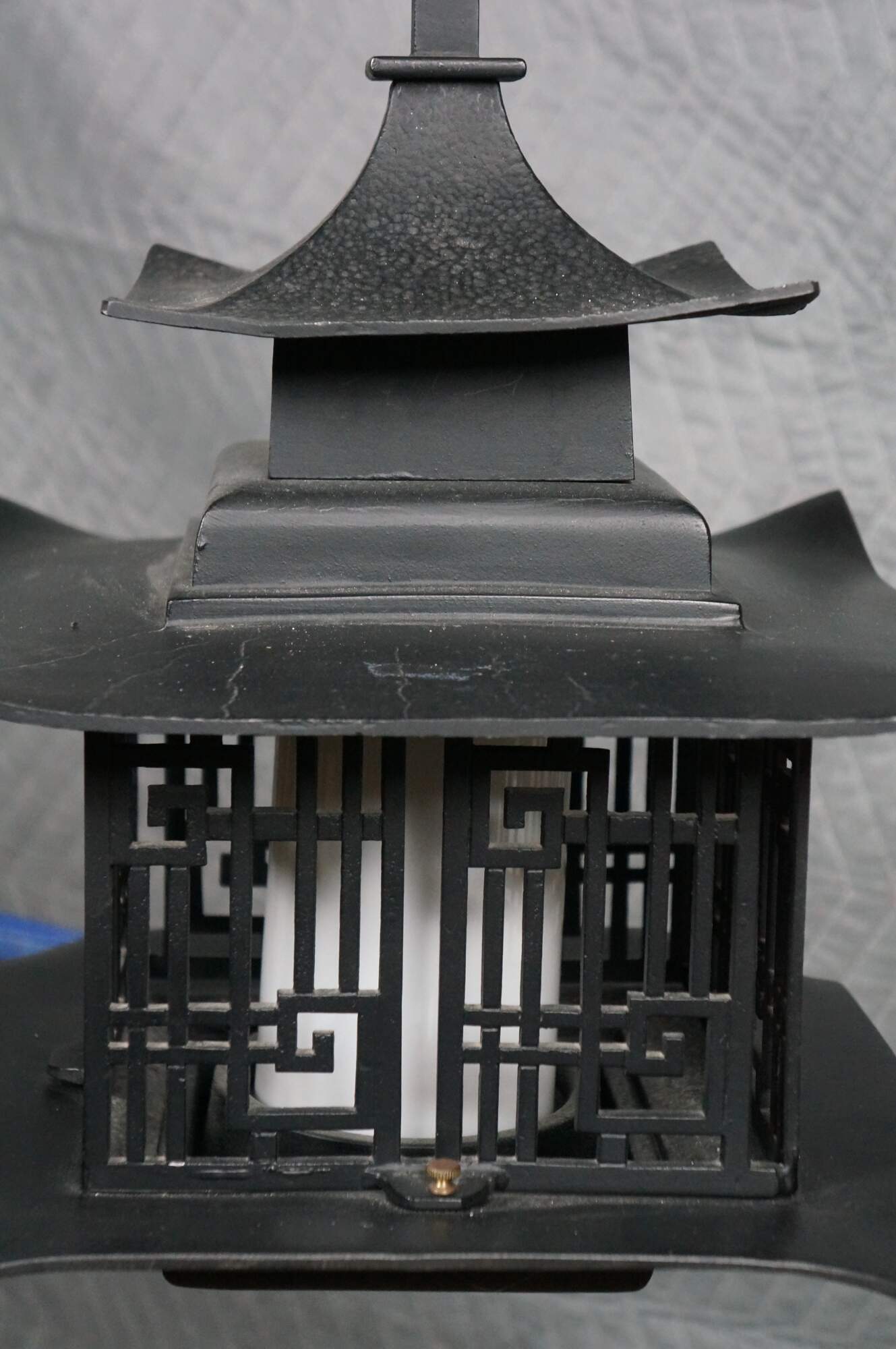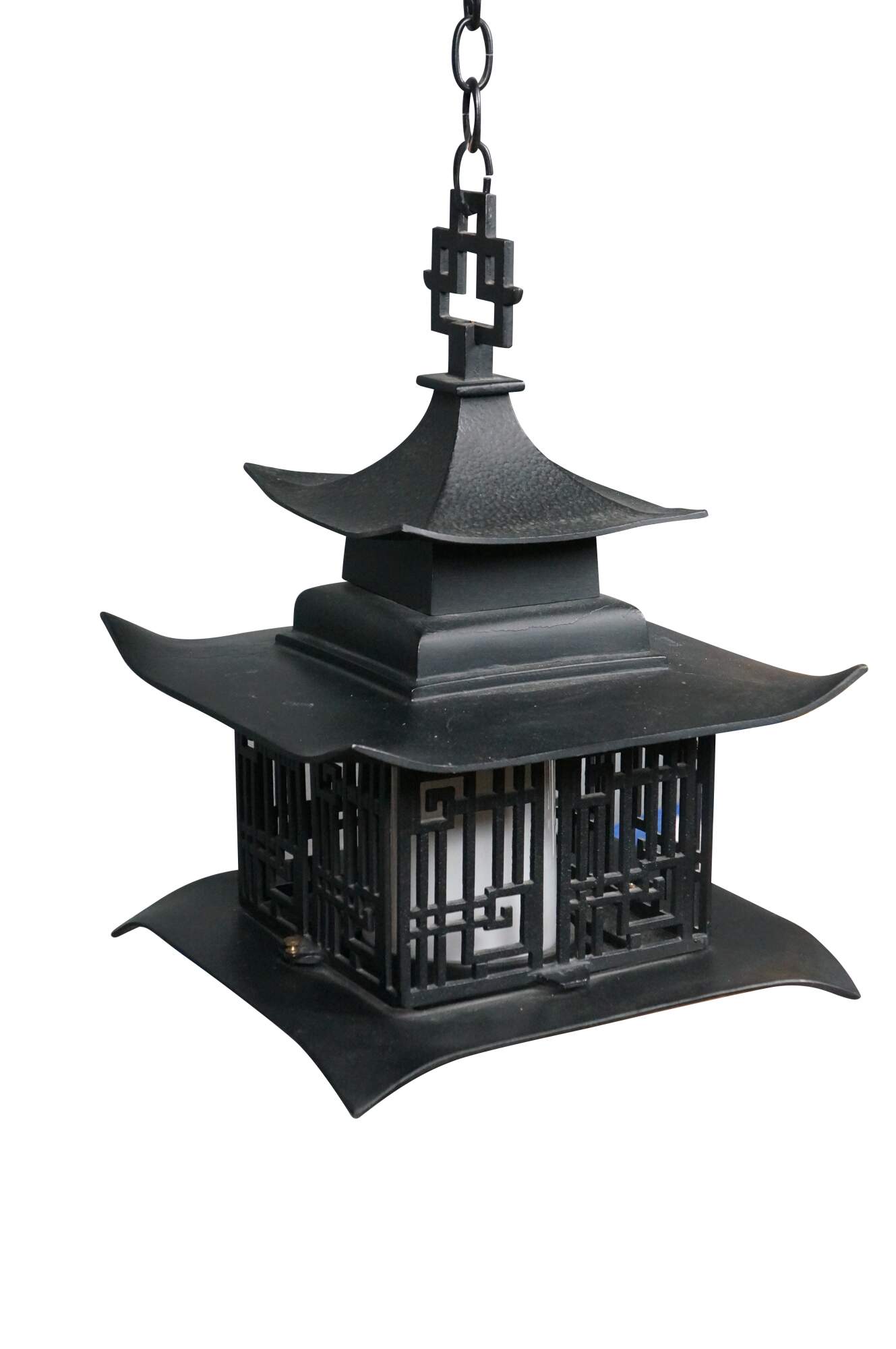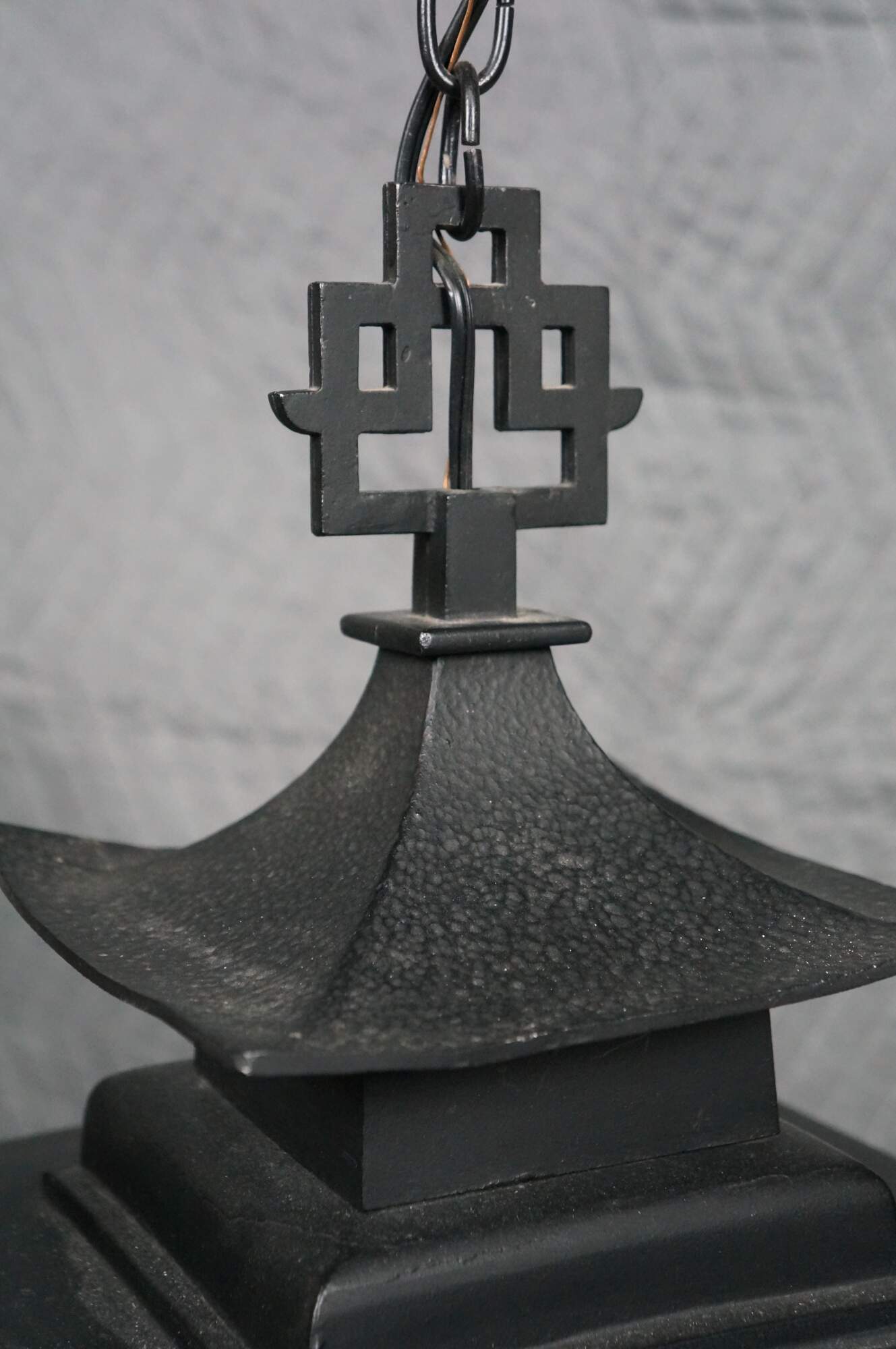 Circa 1960s black metal single light, hanging lantern/ pendant light. Pagoda-style lantern with a pierced chinoiserie cage around a white glass hurricane shade.