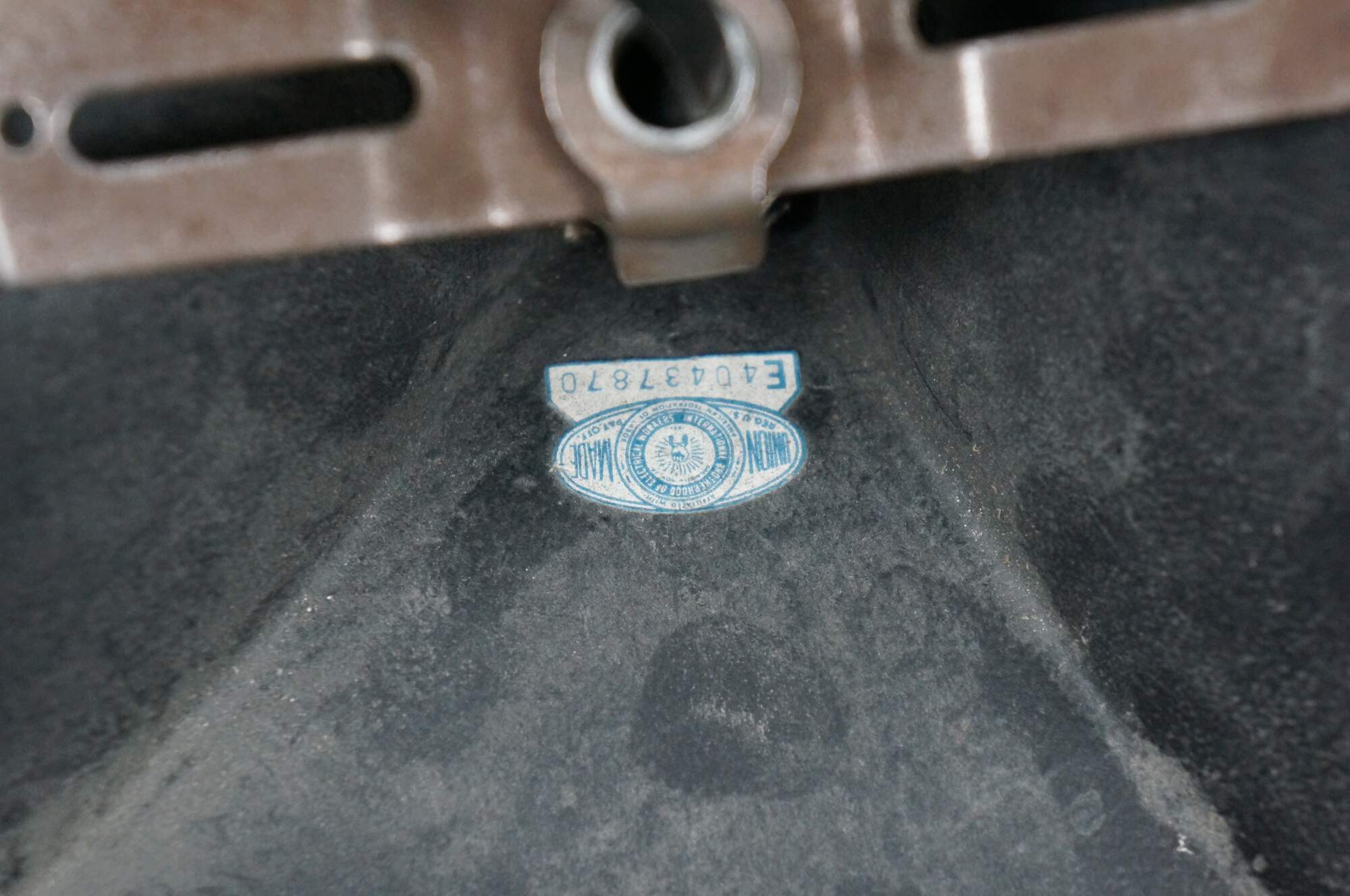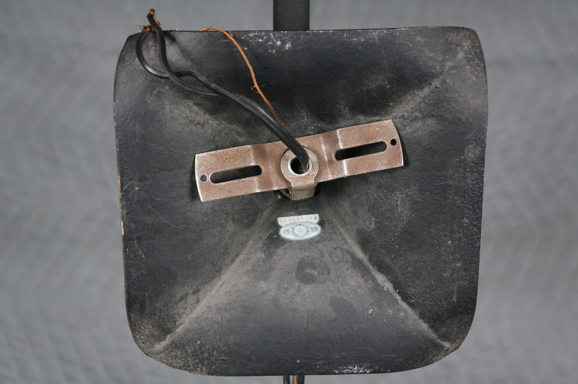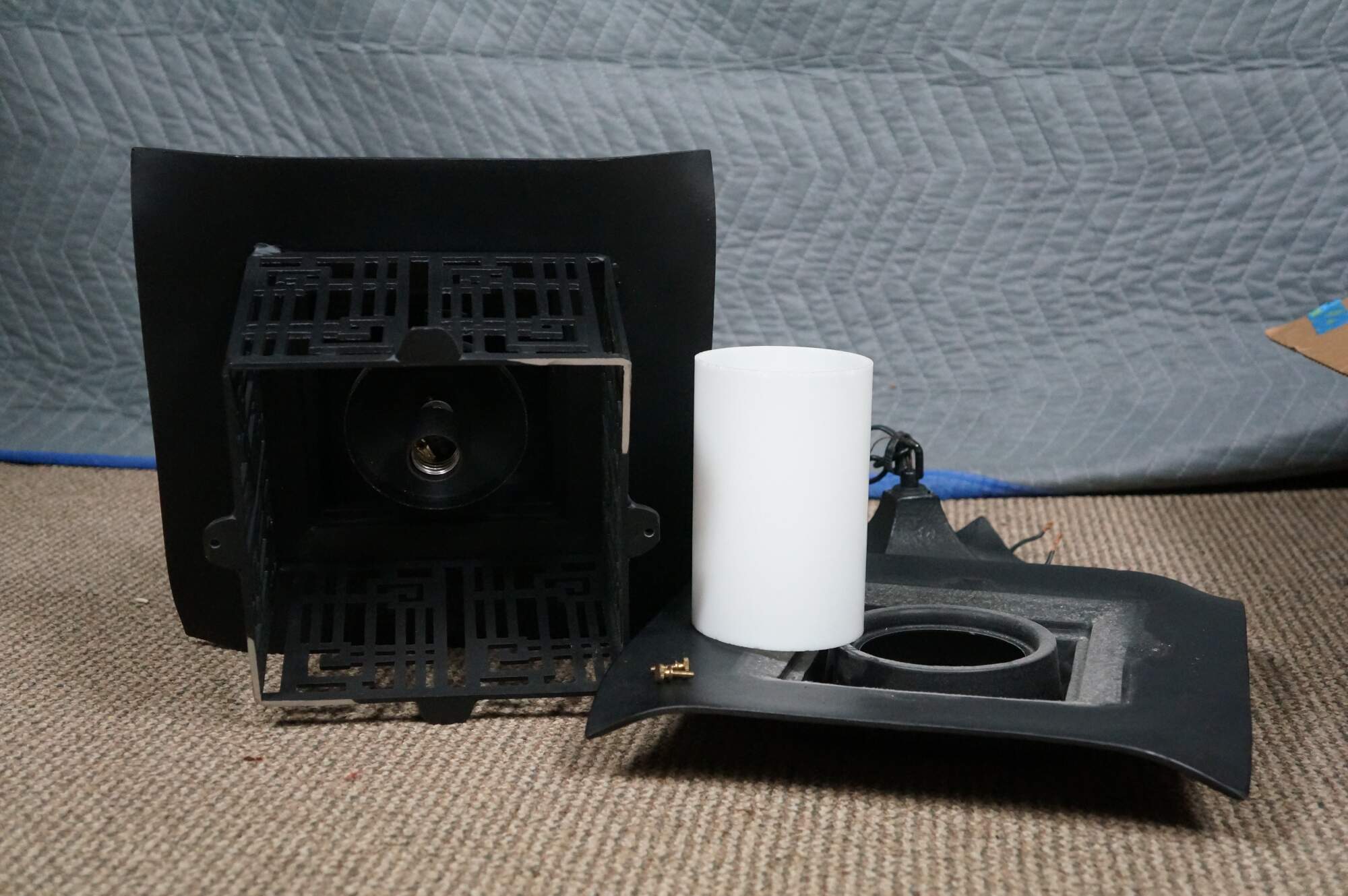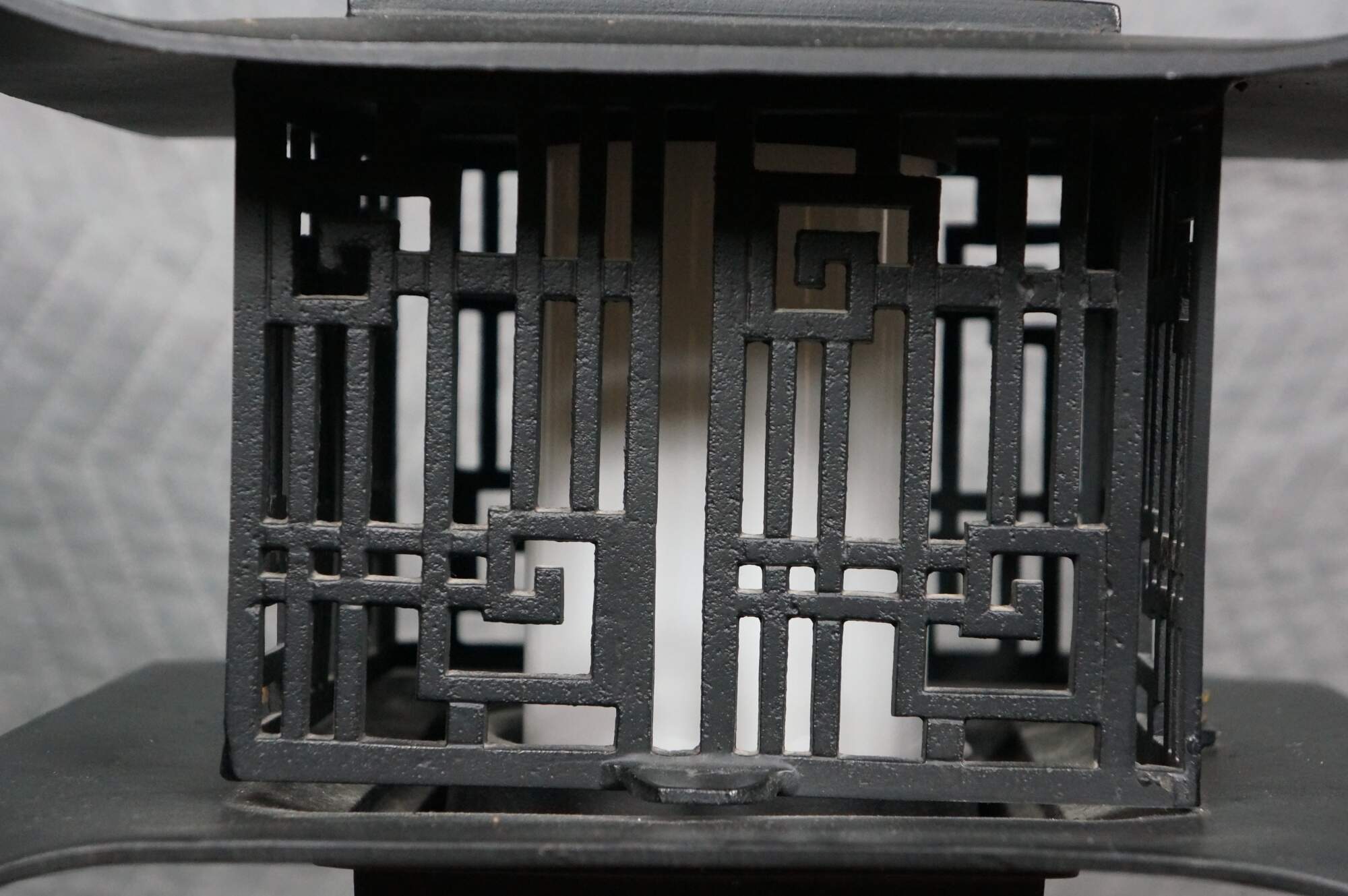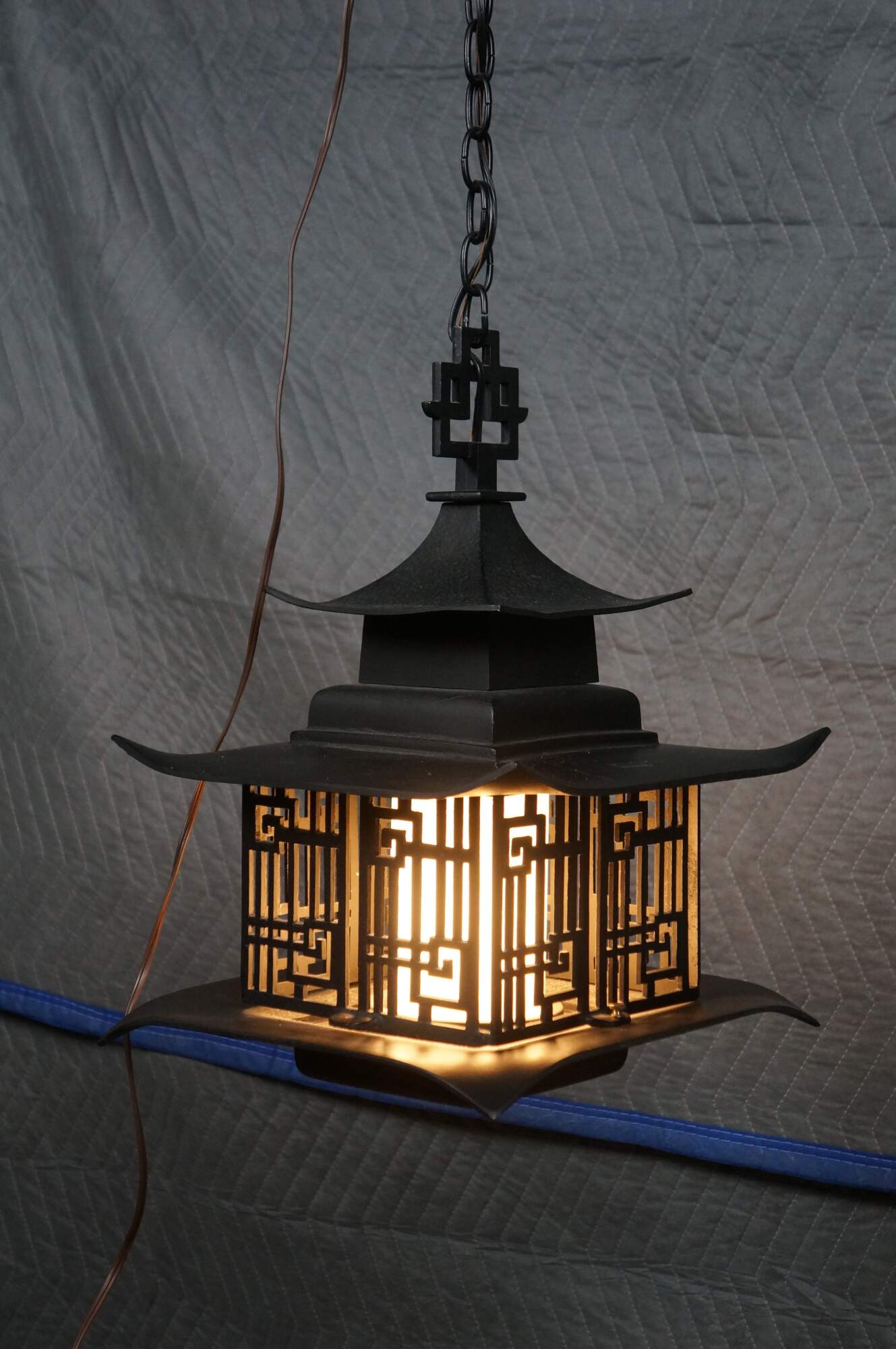 Circa 1960s black metal single light, hanging lantern/ pendant light. Pagoda-style lantern with a pierced chinoiserie cage around a white glass hurricane shade.