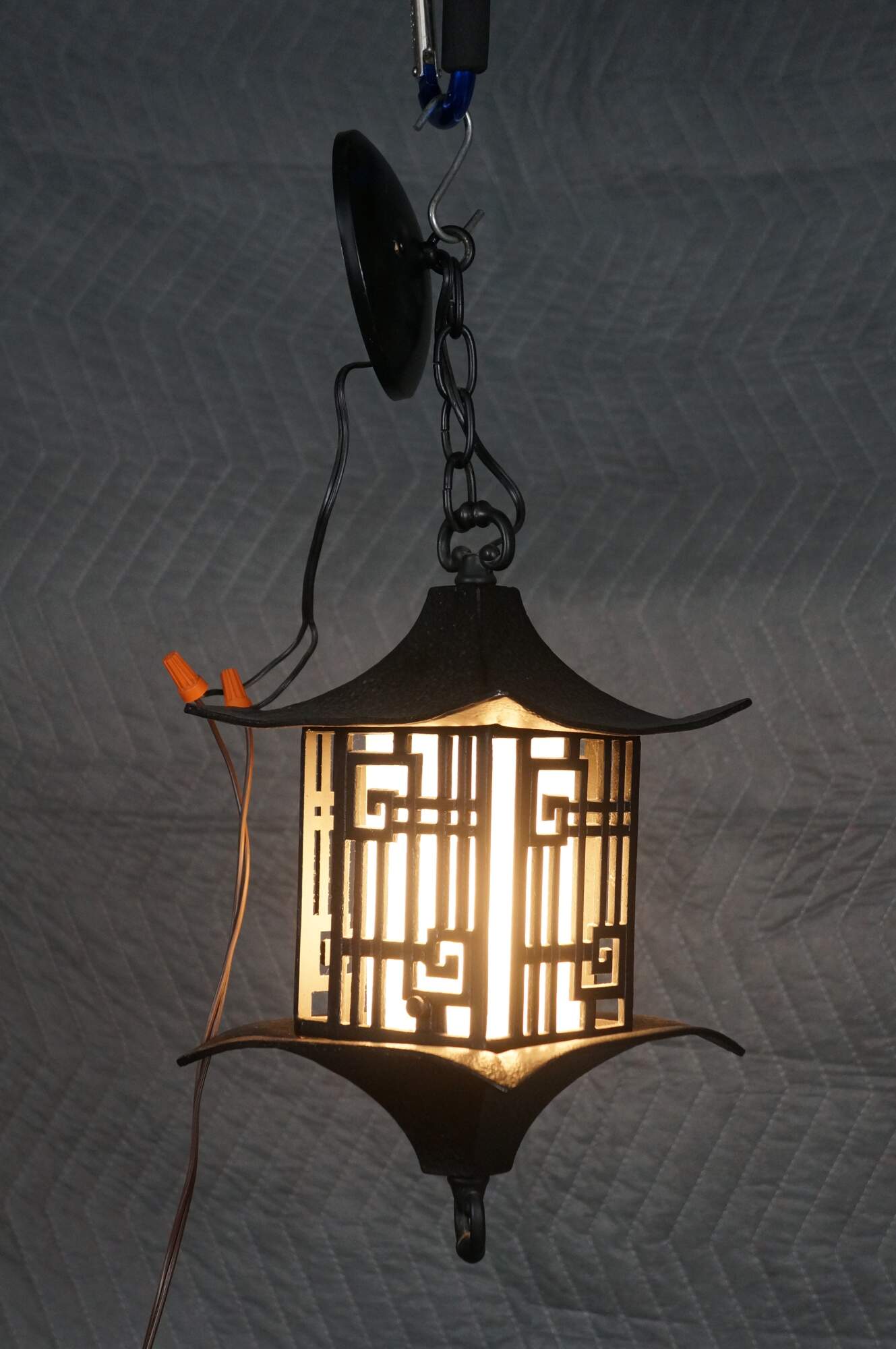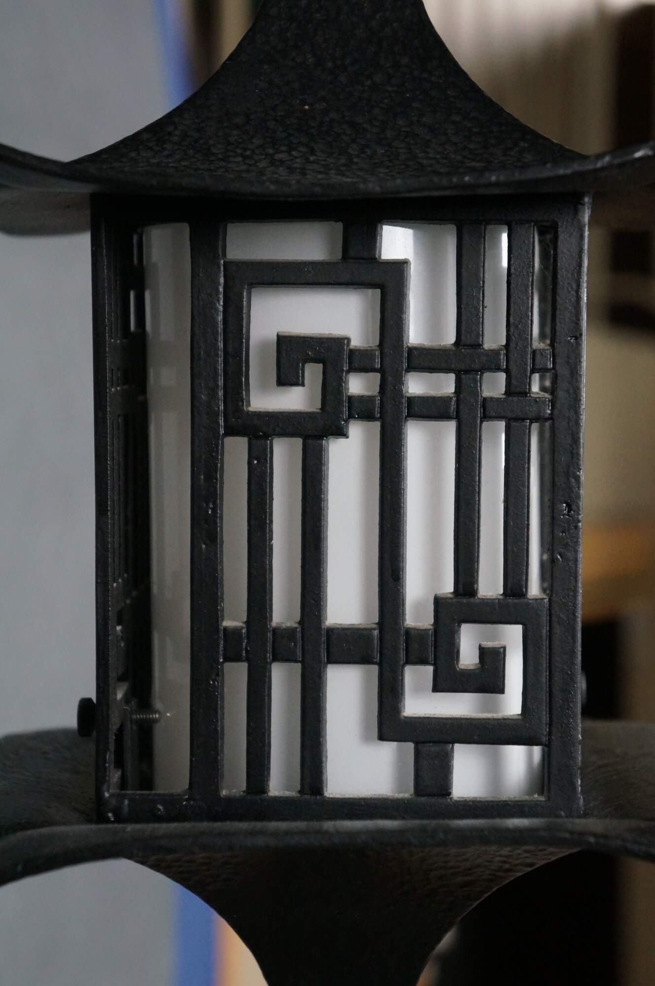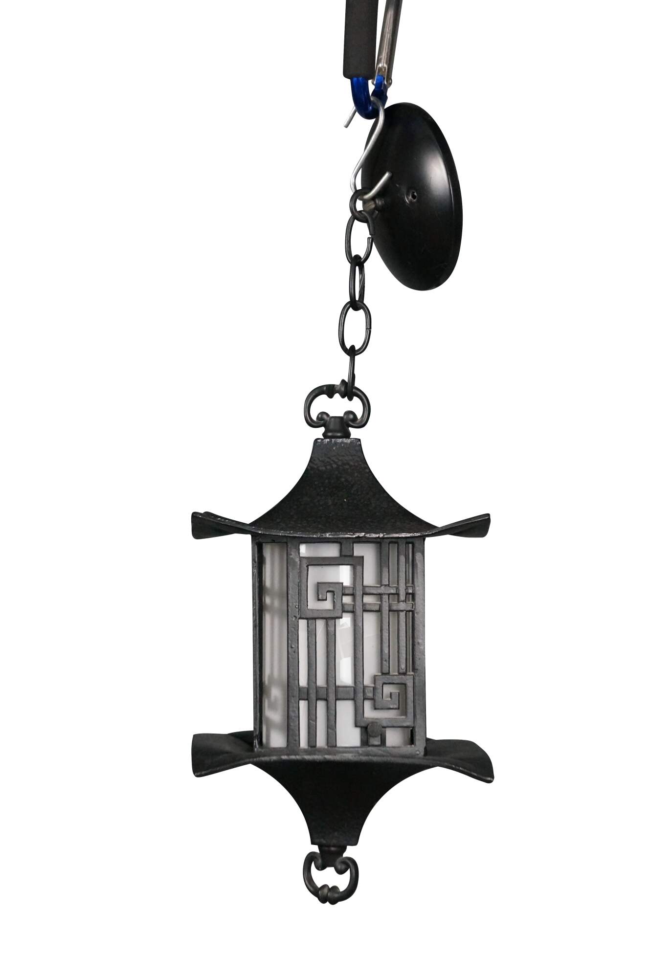 Circa mid 20th century black metal single light hanging lantern / pendant light. Pagoda style lantern with a pierced chinoiserie cage around a white glass hurricane shade.