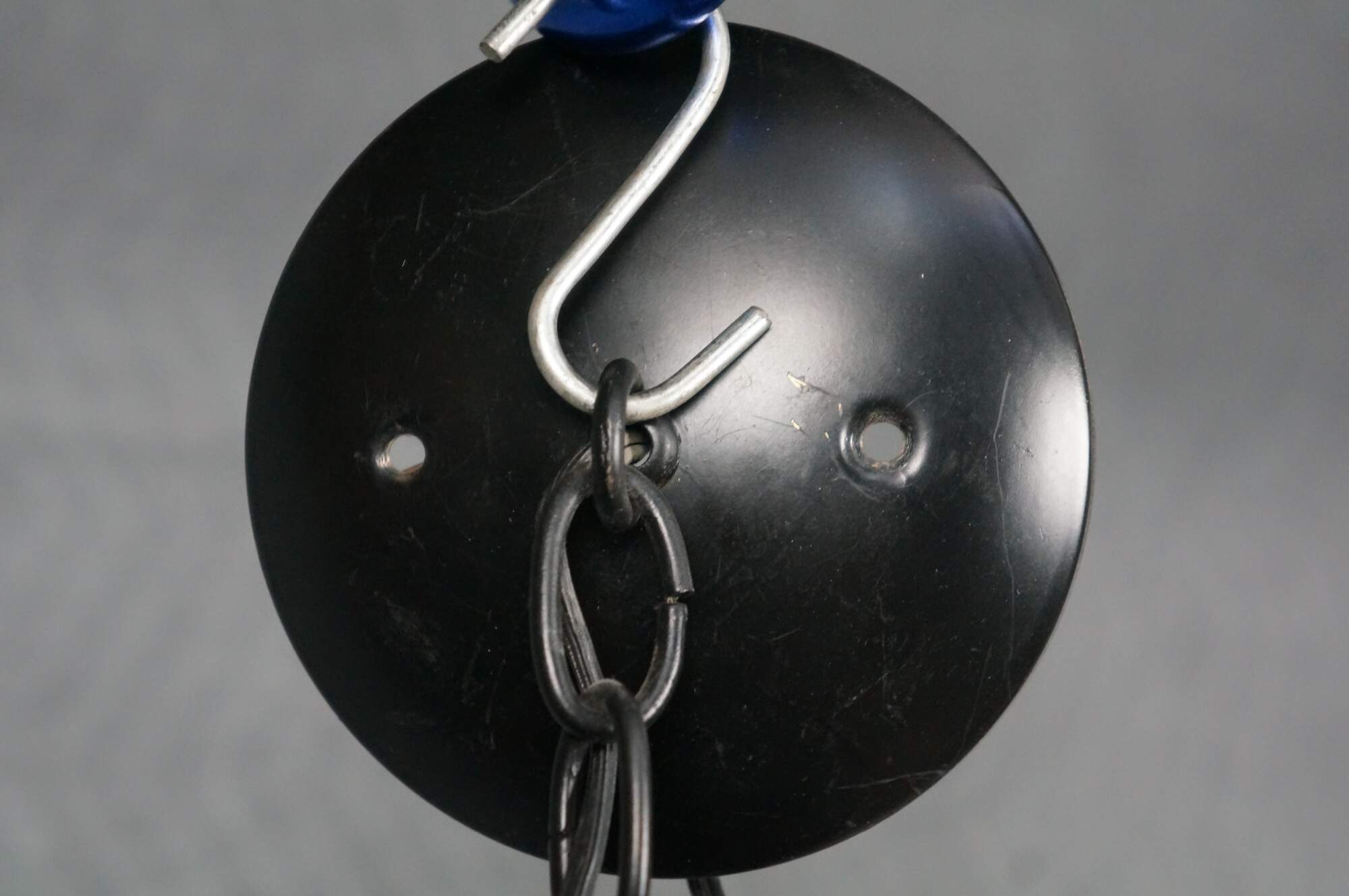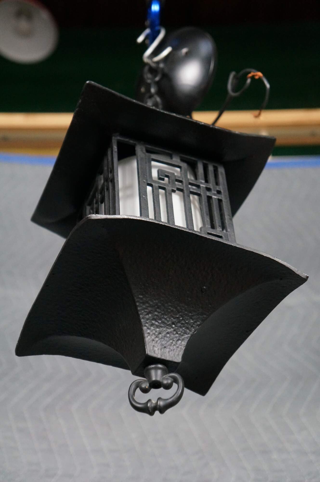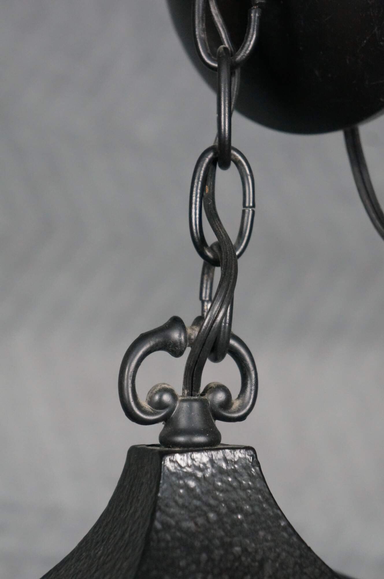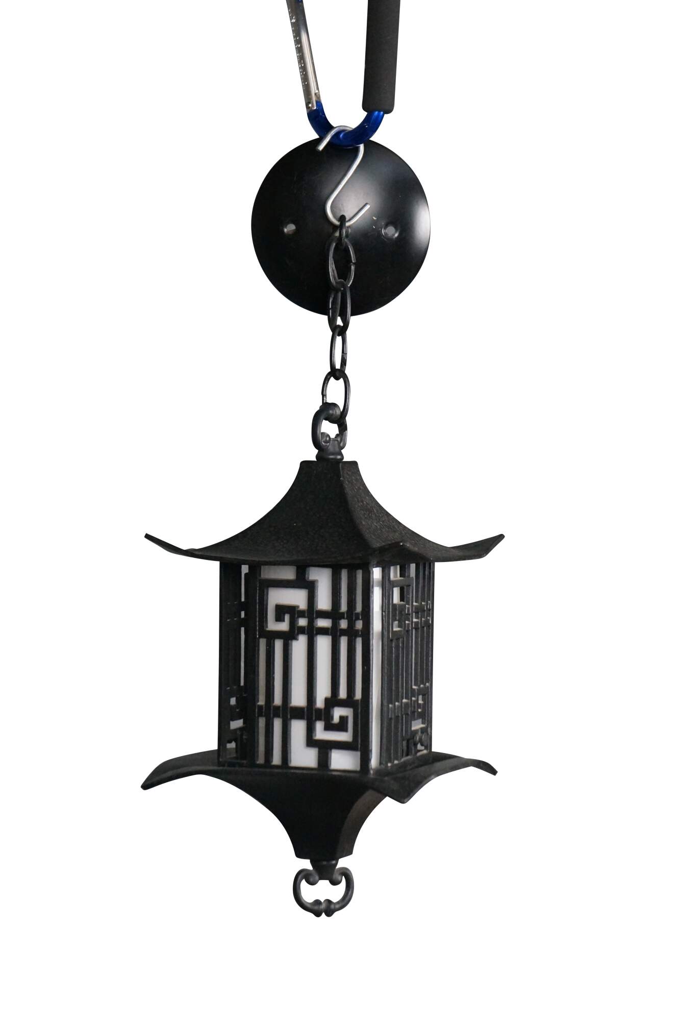 Circa mid 20th century black metal single light hanging lantern / pendant light. Pagoda style lantern with a pierced chinoiserie cage around a white glass hurricane shade.