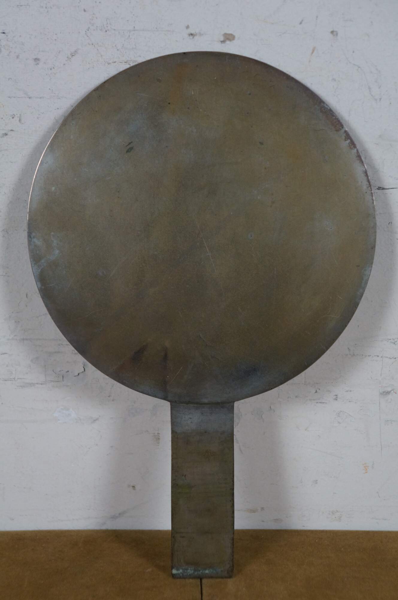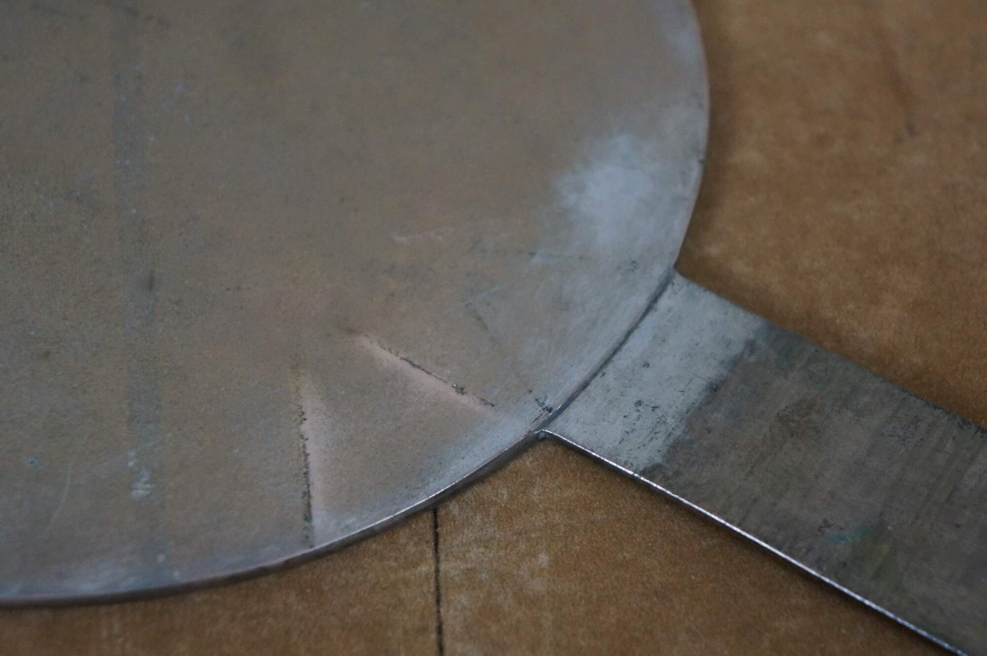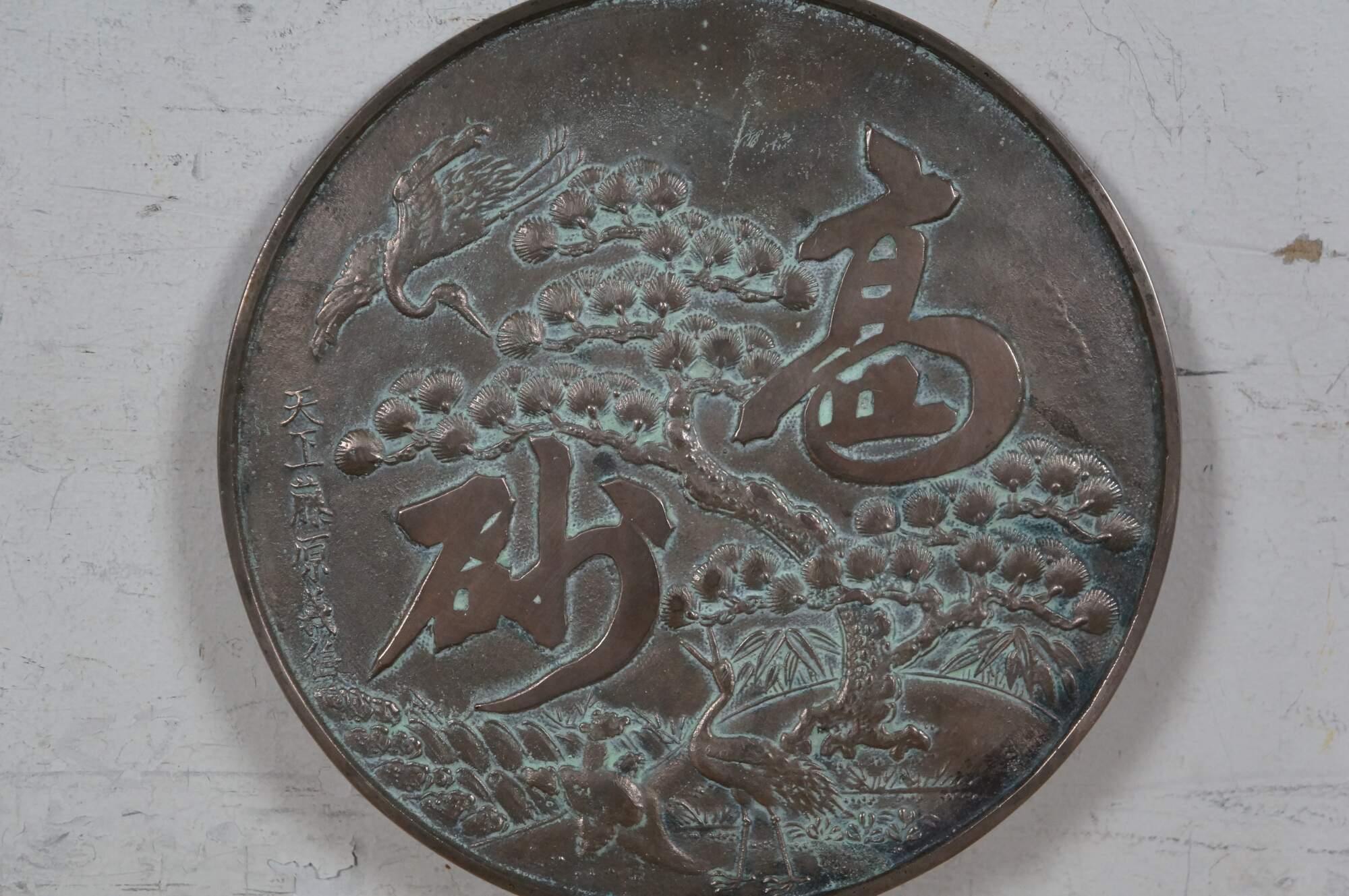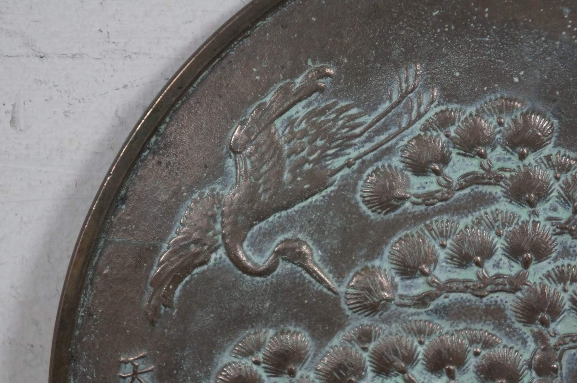 Antique Japanese Edo Period bronze kagami / hand mirror. Cast with a design featuring two large pieces of calligraphy over a landscape showing a pair of cranes by a gnarled pine tree. Writing along the left-hand side. No wrapping on the handle.