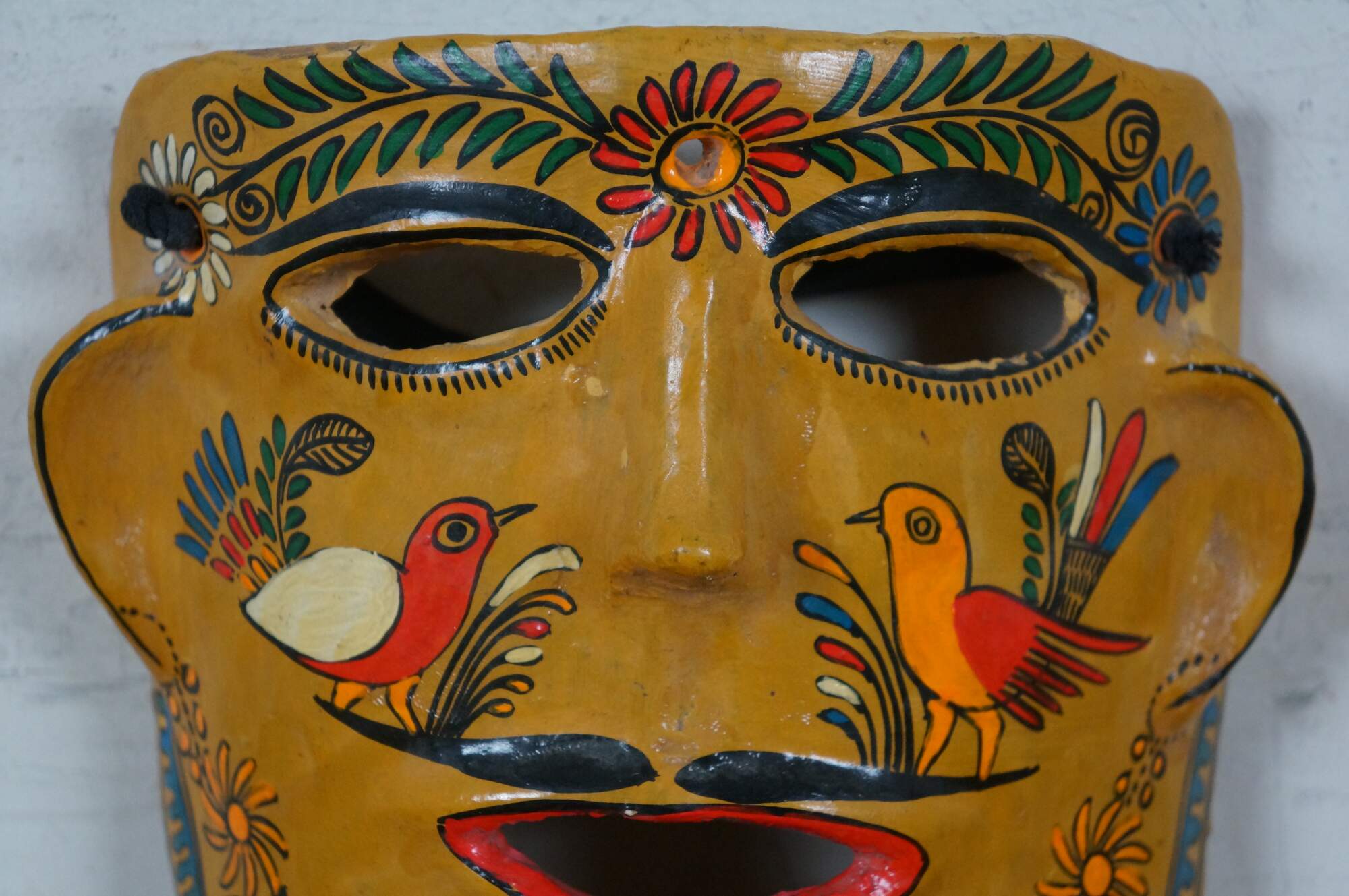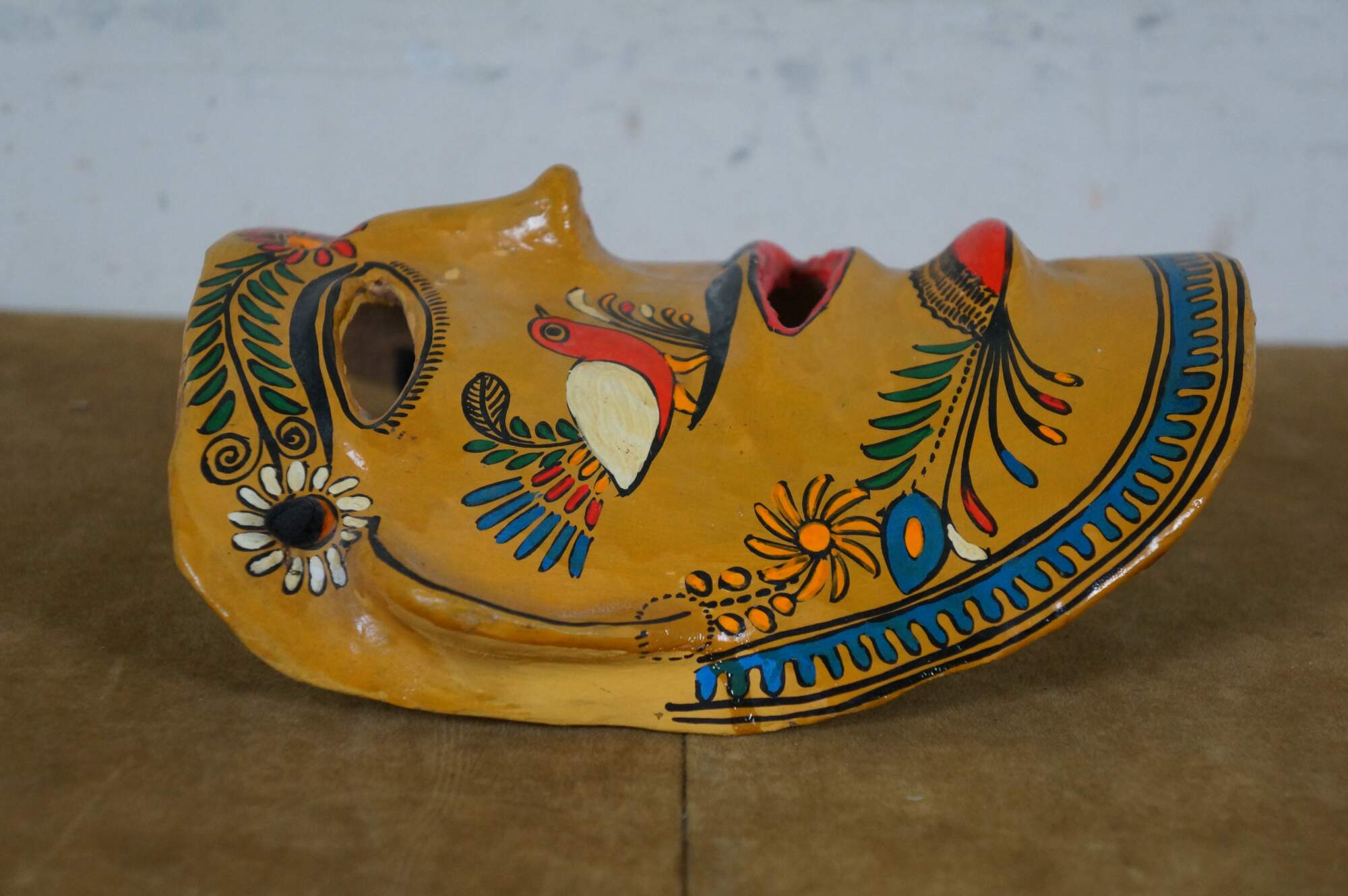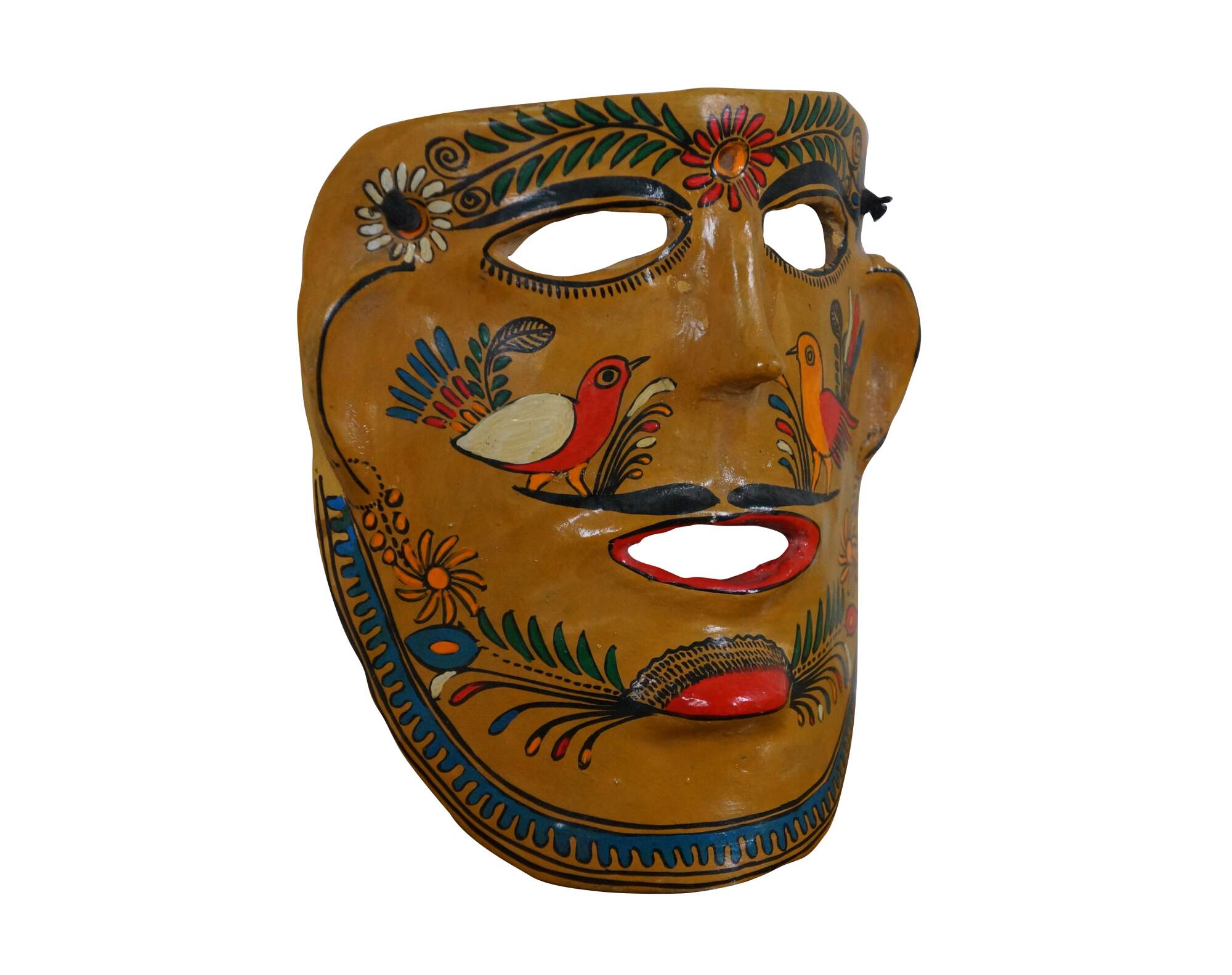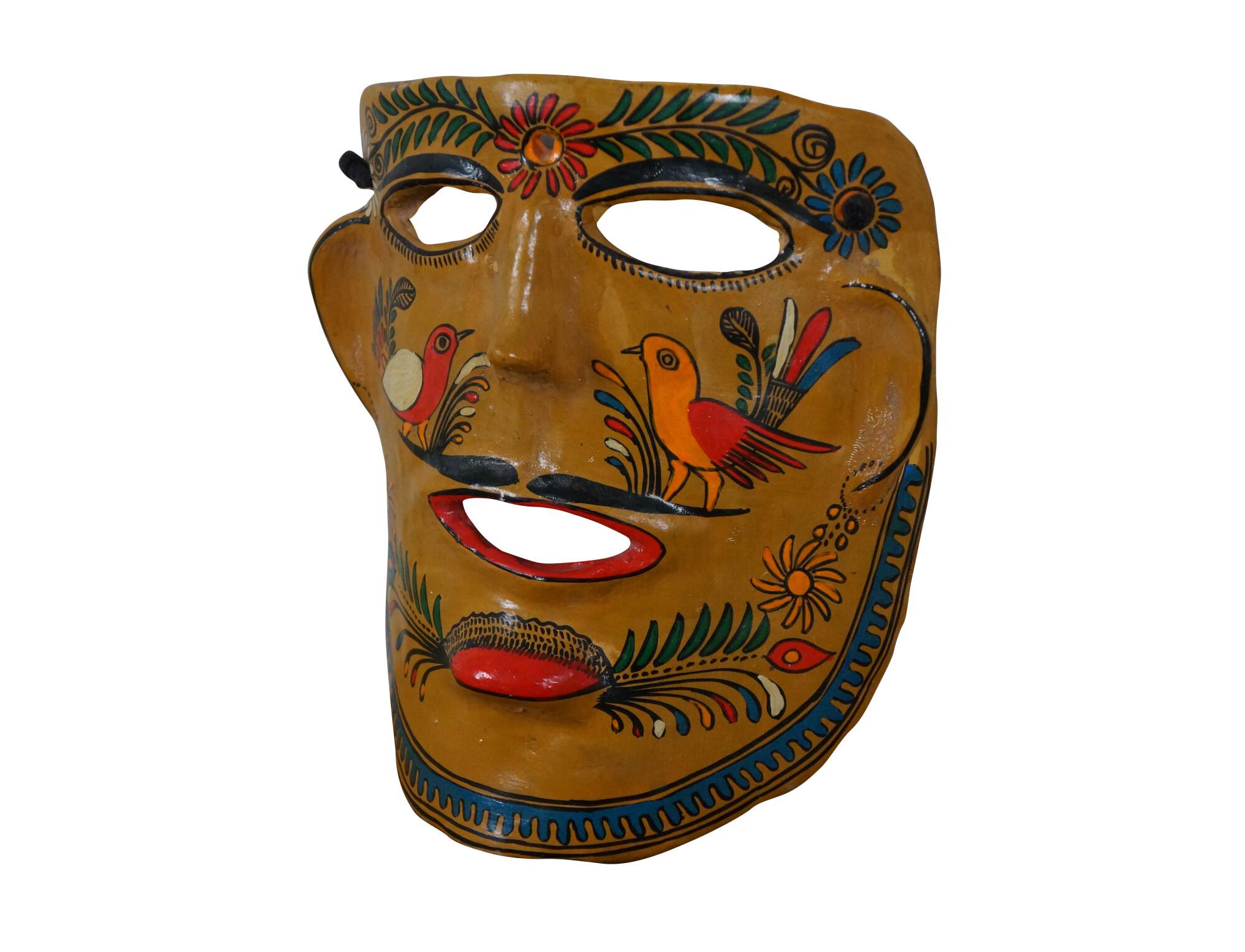 Vintage 20th century Mexican folk art pottery clay mask, hand painted masculine in mustard yellow with mustche and goatee, decorated with sprigs of flowers and a pair of brightly colored birds.