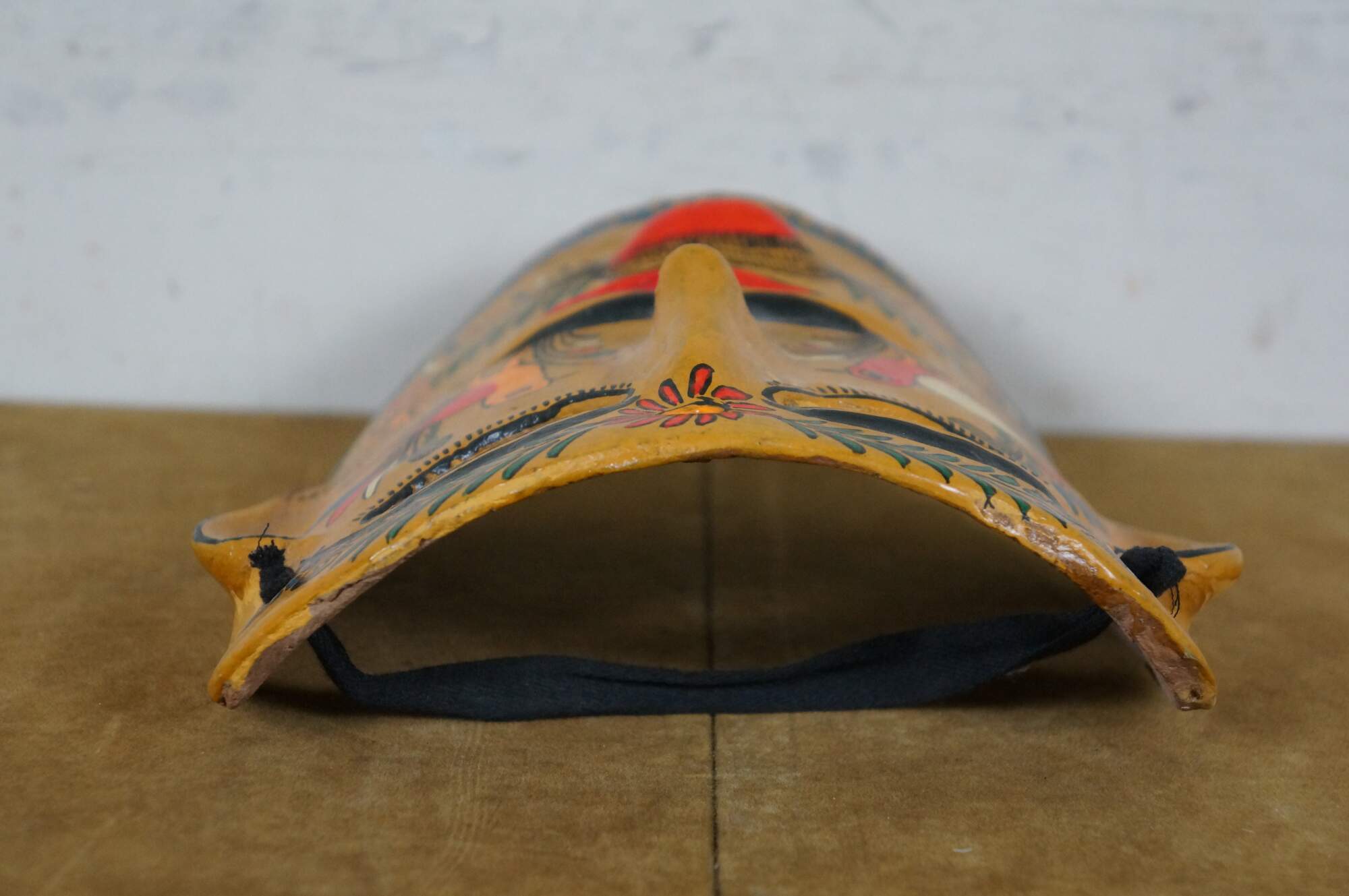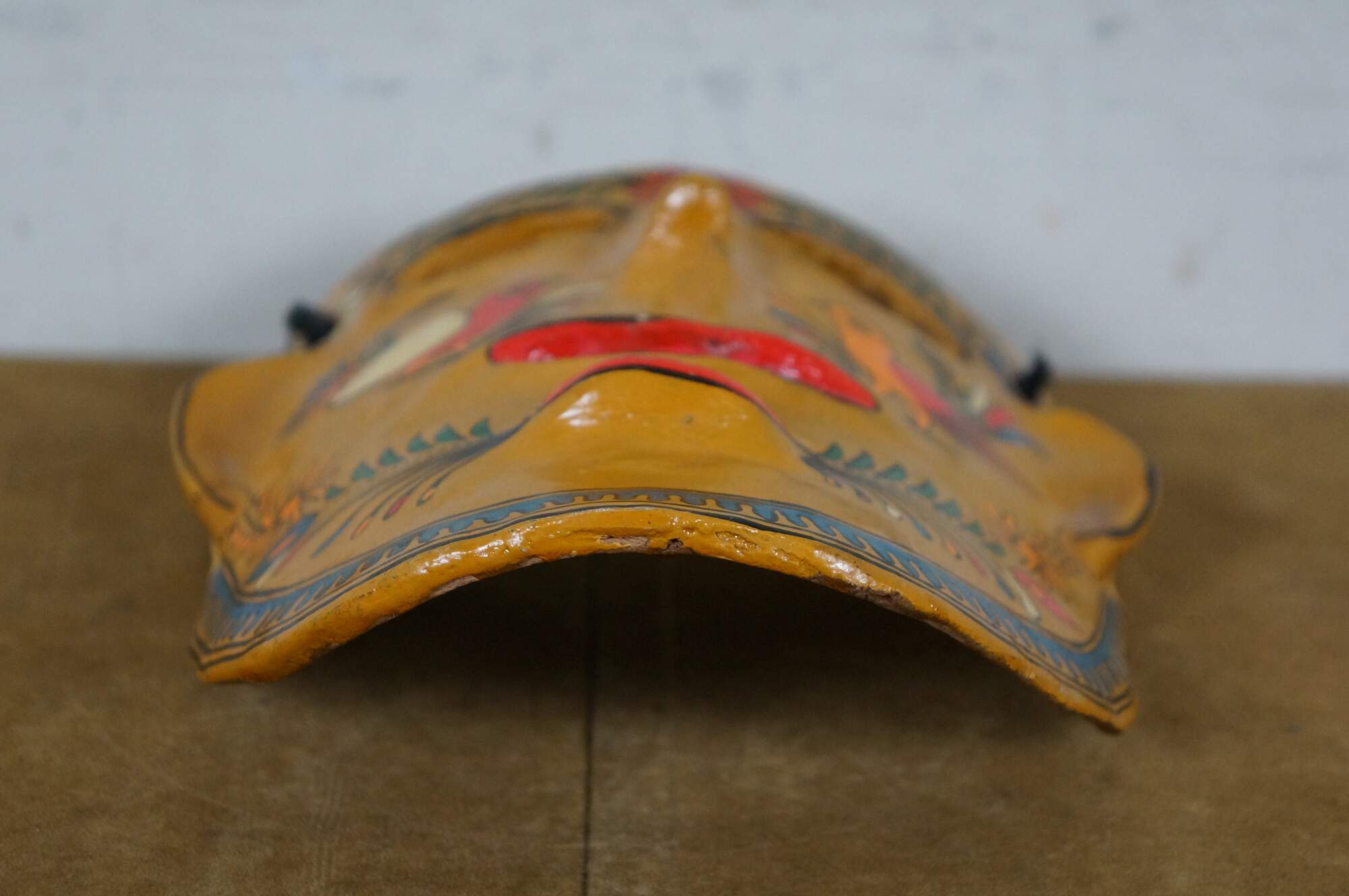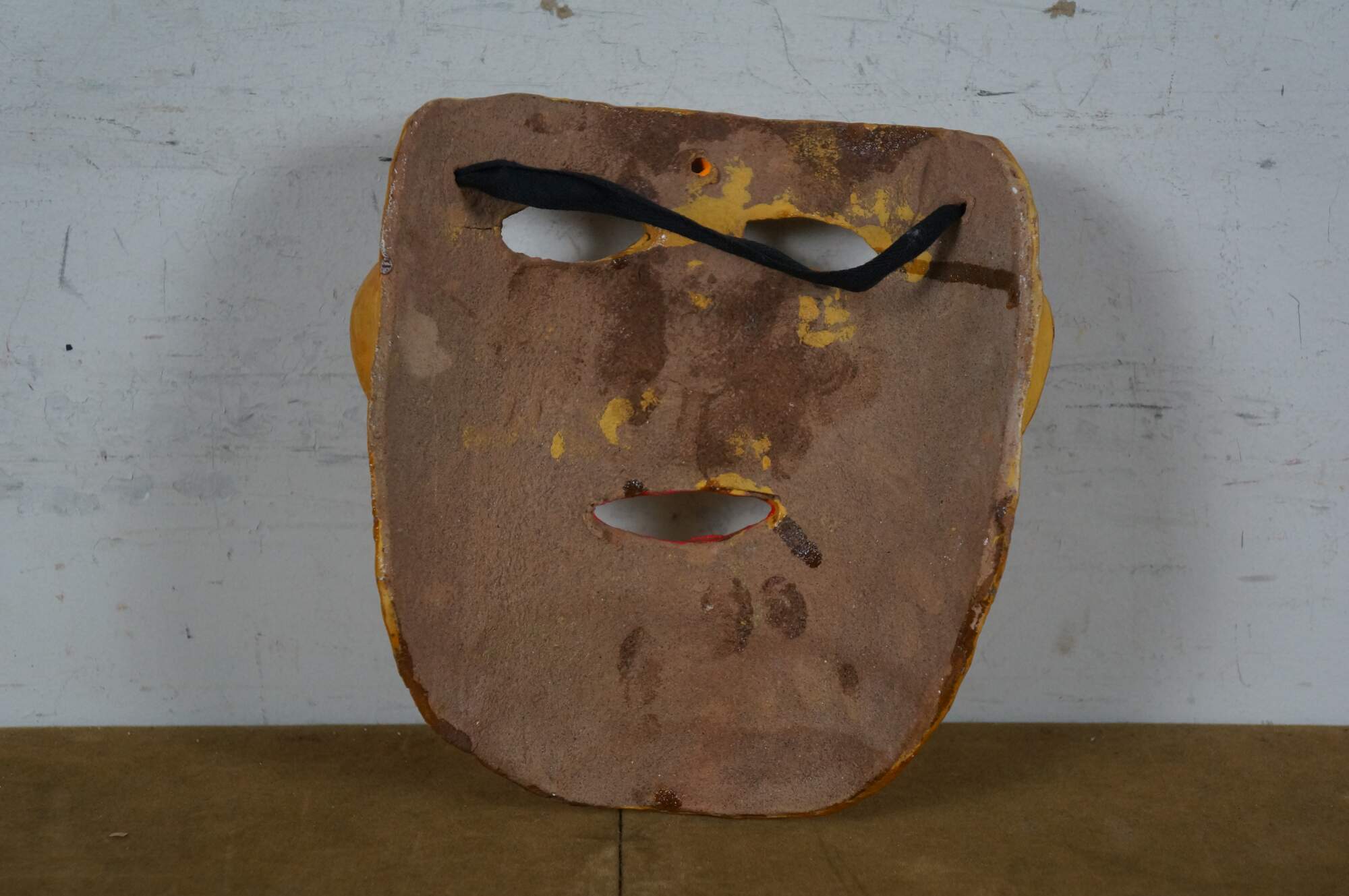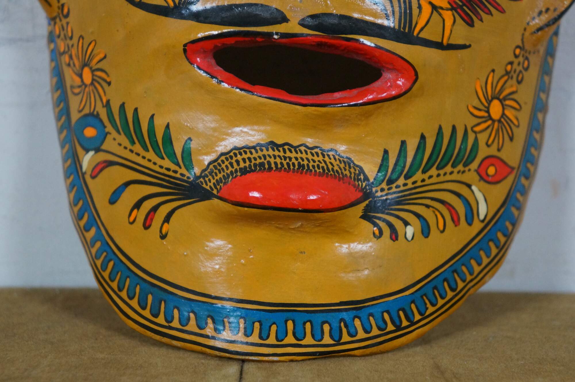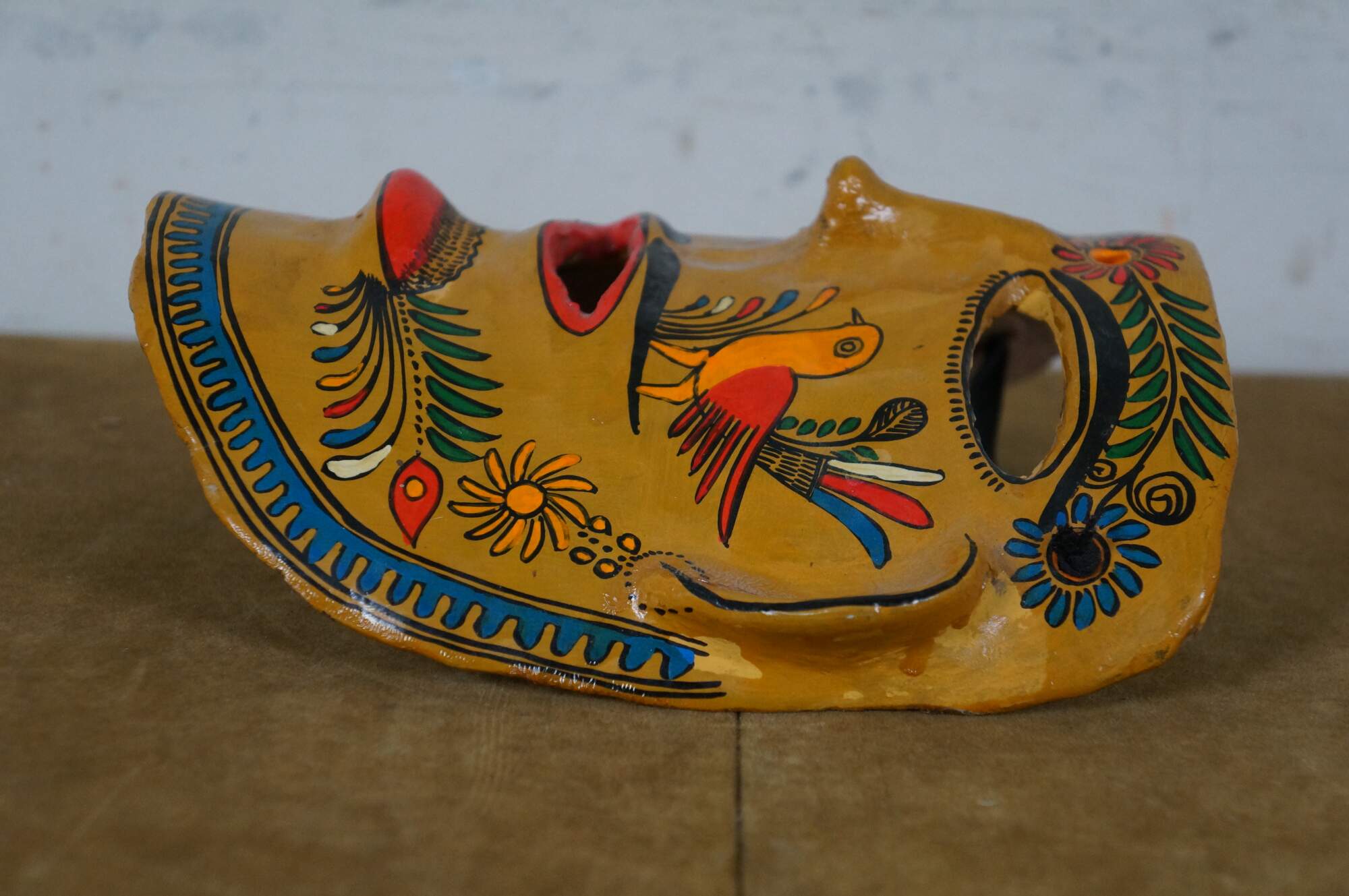 Vintage 20th century Mexican folk art pottery clay mask, hand painted masculine in mustard yellow with mustche and goatee, decorated with sprigs of flowers and a pair of brightly colored birds.