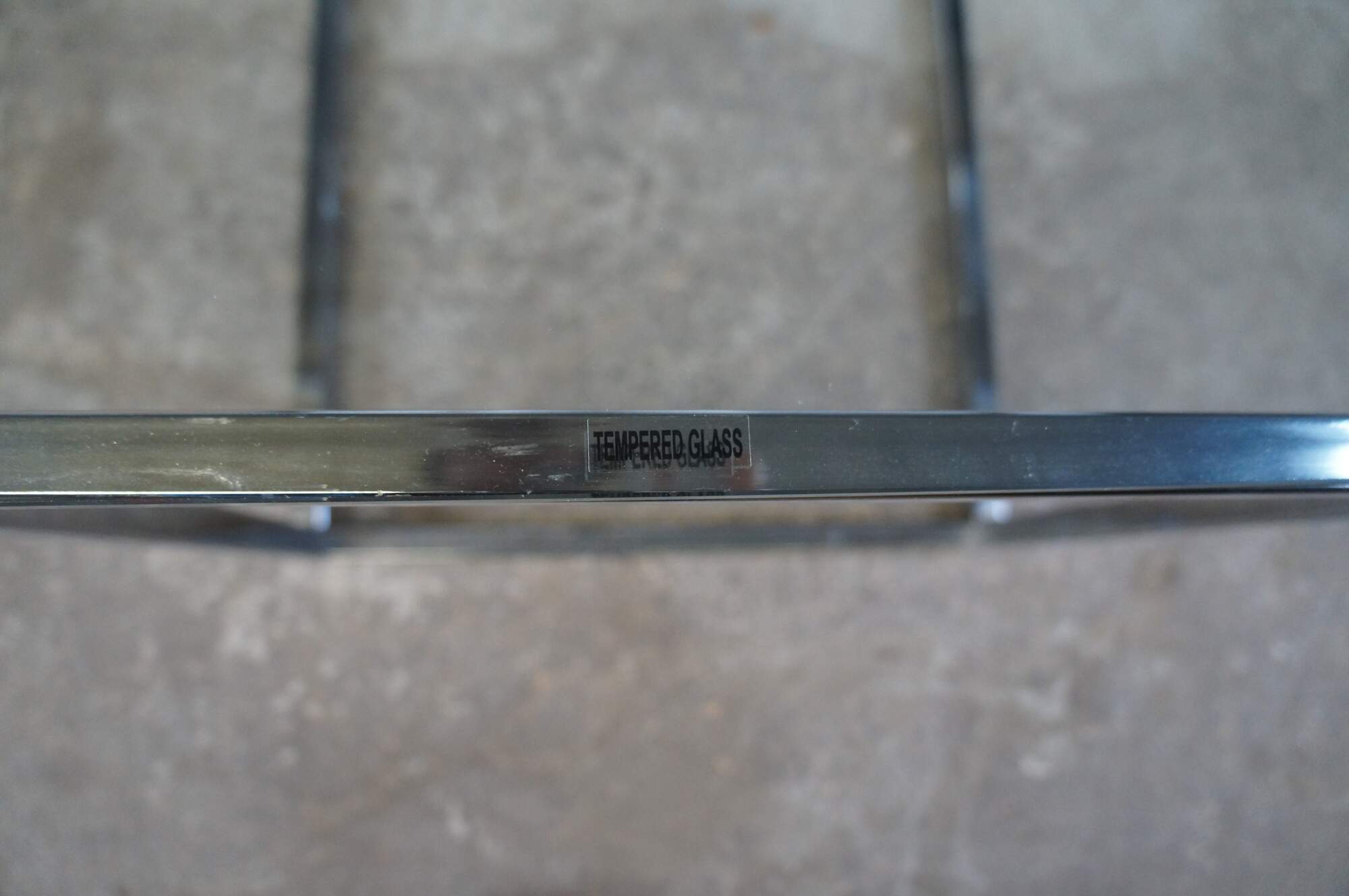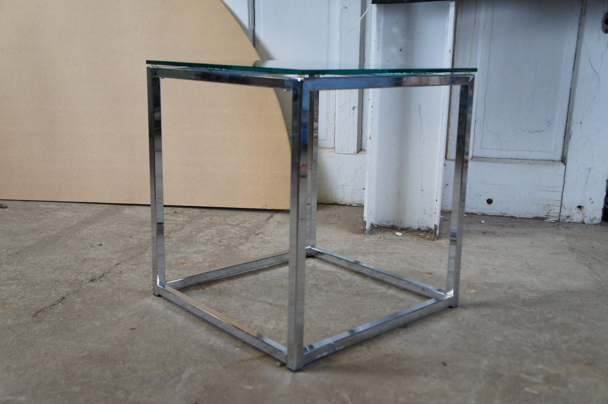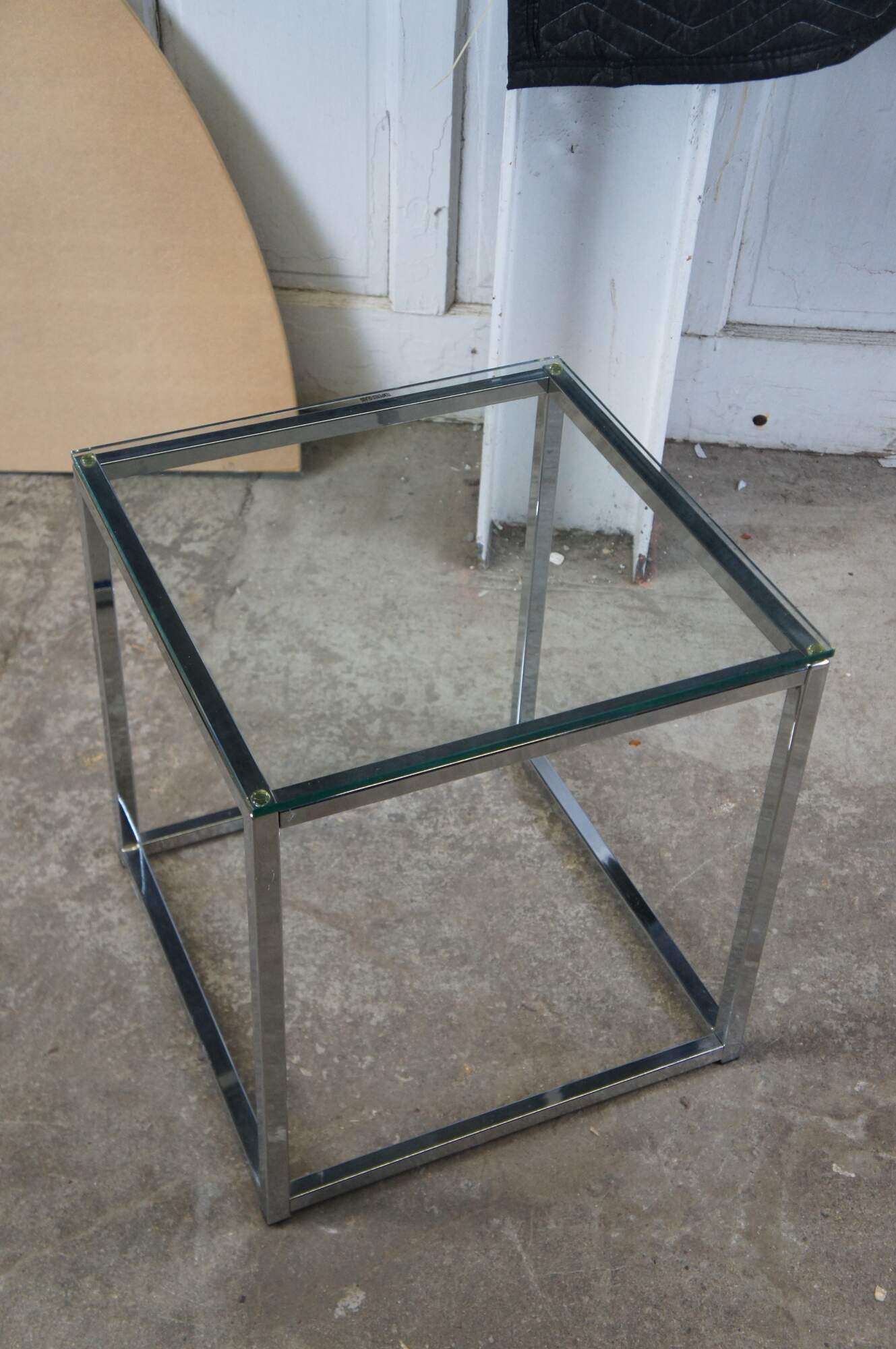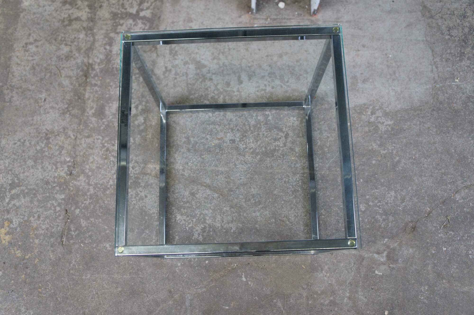 A small modern side table. Features a chrome base with a tempered glass top. Circa 2010