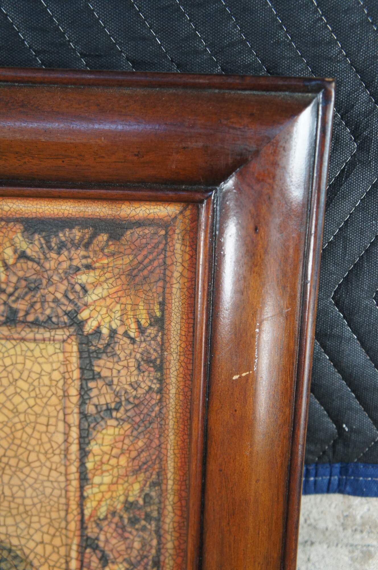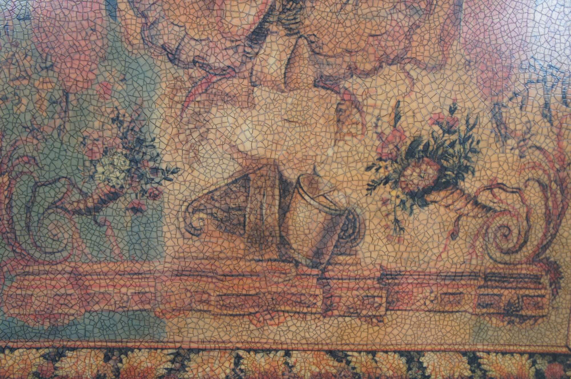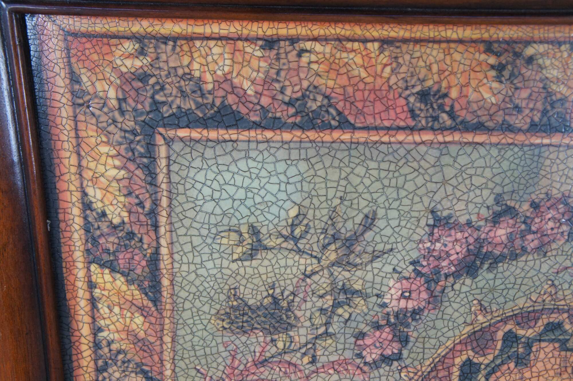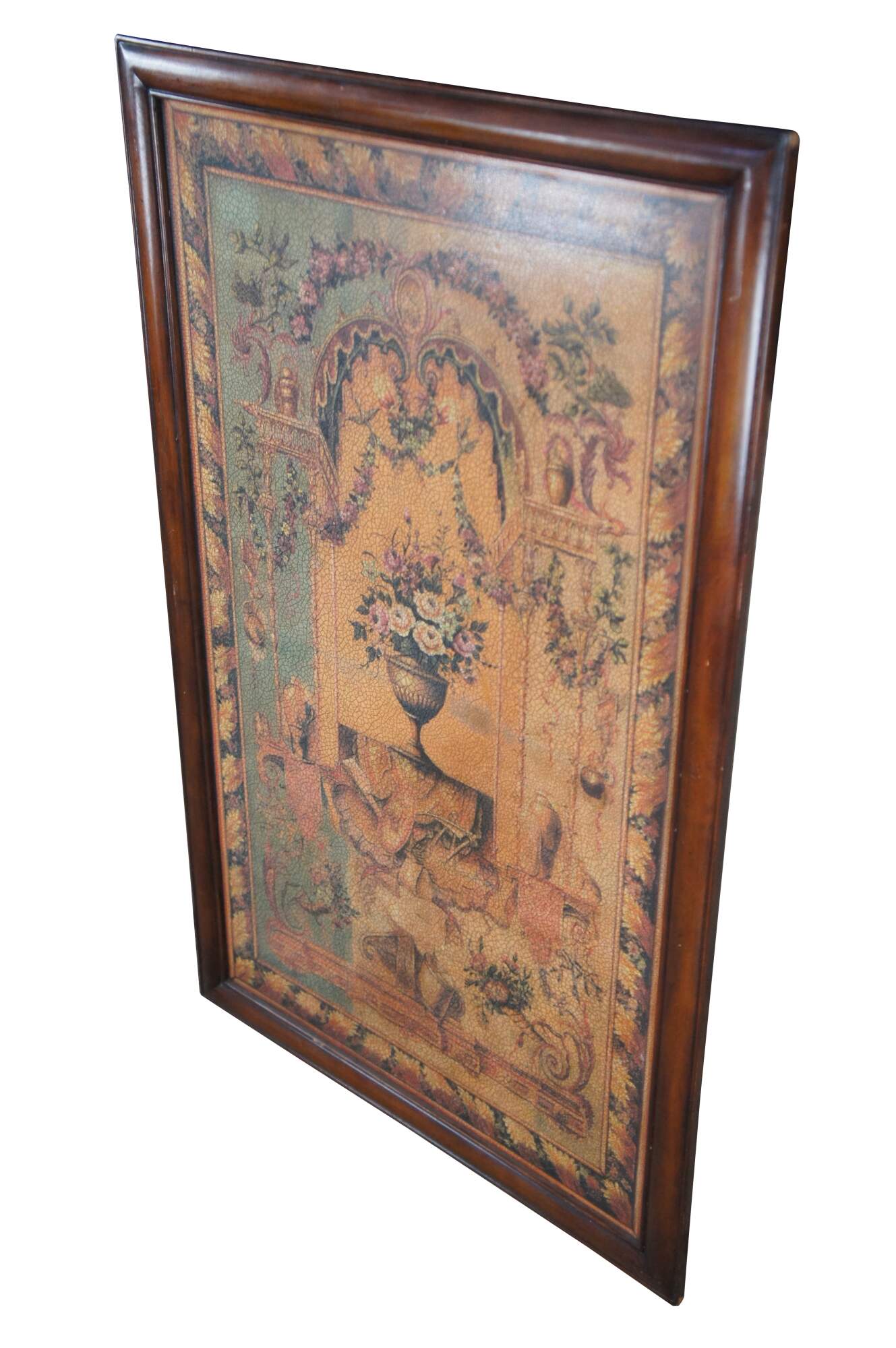 A large decoupage wall panel by Theodore Alexander, circa 2000s. The decoupage is designed after a French tapestry showcasing a castle window with Grecian urns, flowers, a cornucopia, and other decorative objects. The border of the panel has ornate acanthus leaves, framed in mahogany.