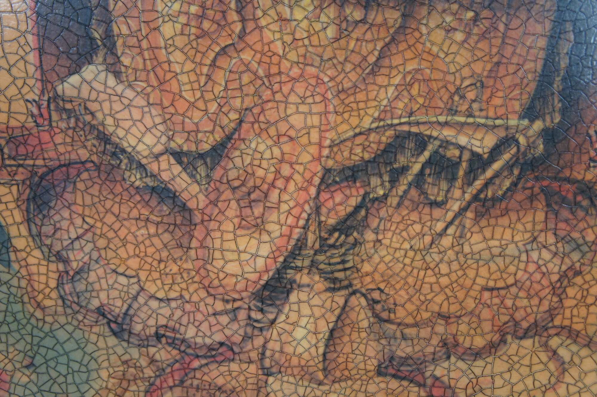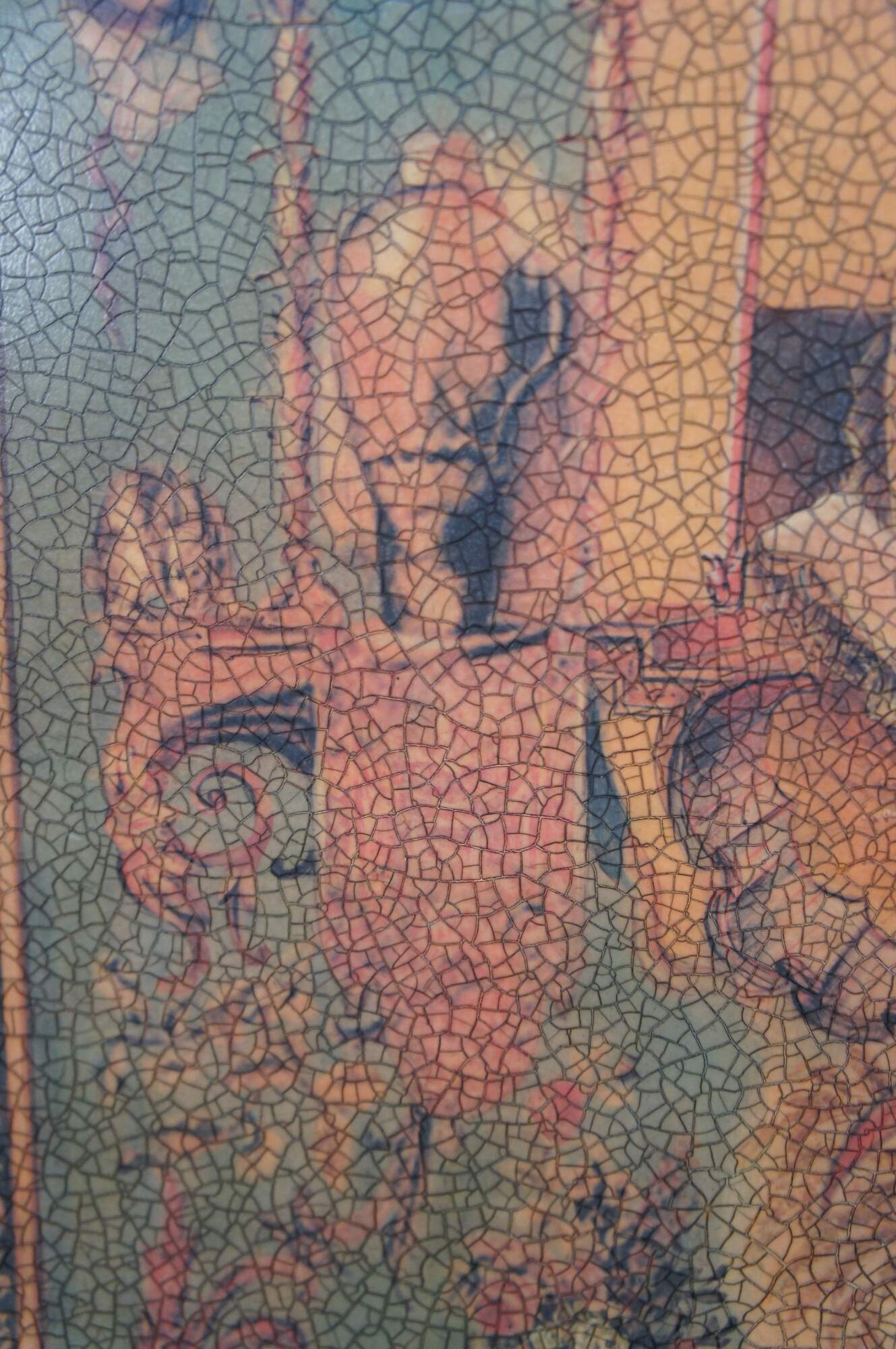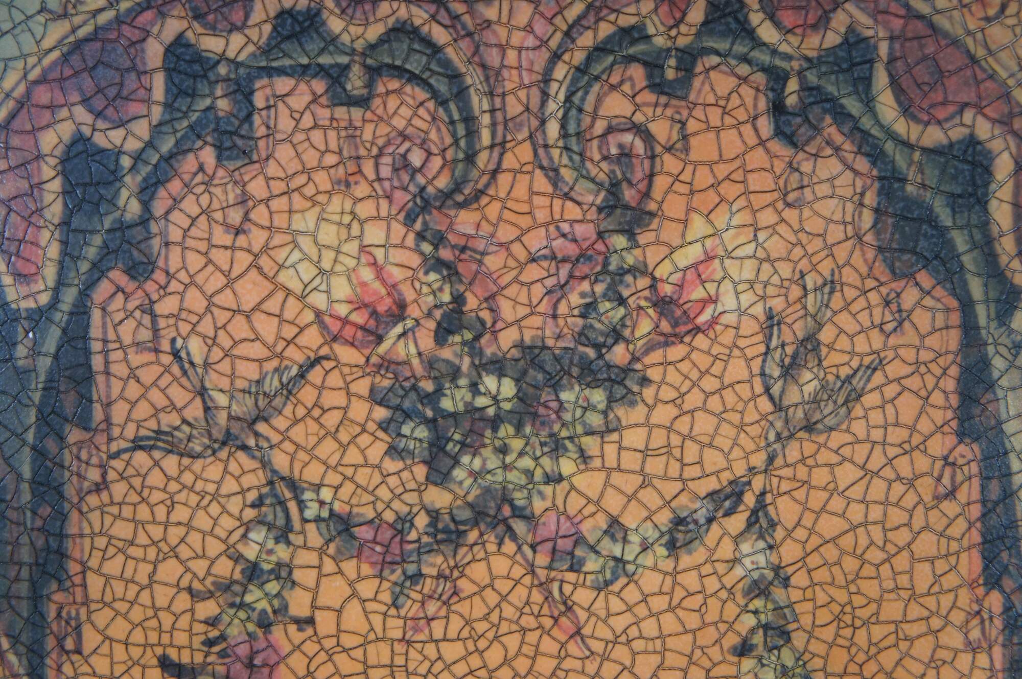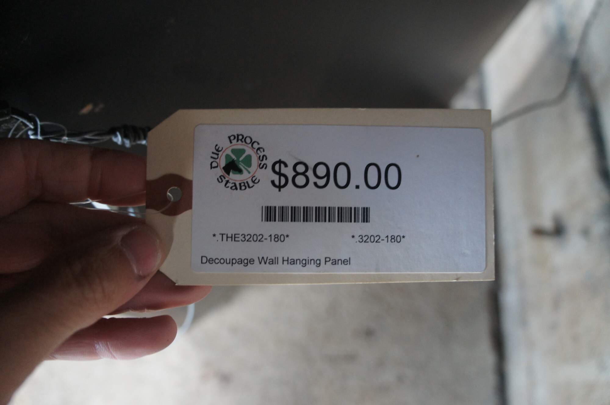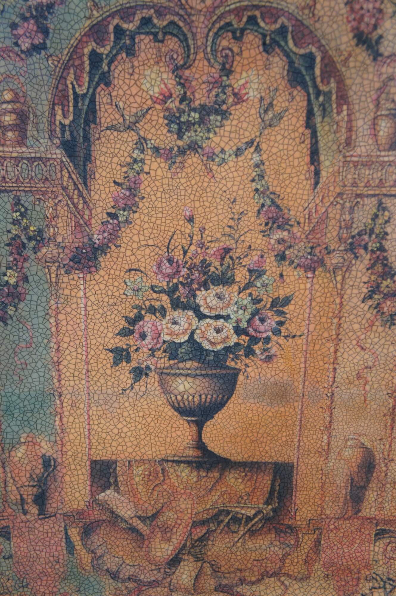 A large decoupage wall panel by Theodore Alexander, circa 2000s. The decoupage is designed after a French tapestry showcasing a castle window with Grecian urns, flowers, a cornucopia, and other decorative objects. The border of the panel has ornate acanthus leaves, framed in mahogany.