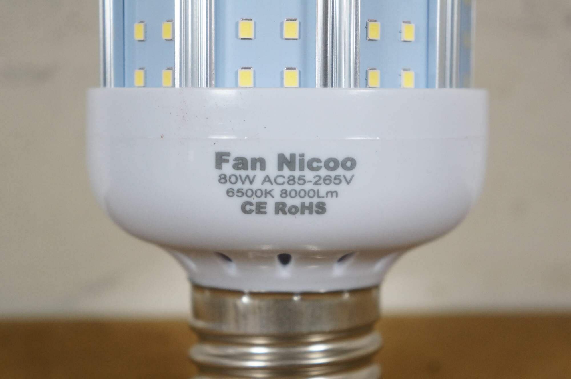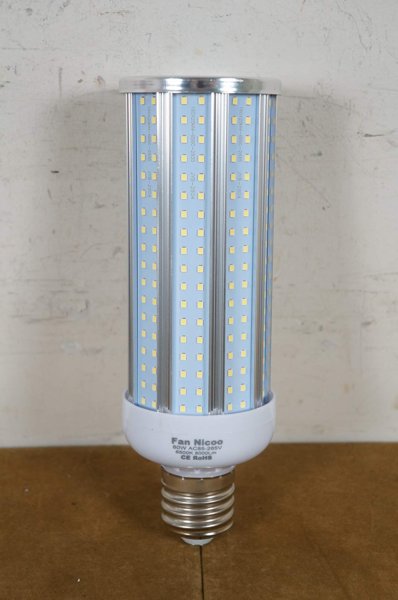Pair of 80w LED Corn Lamp Light Bulbs. Fan Nicoo / 80W AC85-265V / 6500K 8000Lm / CE RoHS. 160x20mm / JYB-2804 / JYB-2949 / 6B6C-2835. Made in China.