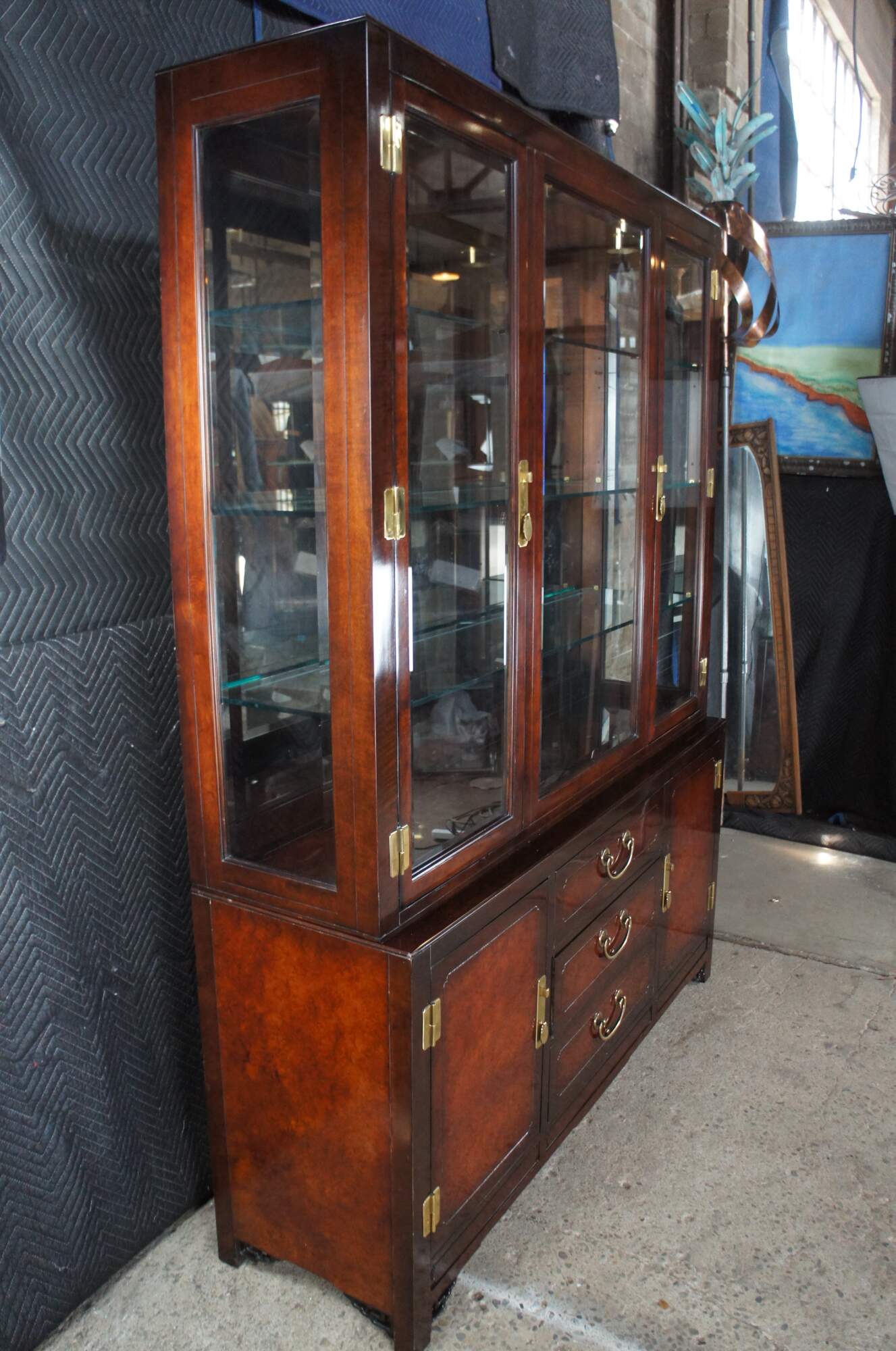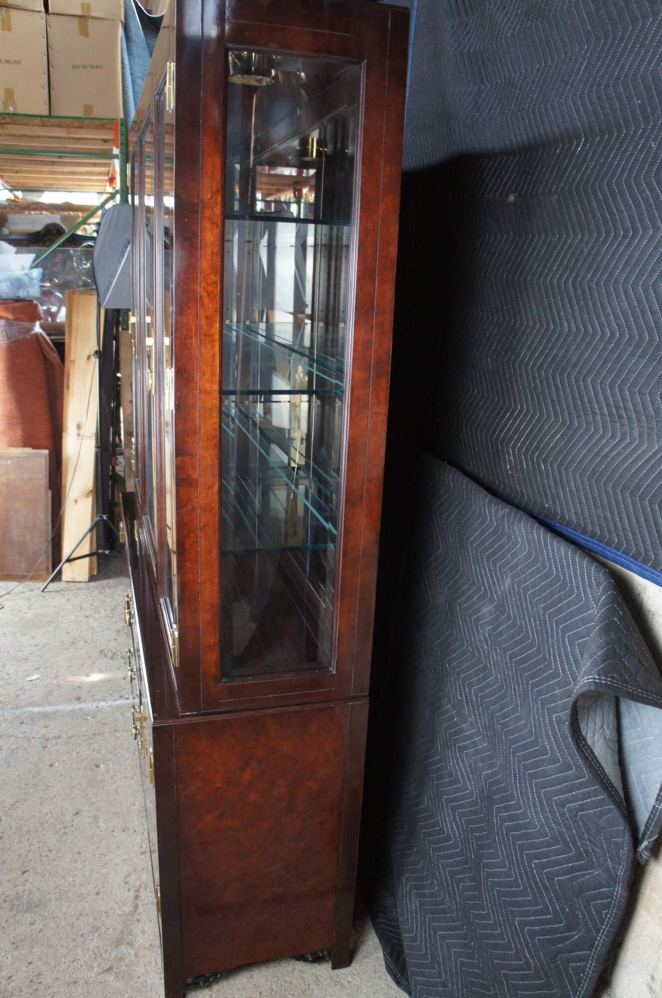 1987 White Furniture Ming Dynasty style Mandarin China Cabinet 330-31. Features a rectangular form made from mahogany and burlwood paneling with a stepback top. The illuminated top showcases beveled glass doors, a mirrored interior, and three polished glass shelves with plate grooves. 3-phase illumination is controlled by tapping the outside of the brass hardware. The buffet portion of the cabinet features three dovetailed drawers at the center flanked by outer cabinets with shelves for storage of additional service pieces. The uppermost drawer has a silverware cloth for flatware. The cabinet is accented by beautiful polished brass hardware and fretwork spandrels along the base. White Fine Furniture has been in business since the end of the 19th century and operates out of Mebane, North Carolina.