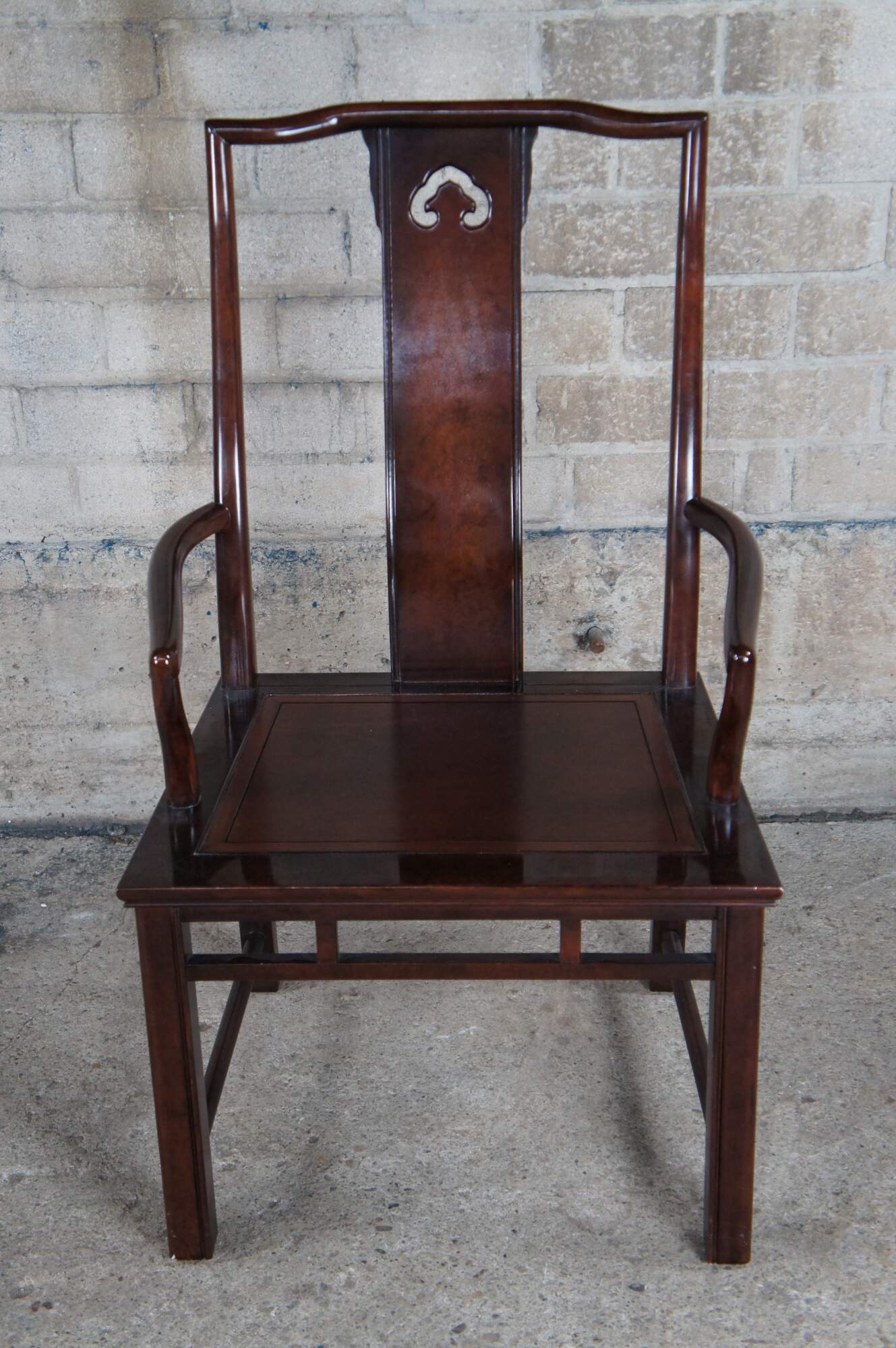 Six vintage 1980s Mandarin collection dining chairs by White Furniture. Made of mahogany and burl, with Ming style form. Featuring burled and pierced back splat and Chinese symbol upholstered cushions.