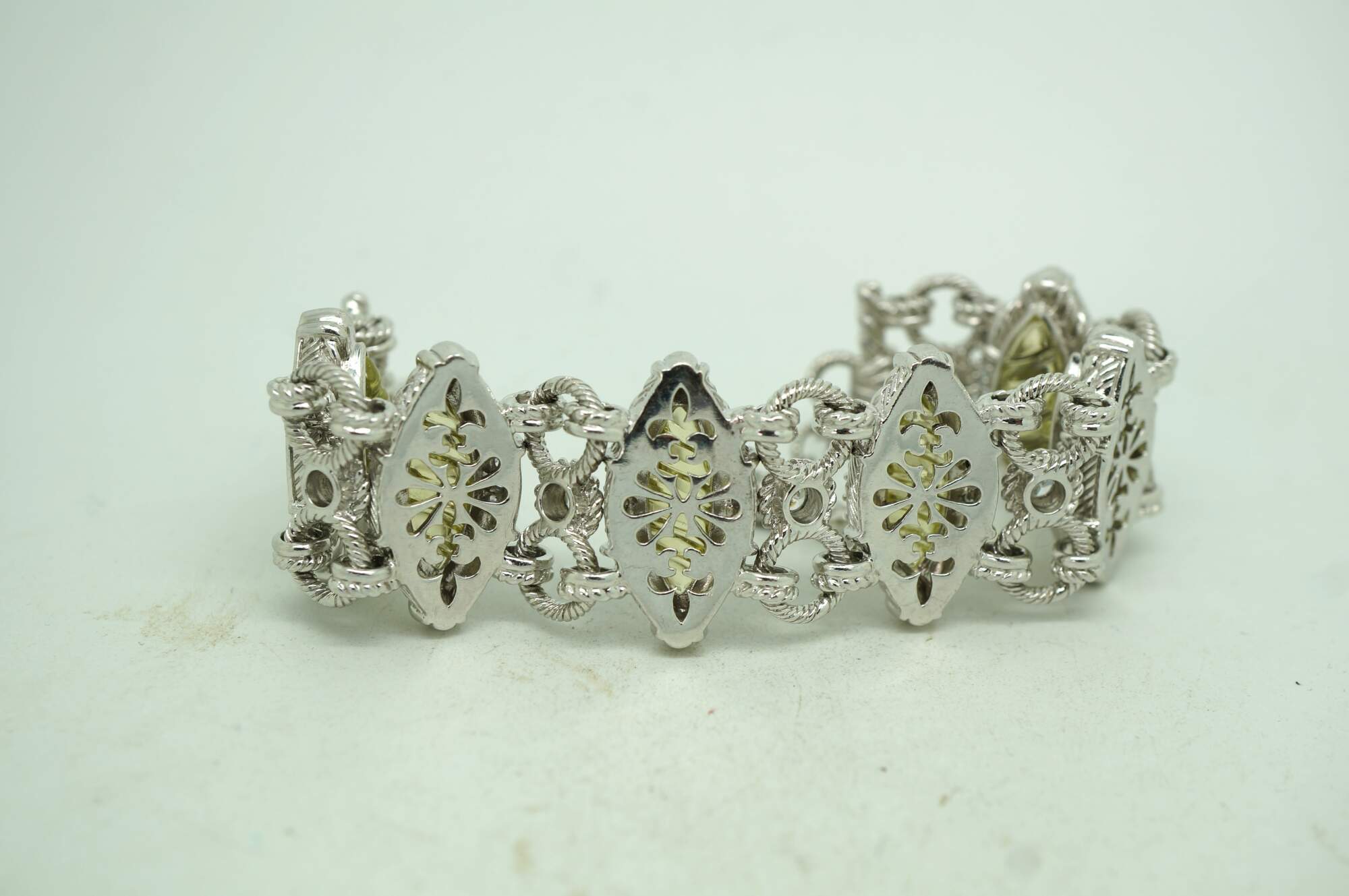 Vintage late 20th-century bracelet and earrings by designer Judith Ripka. Set includes one sterling silver bracelet - toggle clasp, chain link, featuring rope twisted accents and alternating white cubic zirconia and pale green, almond shaped, swirl carved gems; and a pair of clip on sterling silver earrings with crossed rope twist pattern accented with white cubic zirconia and cultured pearl dangles.