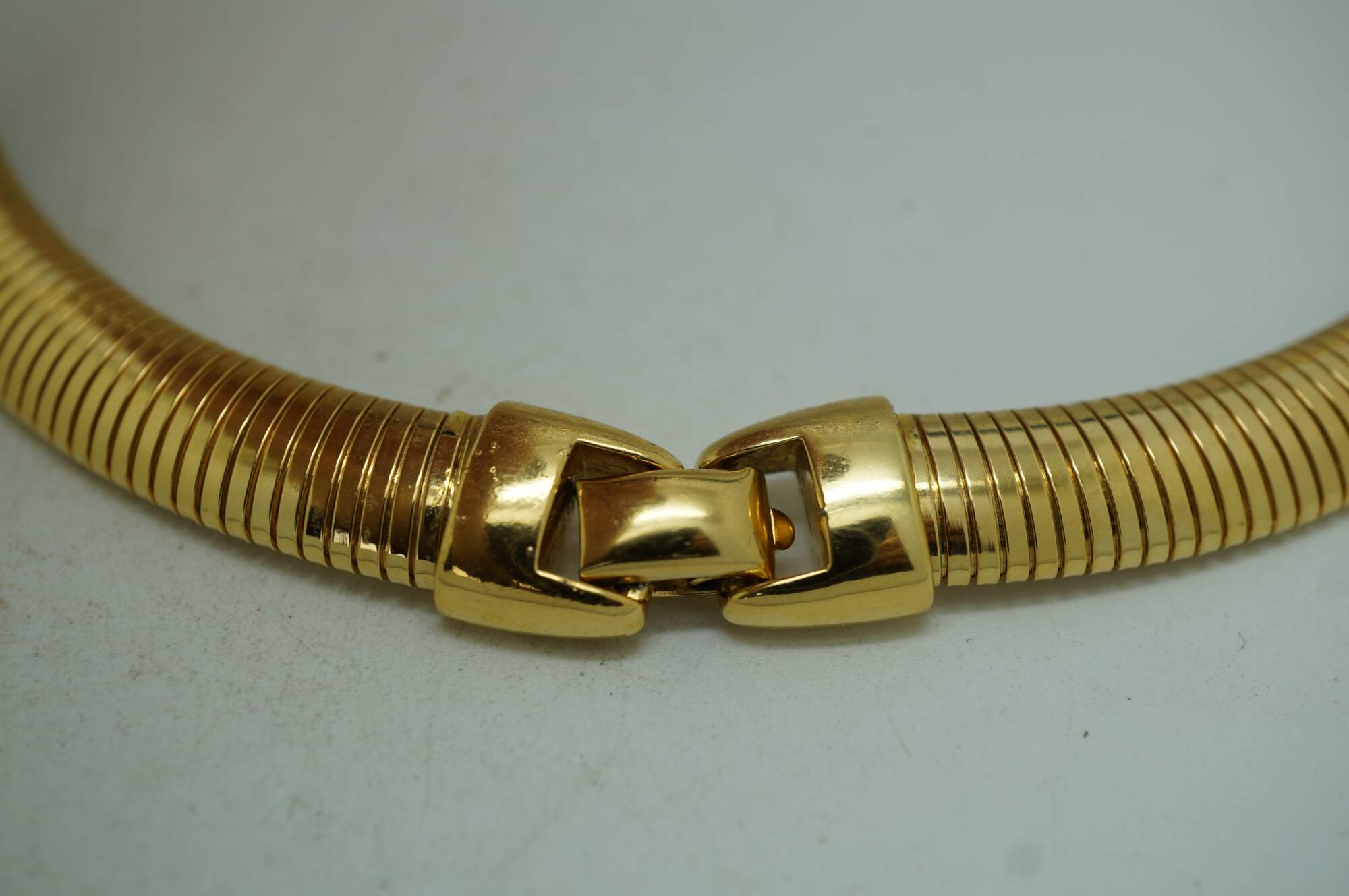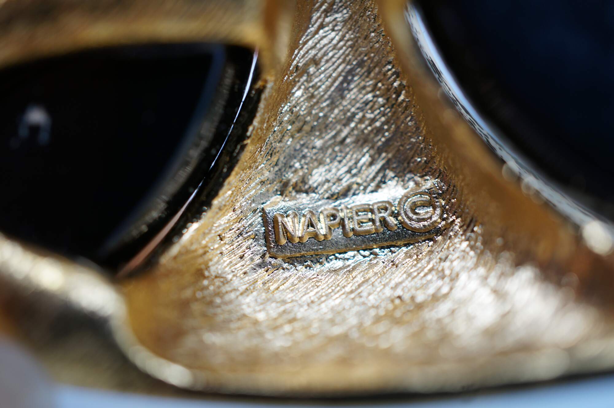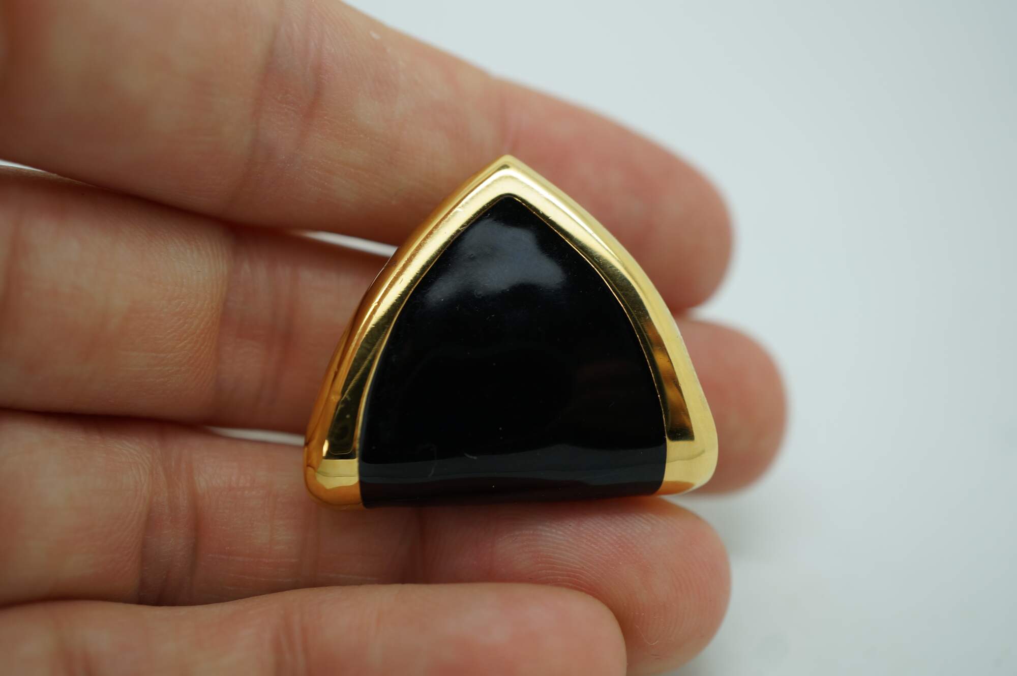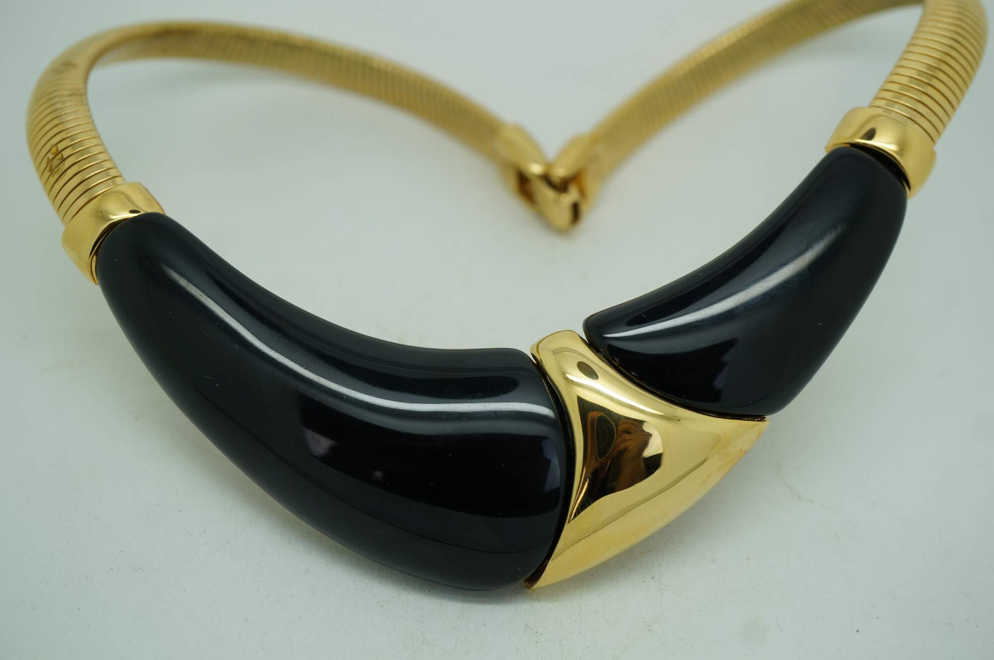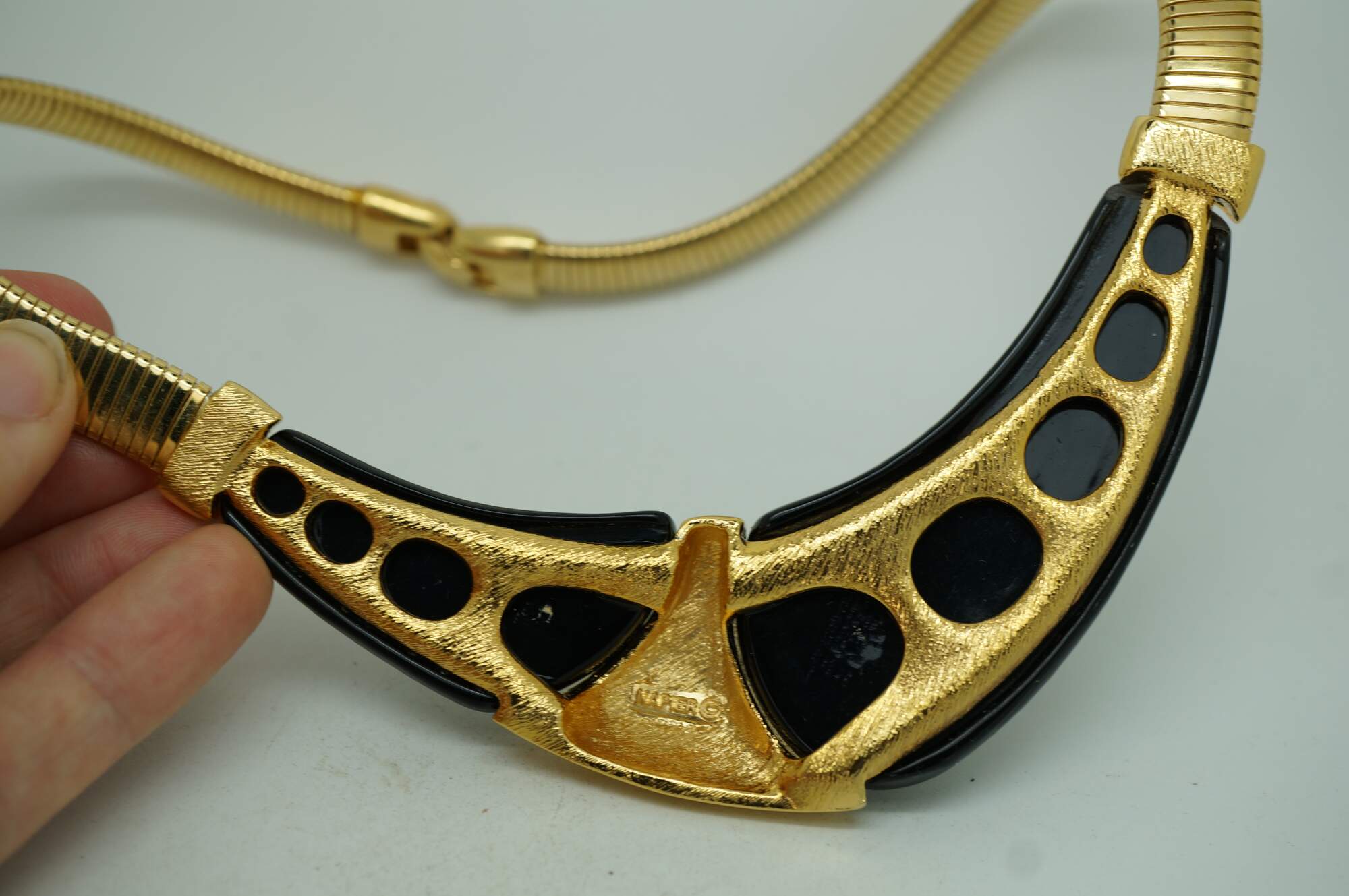 Circa 1980's Napier black and gold modernist necklace and earring set. The triangular design of brightly polished gold-tone metal and black lacquer. Snake chain. Post back earrings. Includes storage box.