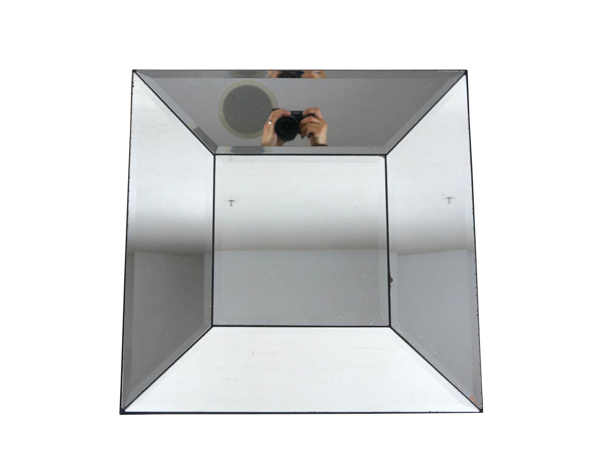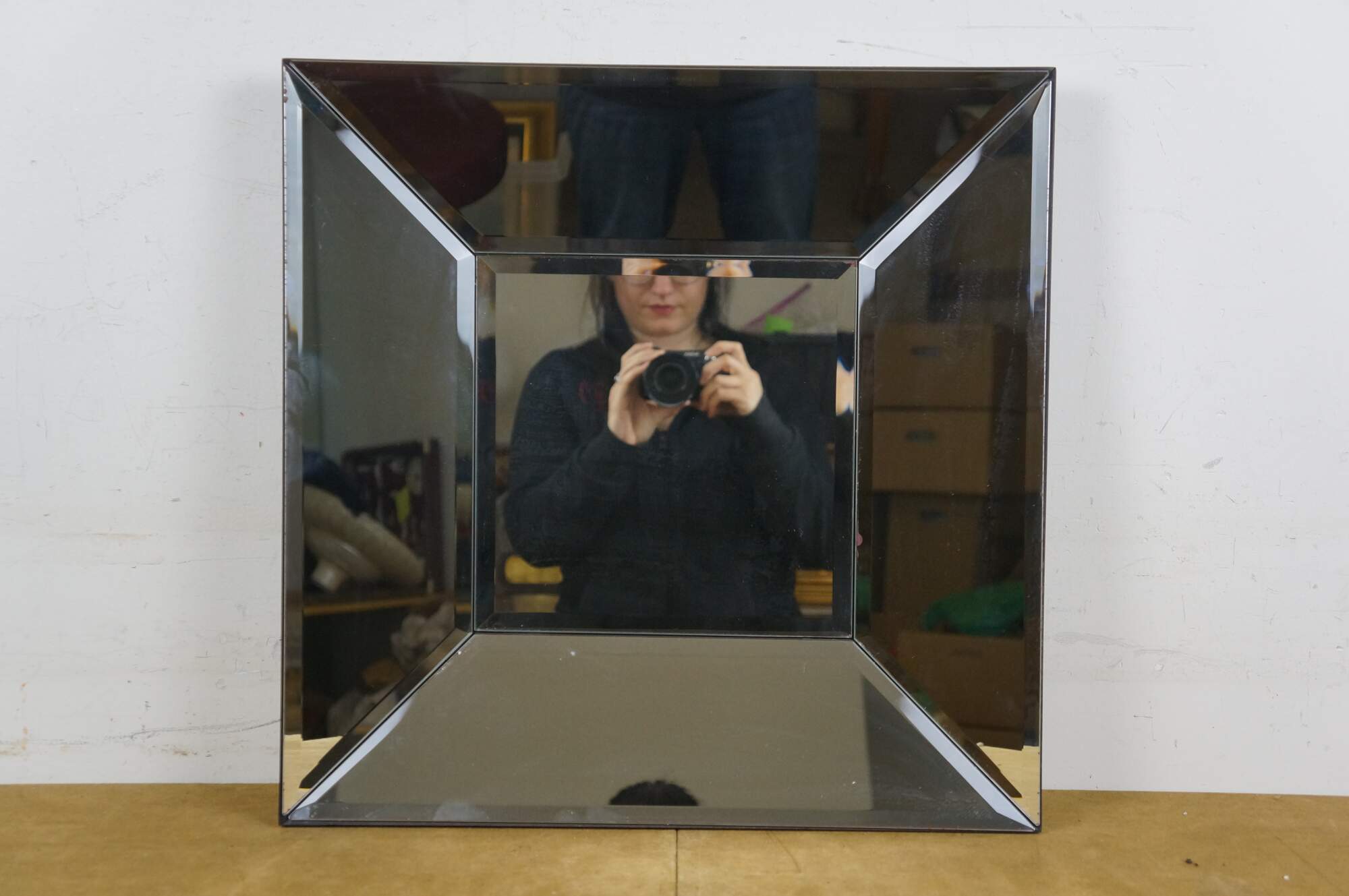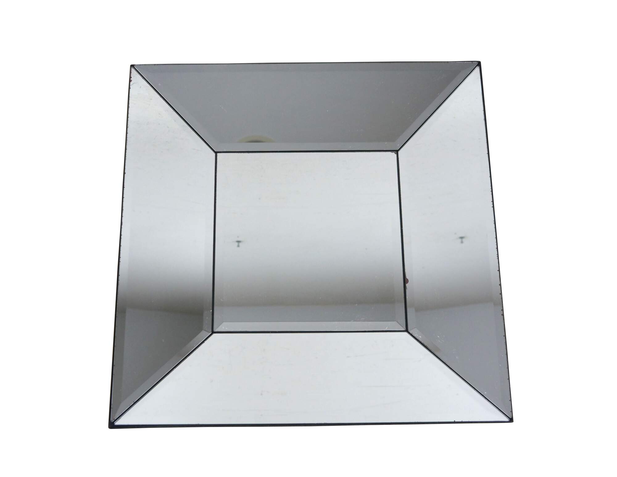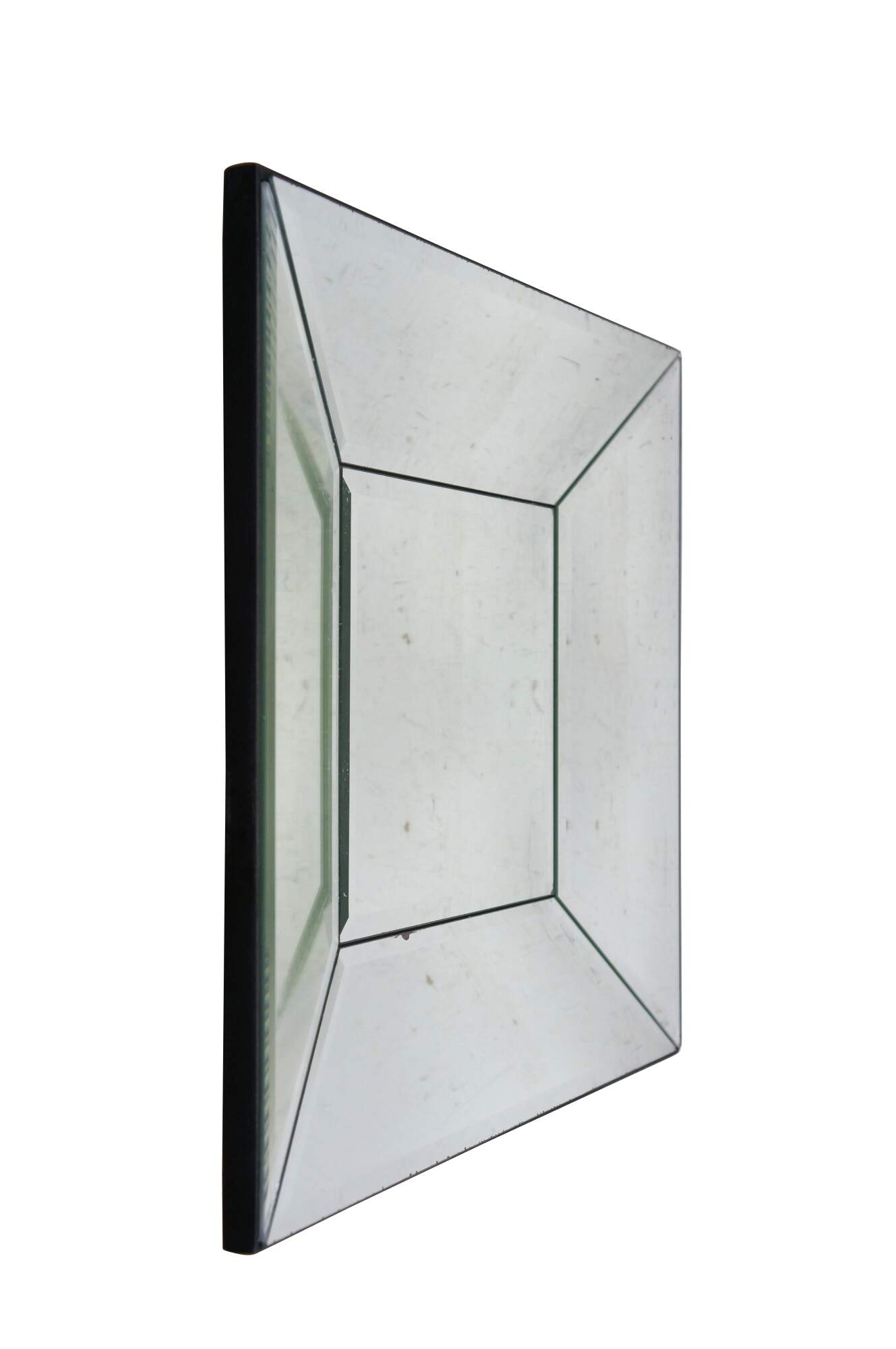 Set of eight Pottery Barn square wall mirrors featuring a faceted, deep beveled design, with subtle factory distressed silver loss at the edges. Black wood backs.