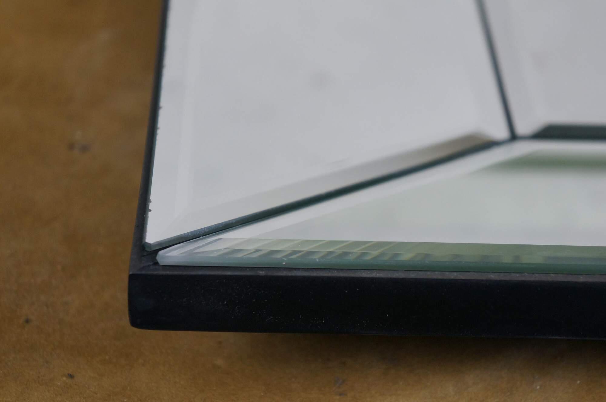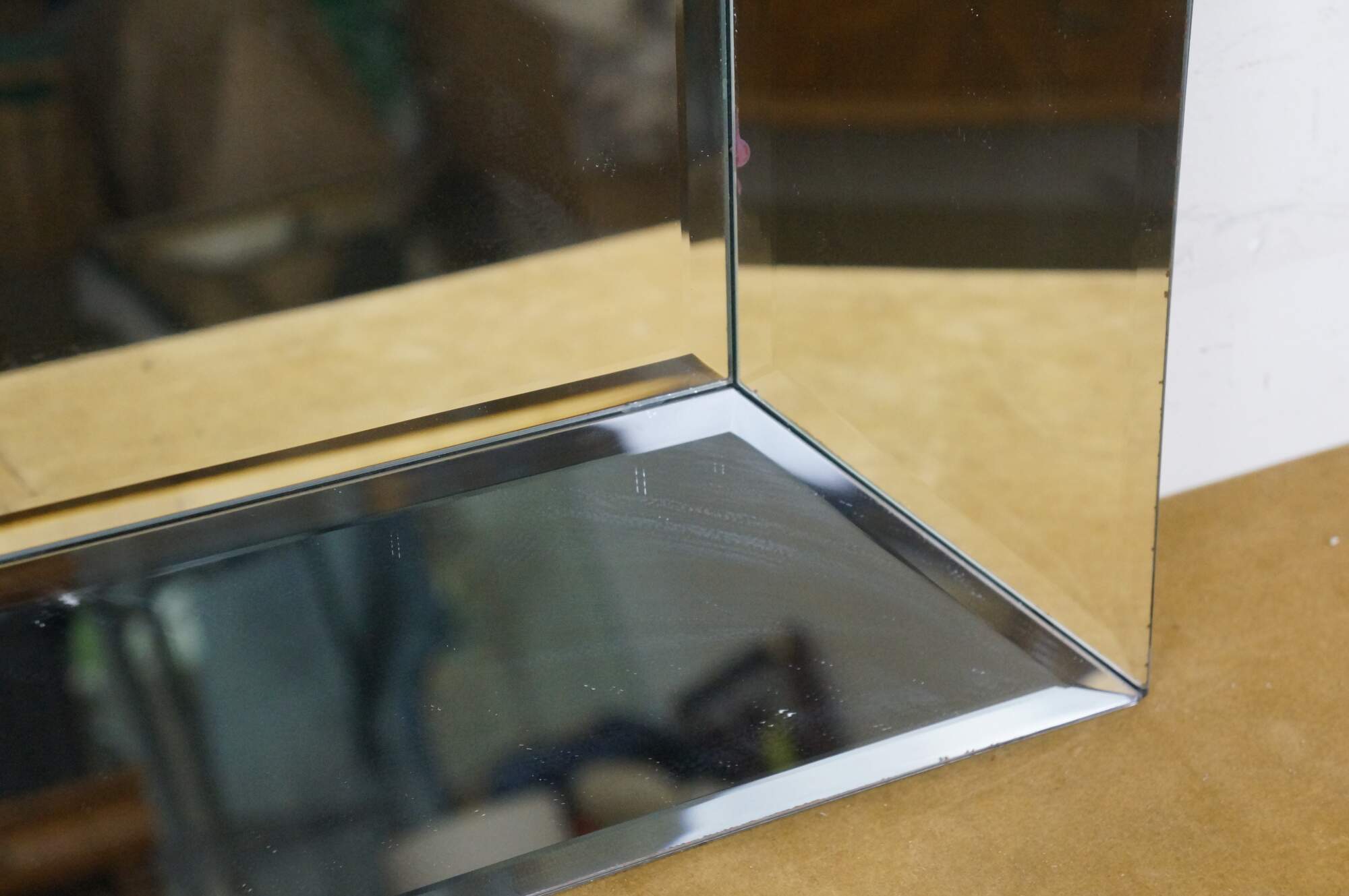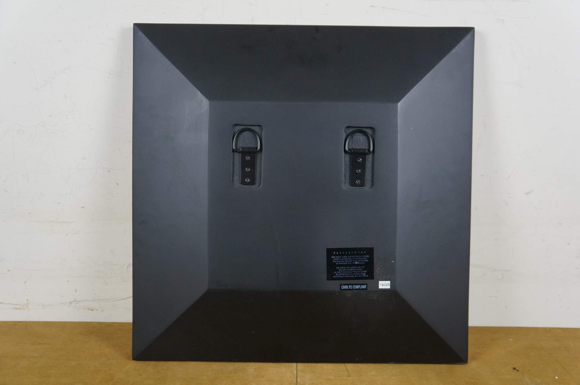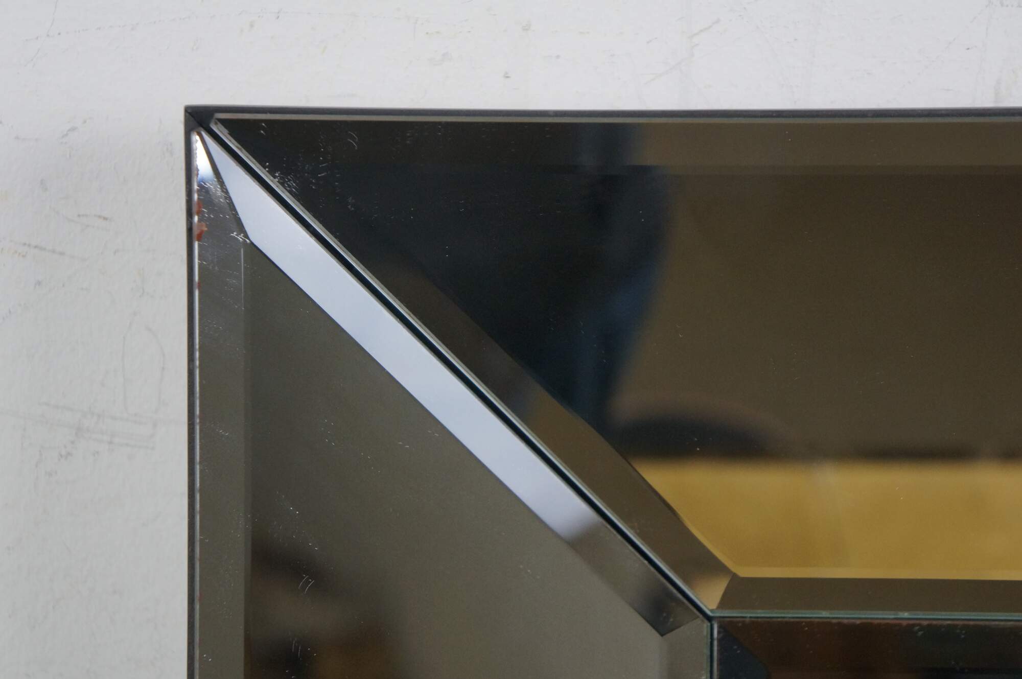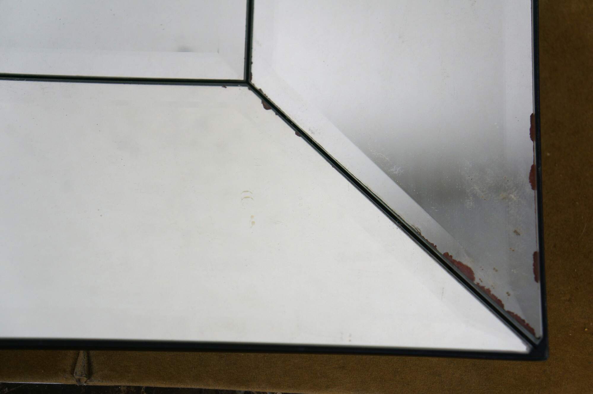 Set of eight Pottery Barn square wall mirrors featuring a faceted, deep beveled design, with subtle factory distressed silver loss at the edges. Black wood backs.