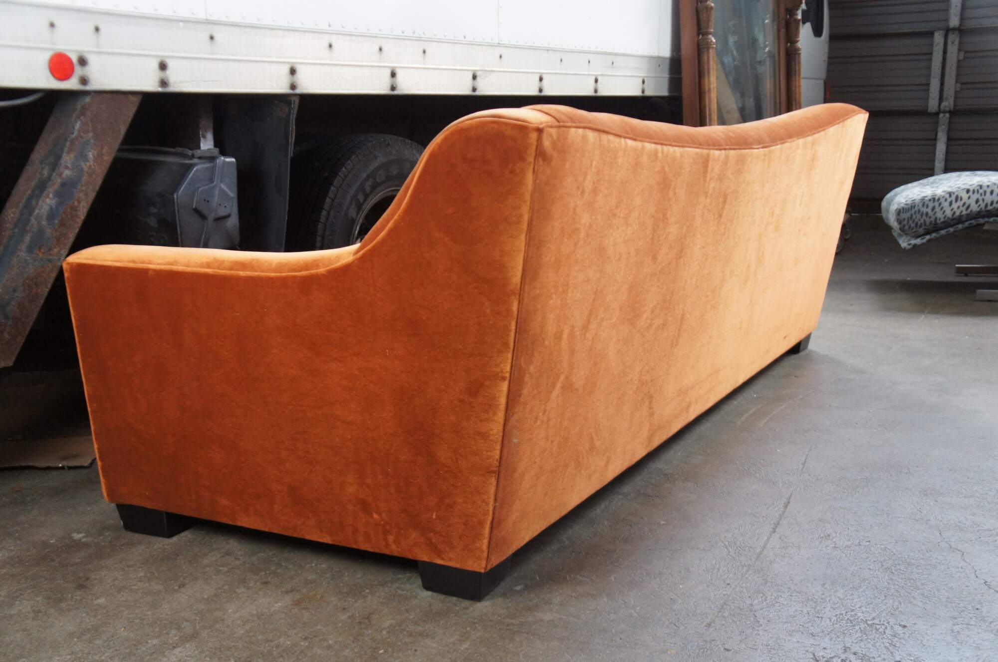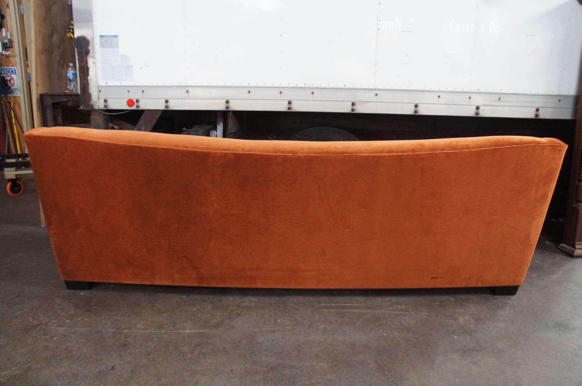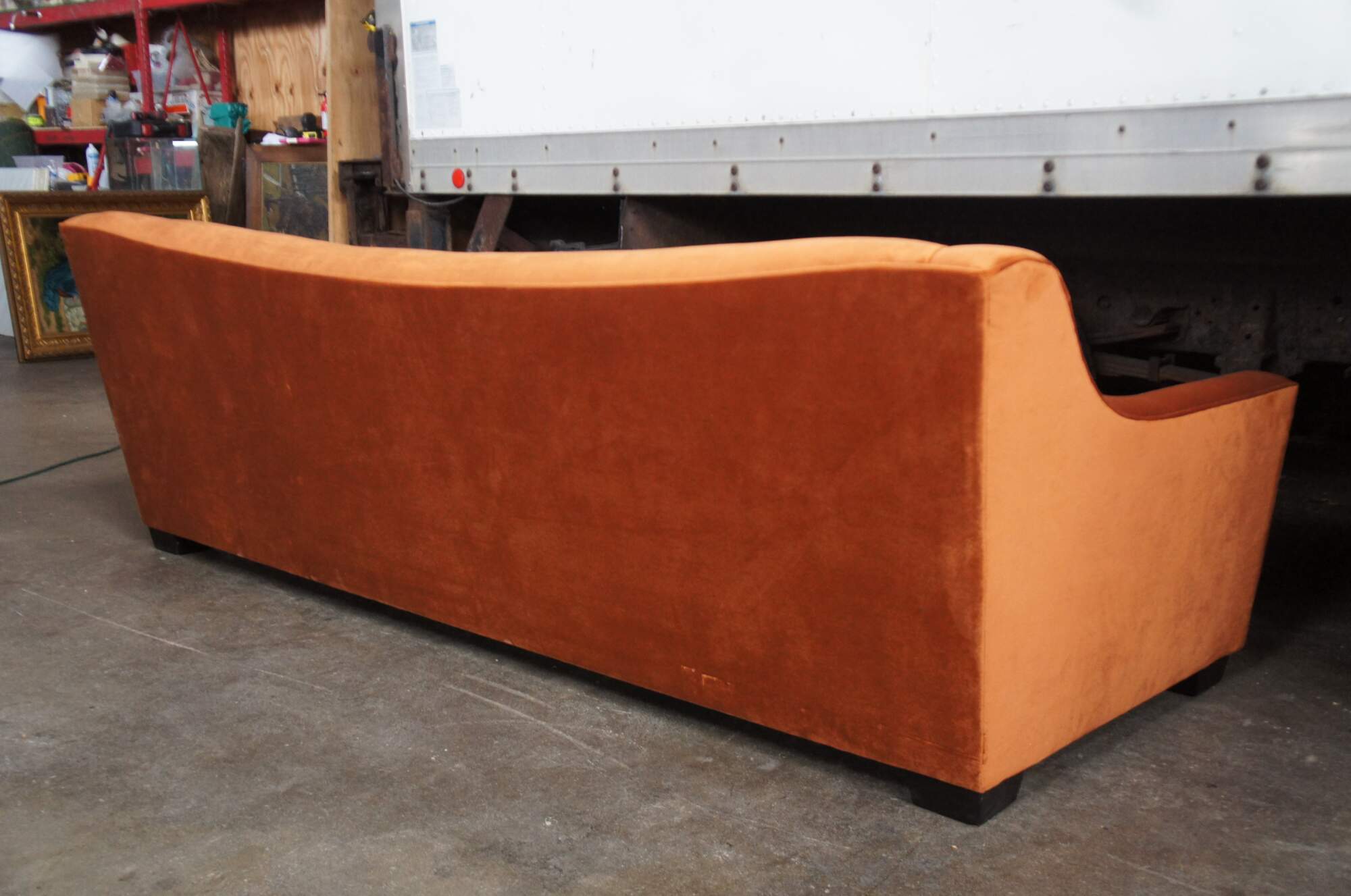 Pair of Bernhardt modern orange sofas, circa 2010. Features a rectangular form upholstered in velvet with a downswept back and sloped arms. Each sofa has three seats over square tapered feet.