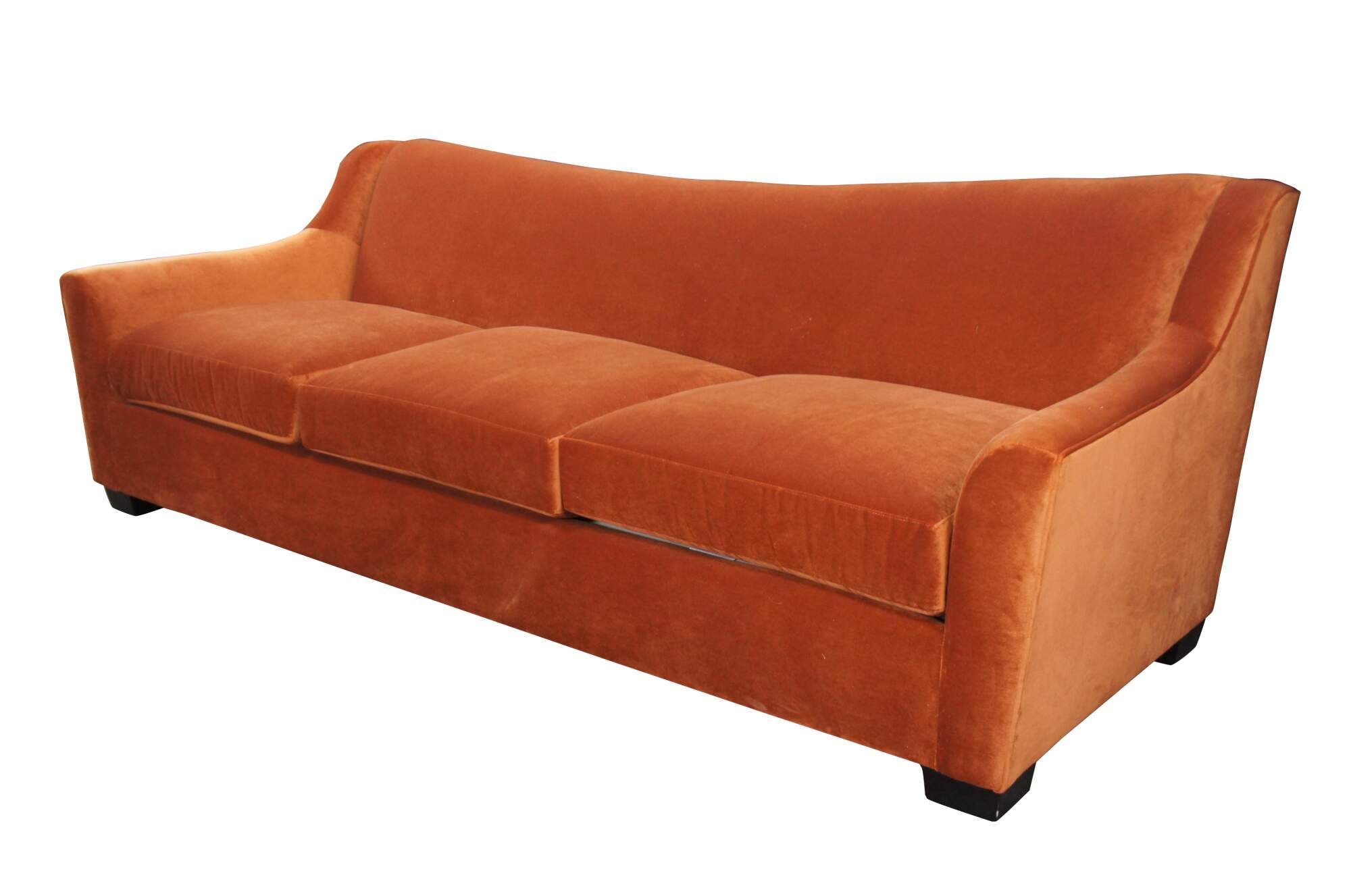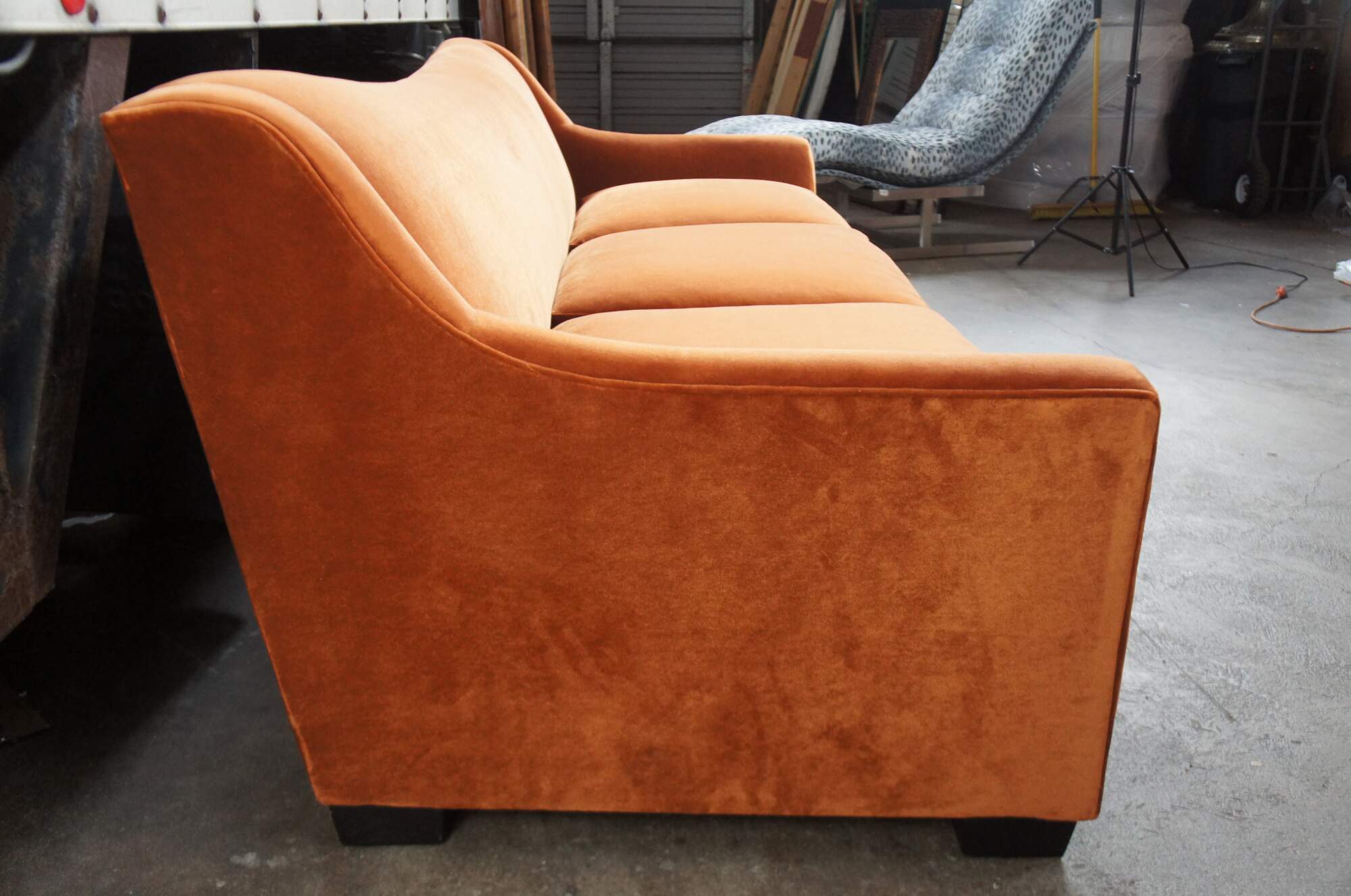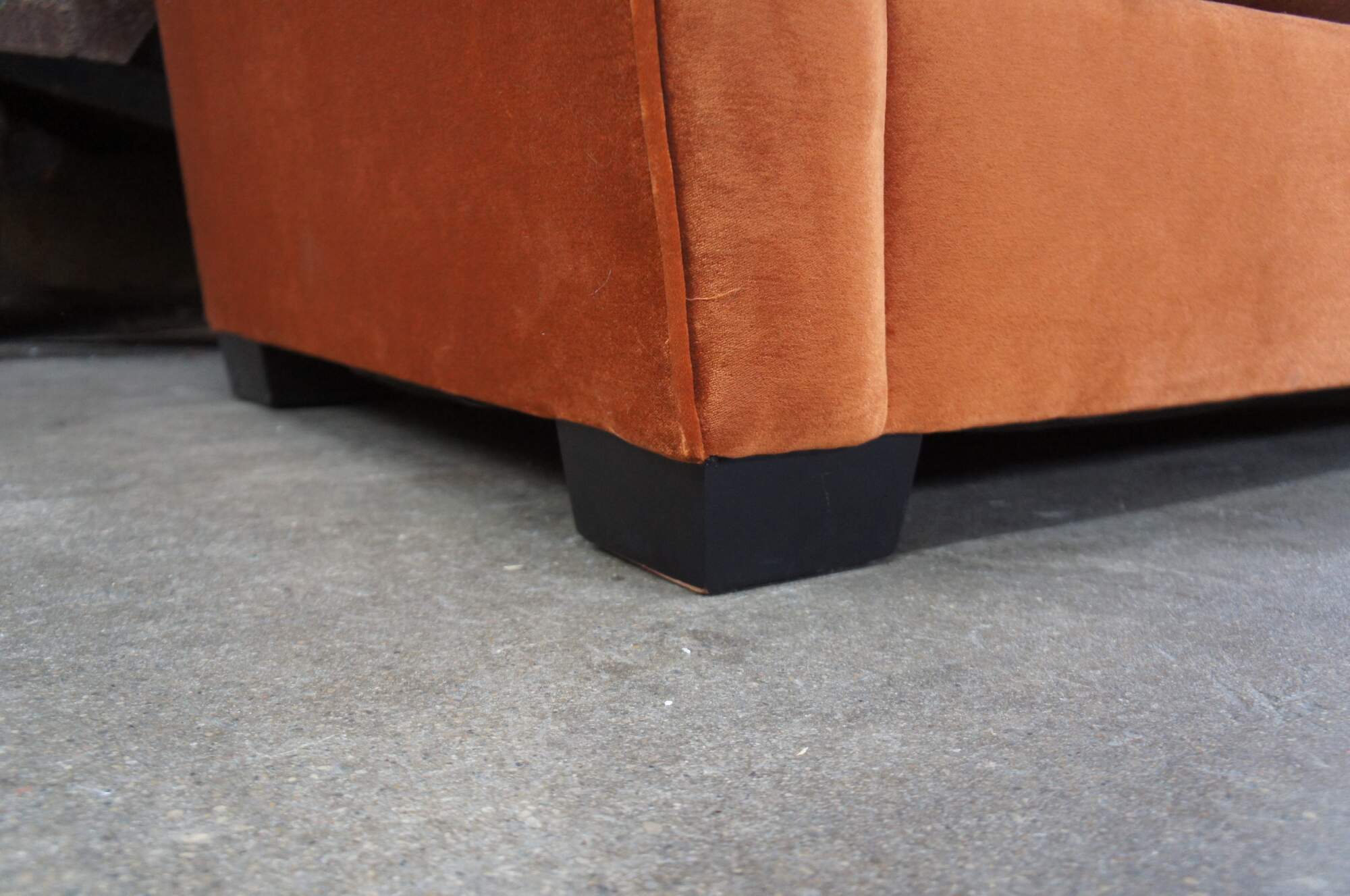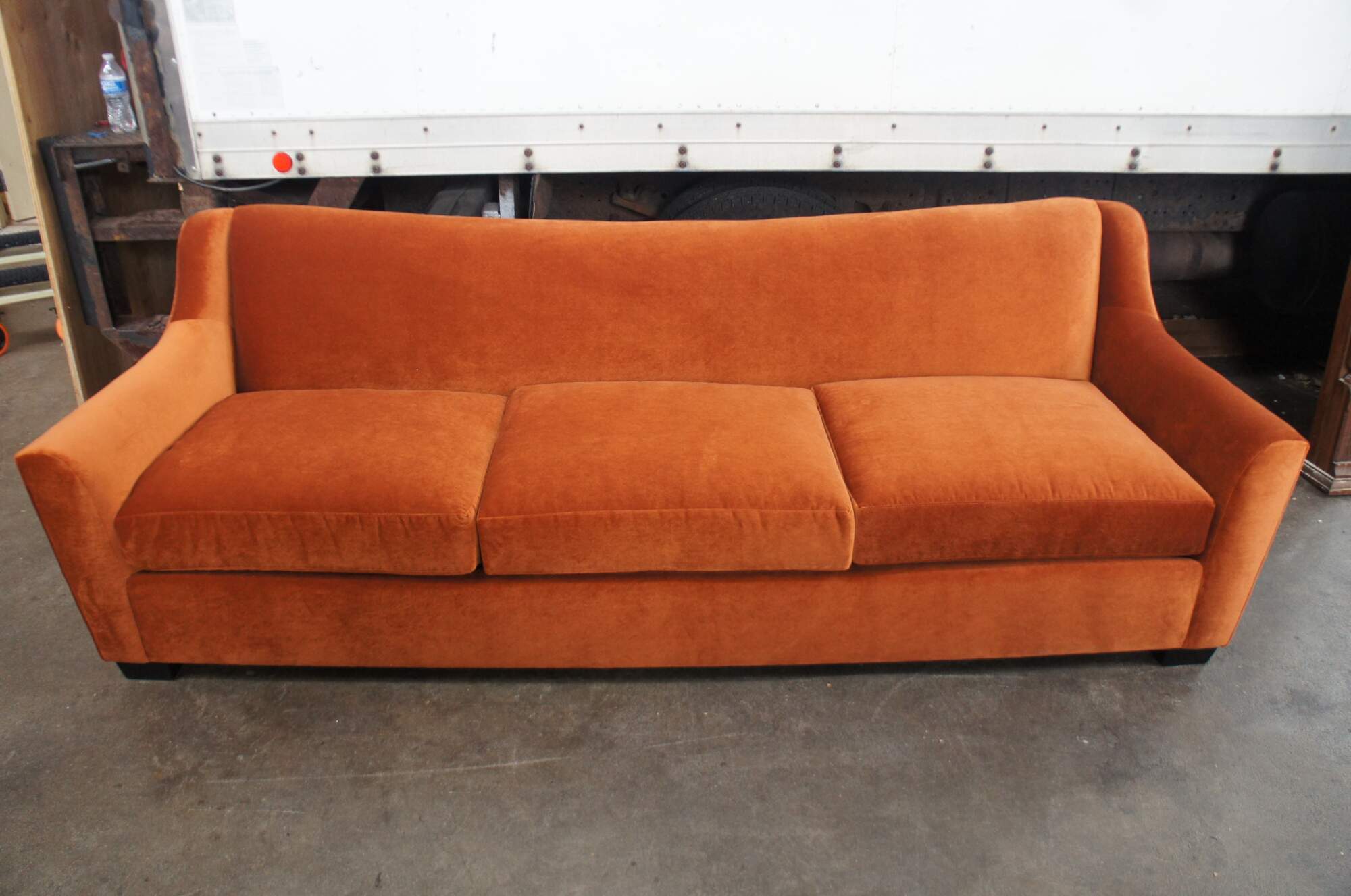 Pair of Bernhardt modern orange sofas, circa 2010. Features a rectangular form upholstered in velvet with a downswept back and sloped arms. Each sofa has three seats over square tapered feet.