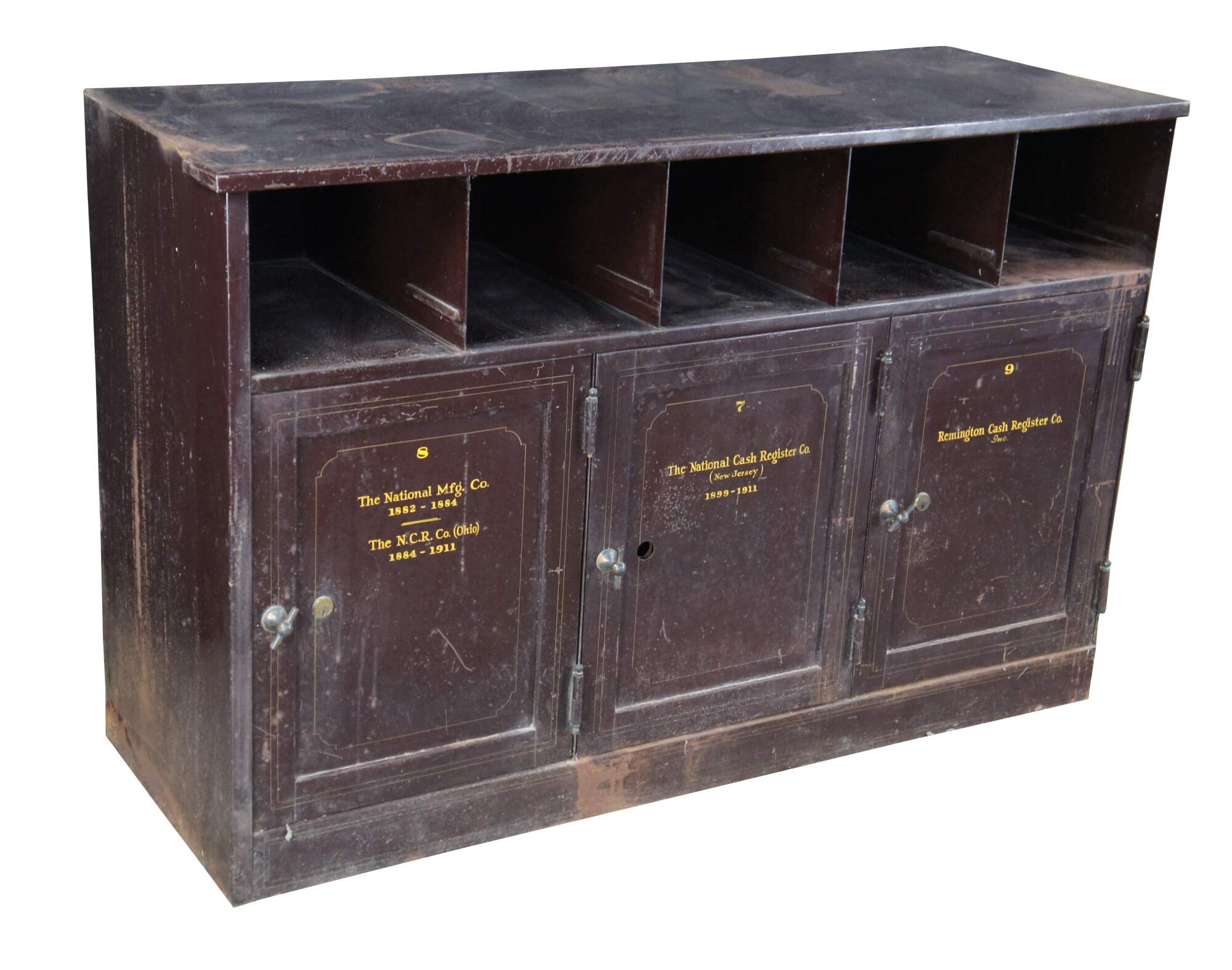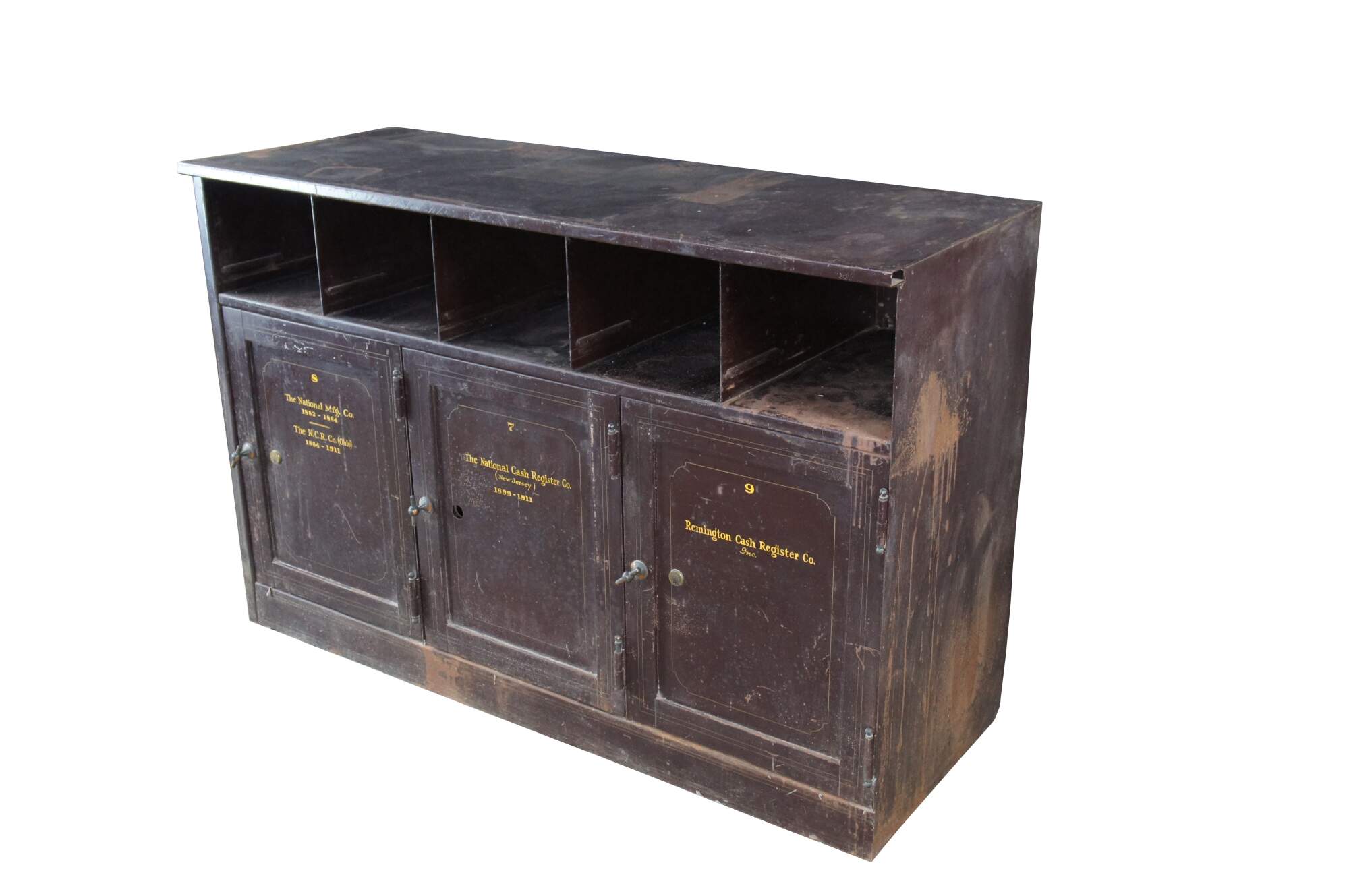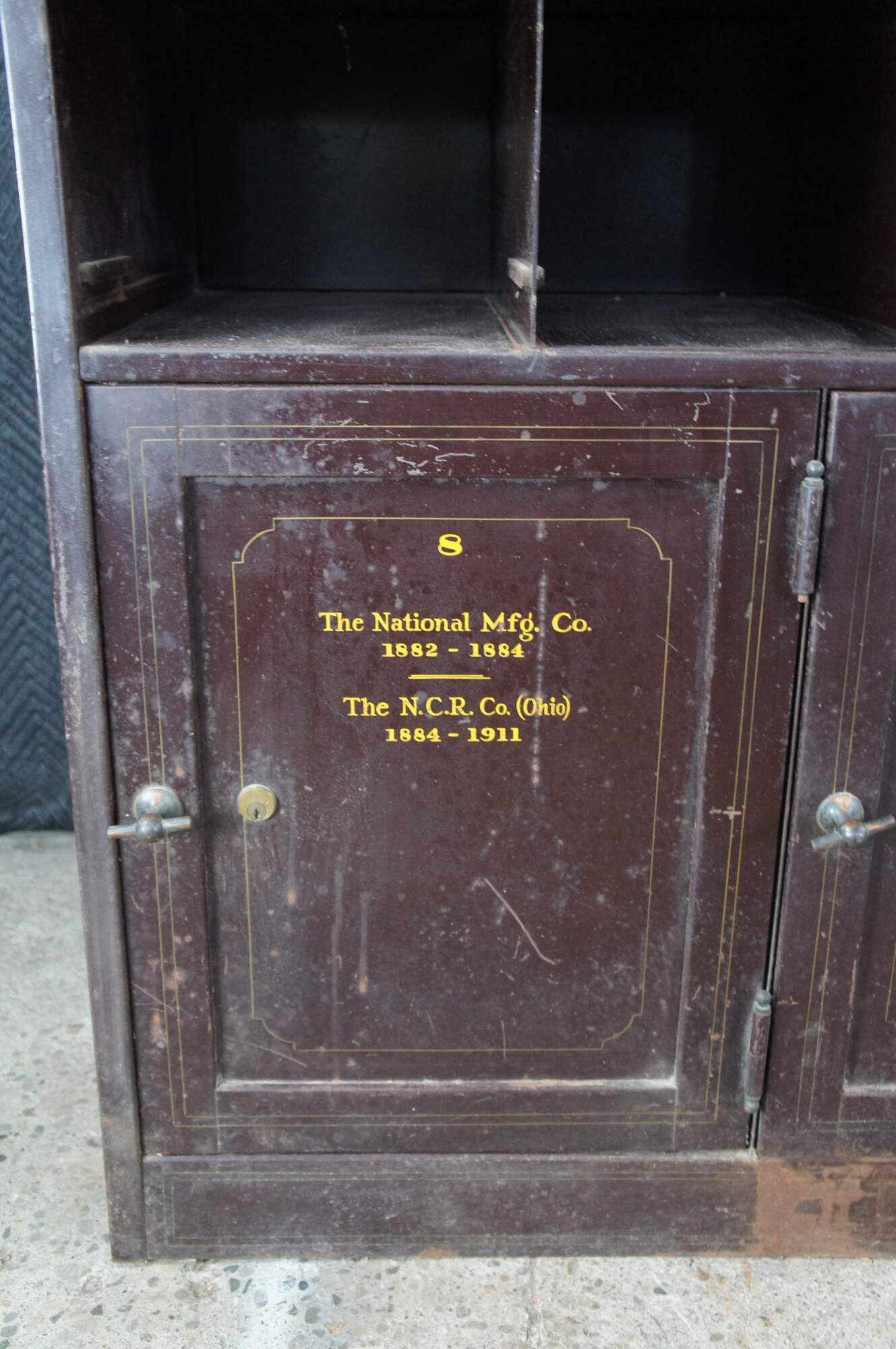 Rare antique fireproof catalogue storage cabinet from NCR headquarters in Dayton Ohio. This cabinet was part of the original corporate offices and were salvaged from the top floor before demolition. It features top cubbies and three lower safes.