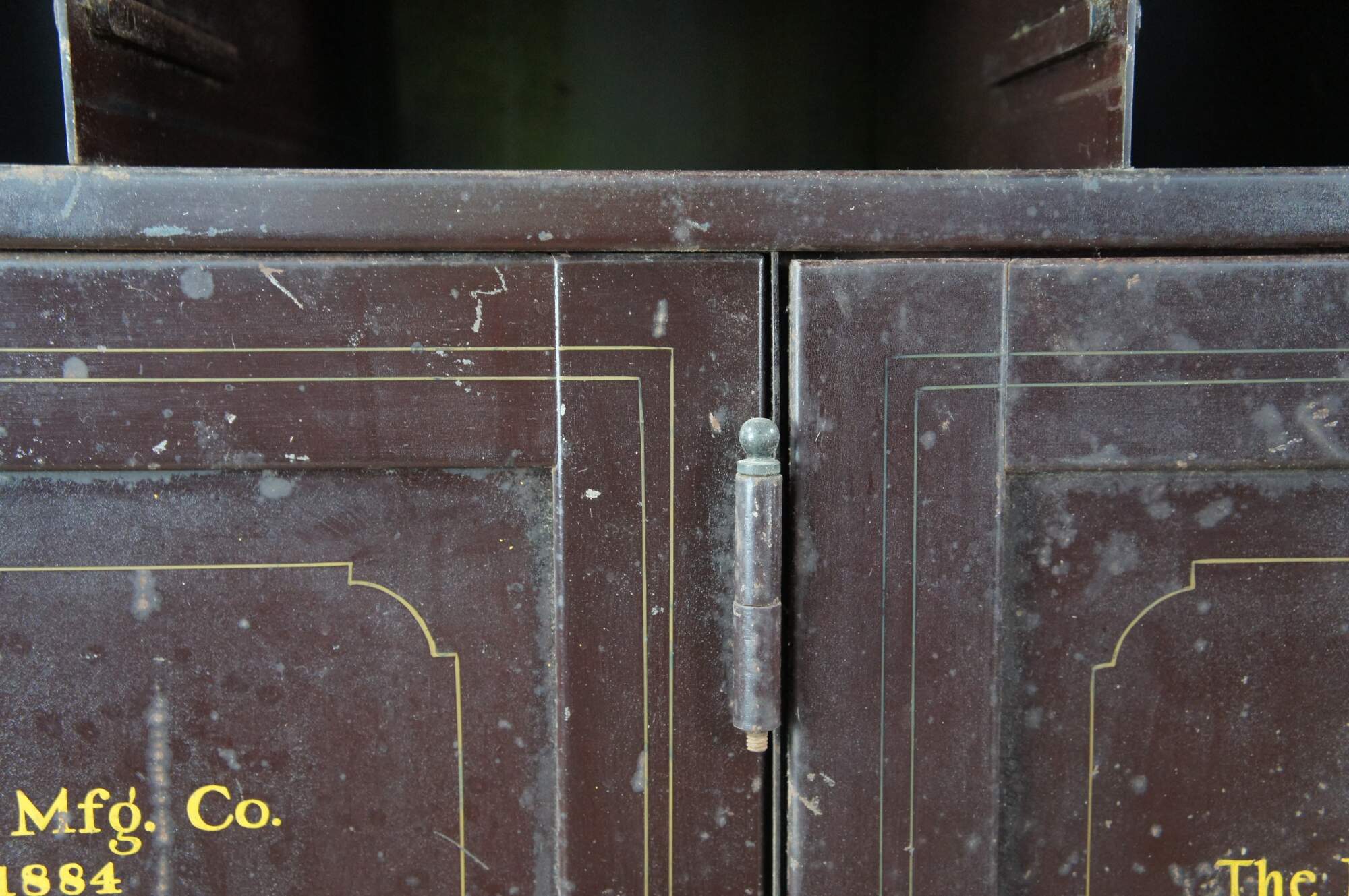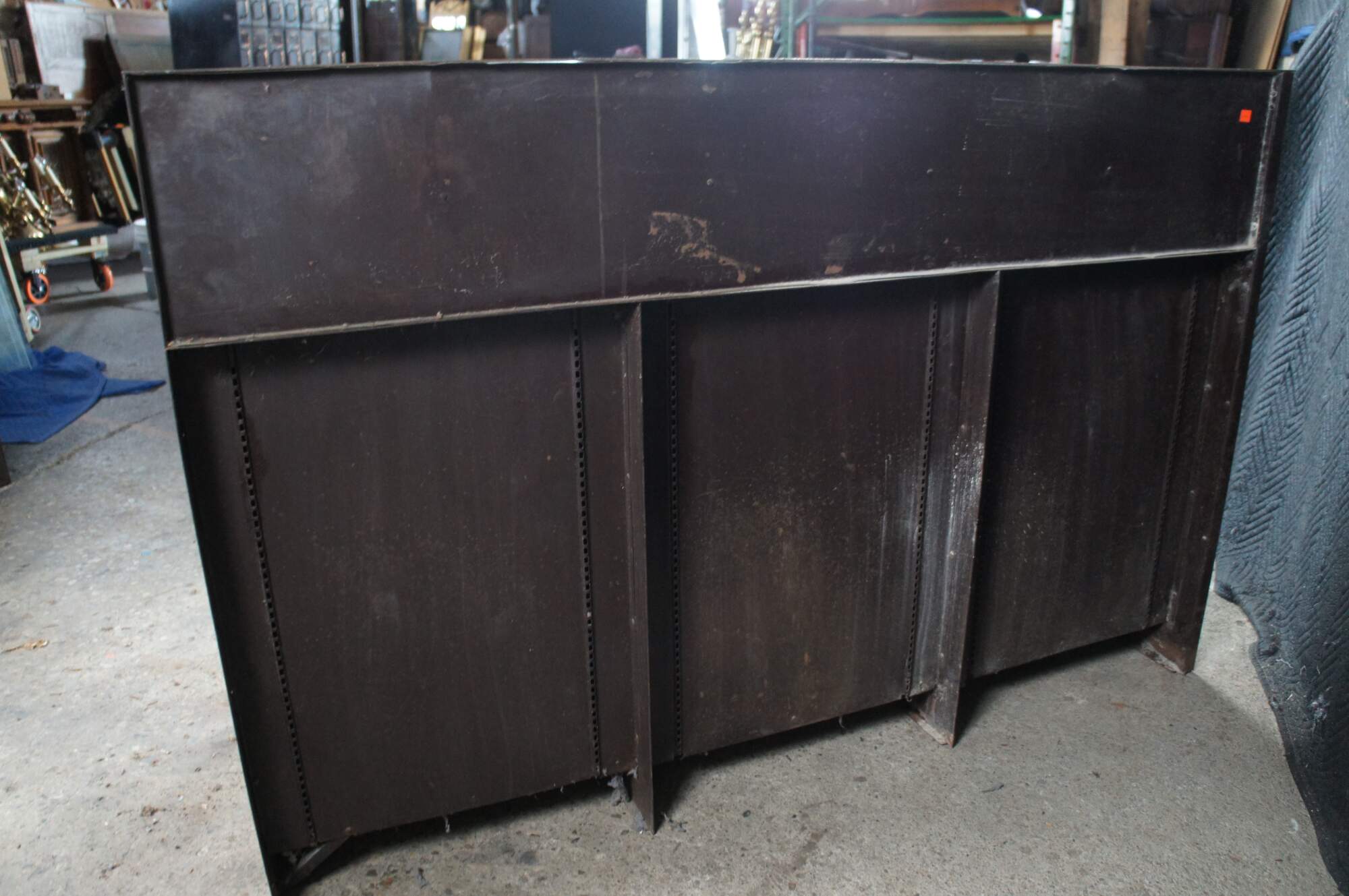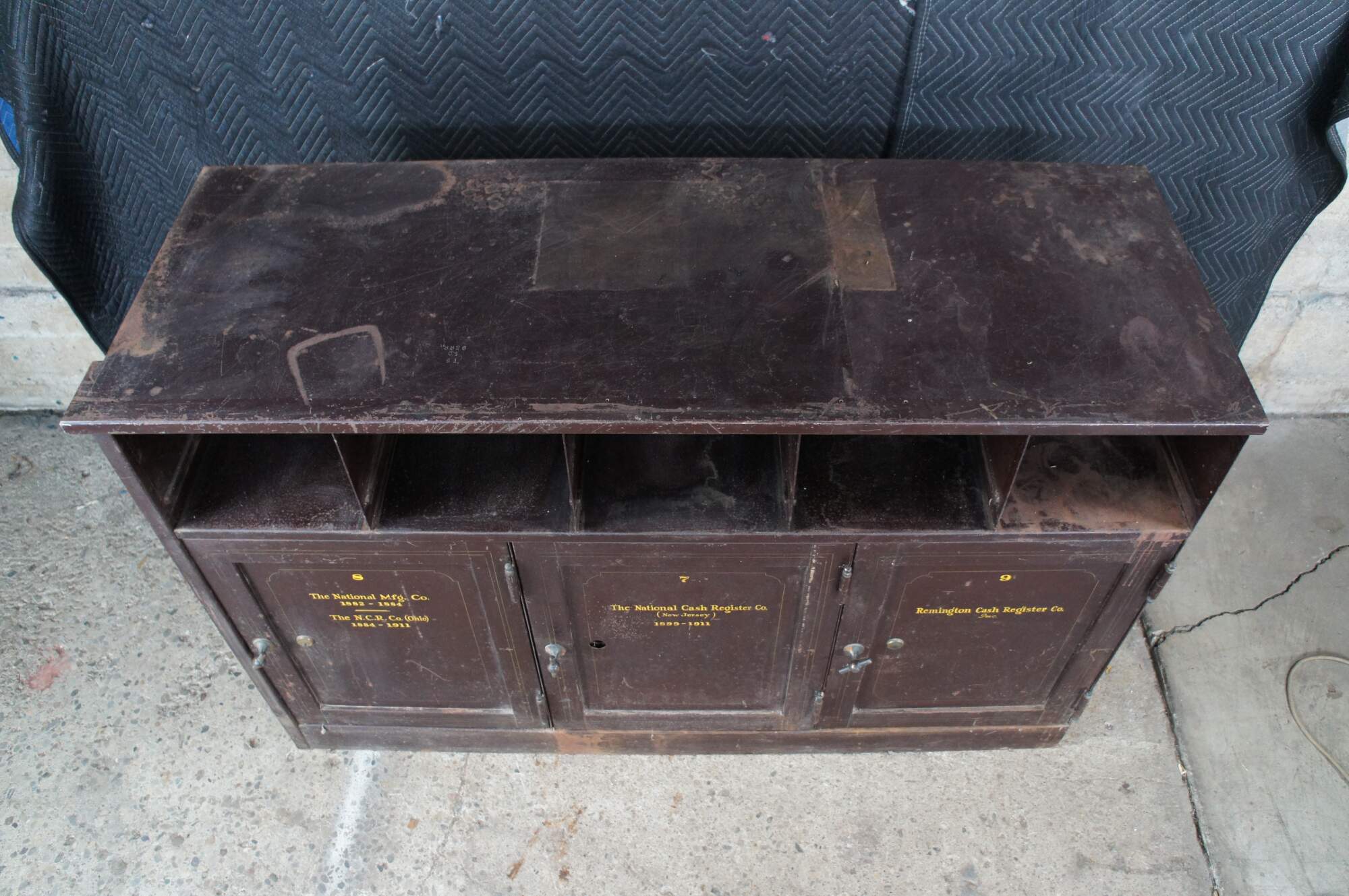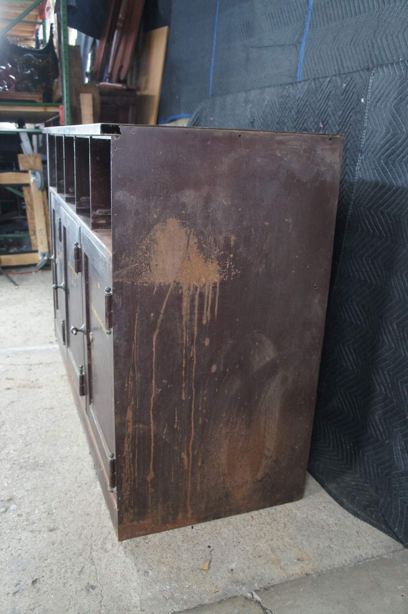 Rare antique fireproof catalogue storage cabinet from NCR headquarters in Dayton Ohio. This cabinet was part of the original corporate offices and were salvaged from the top floor before demolition. It features top cubbies and three lower safes.