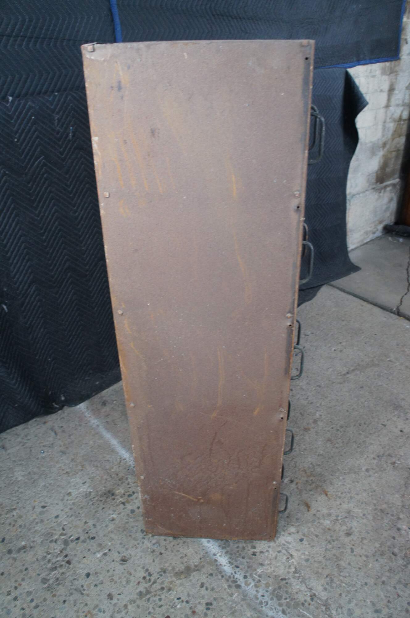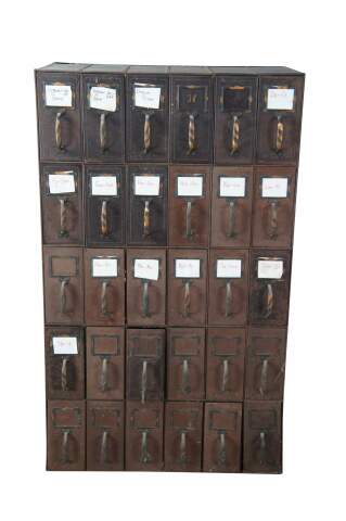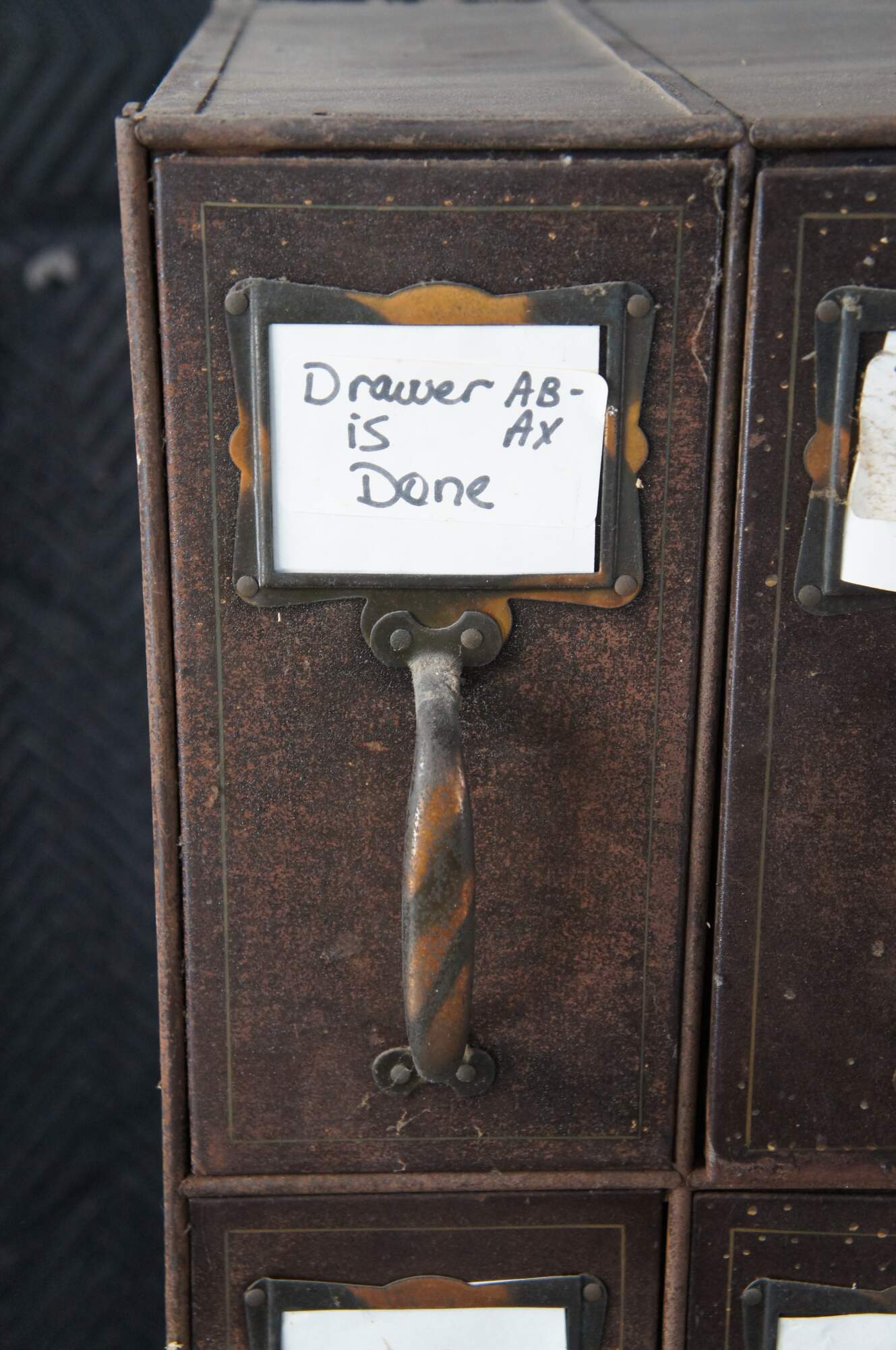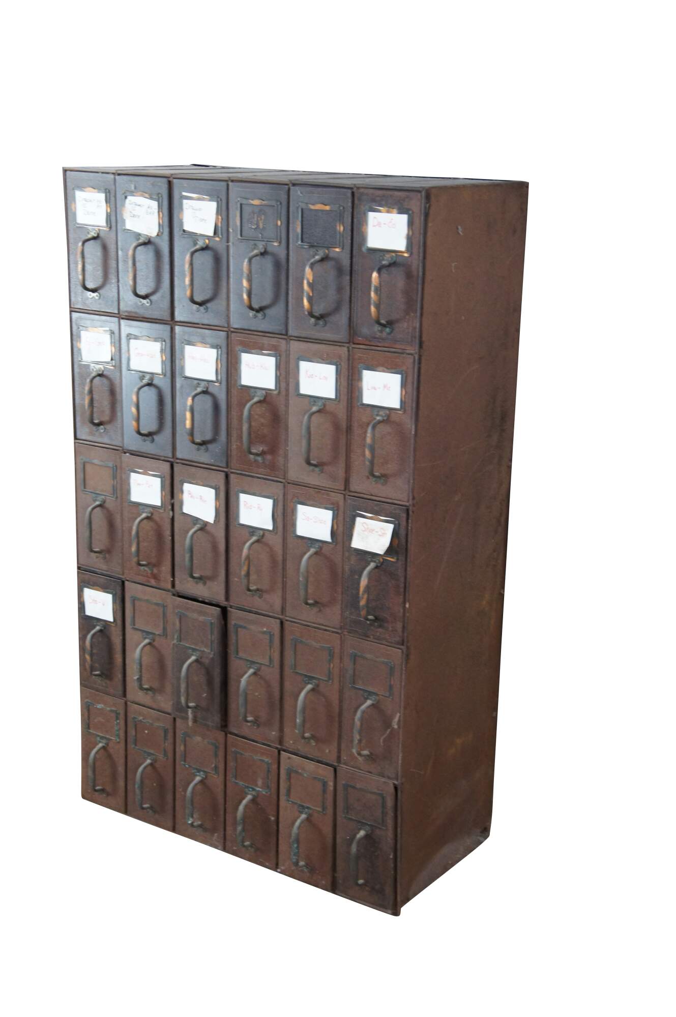 Rare antique fireproof card / index / courthouse file catalogue cabinet from NCR headquarters in Dayton Ohio. This cabinet was part of the original corporate offices and were salvaged from the top floor before demolition. It features 30 apothecary style pull out drawers and a roll down tambor door (not currently functional).