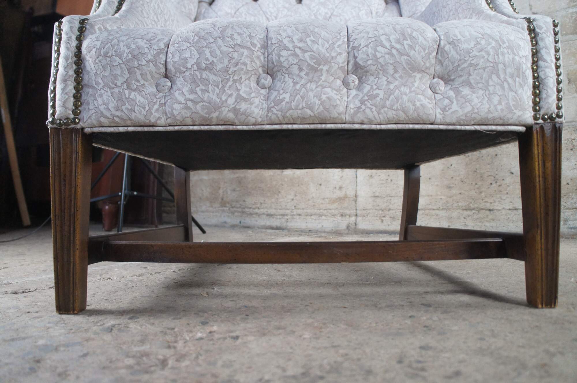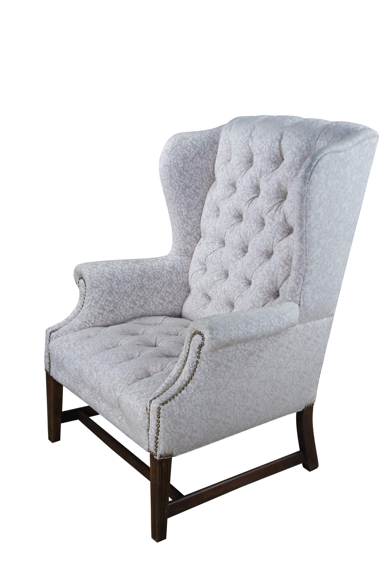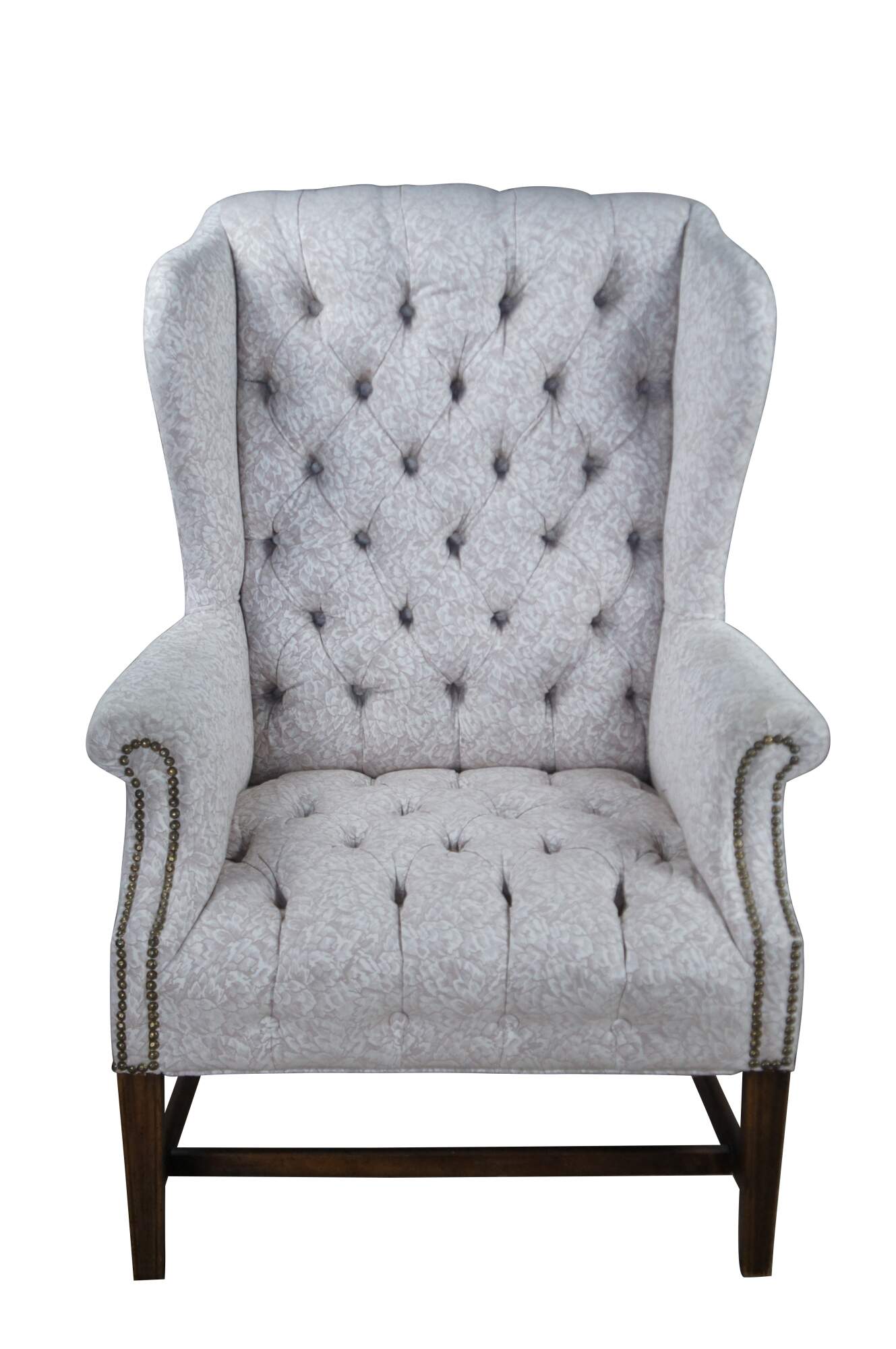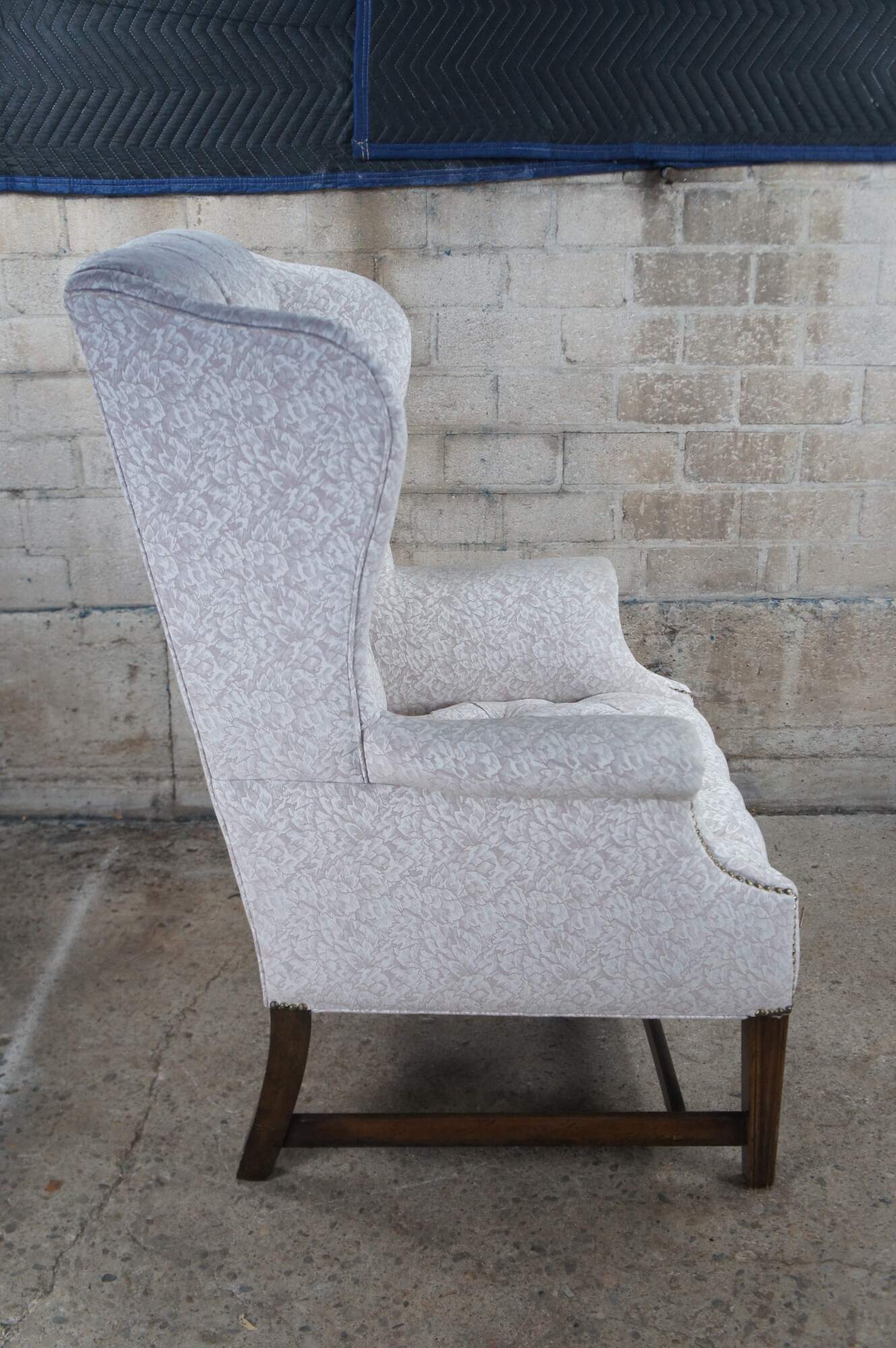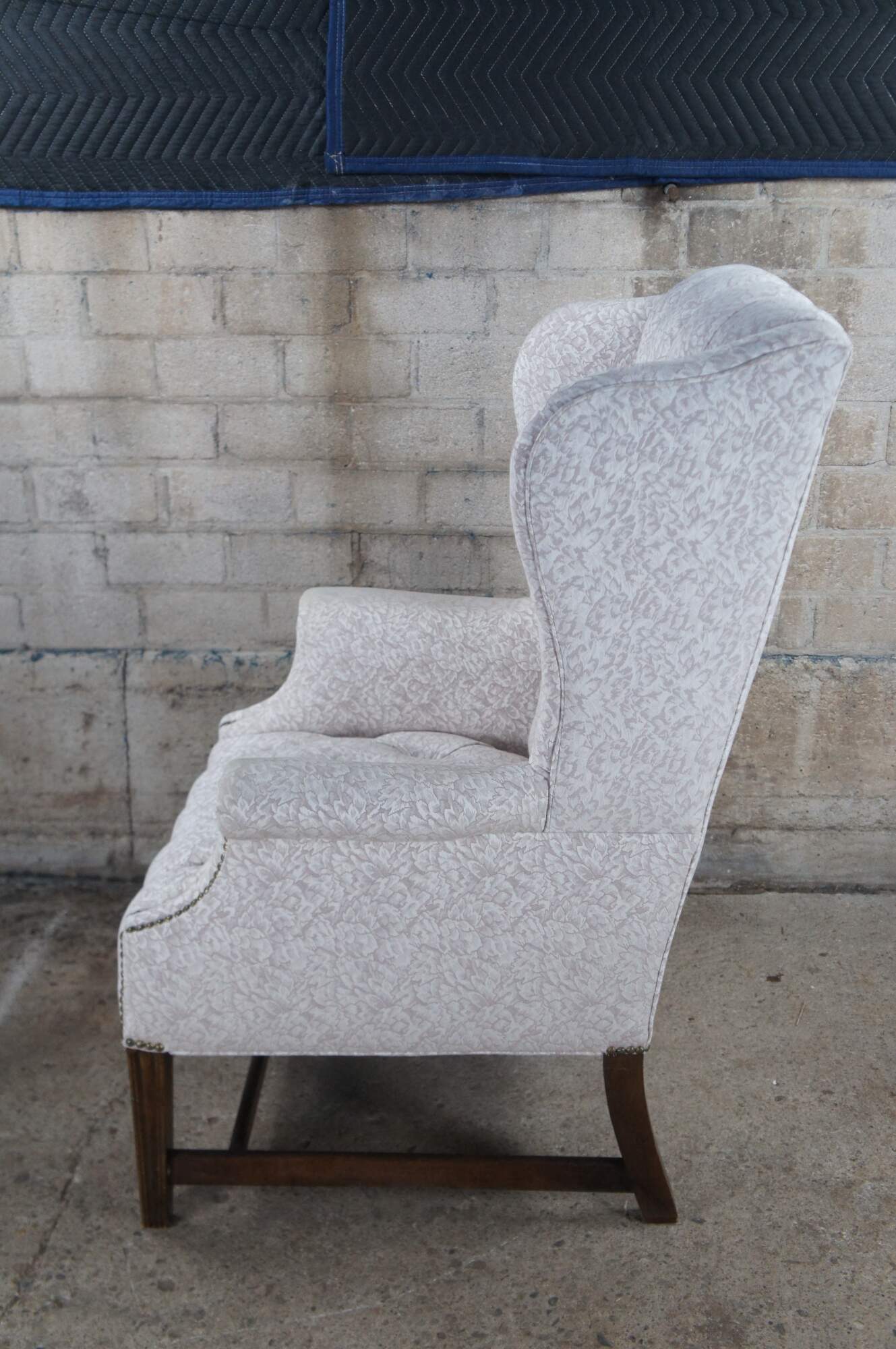 English Chippendale style wingback chair, circa last quarter 20th century. Made from mahogany with a foliate upholstered design, tufted back and nailhead trim. The chair is supported by square tapered legs connected by an H stretcher.