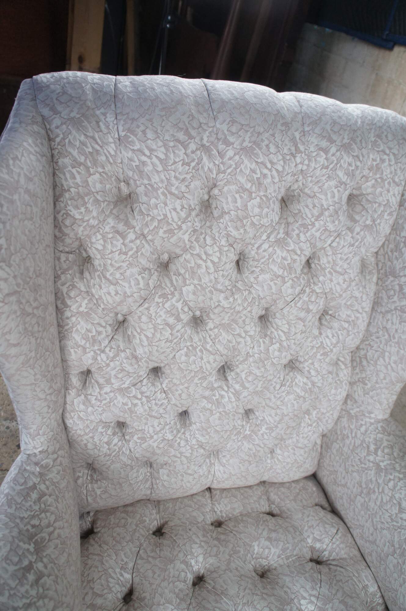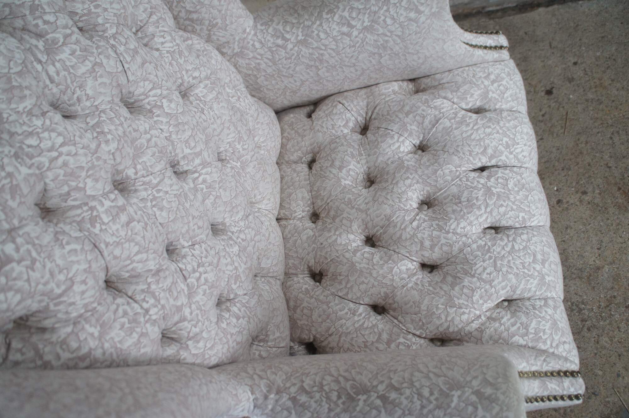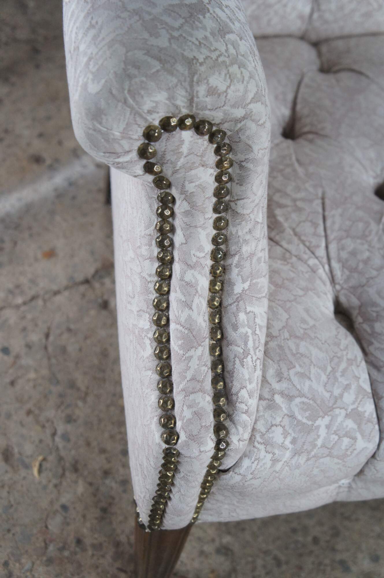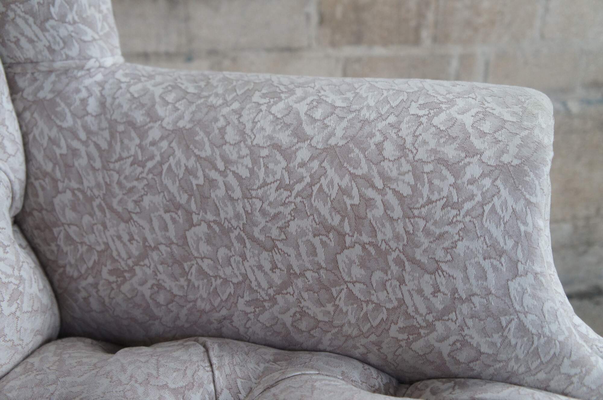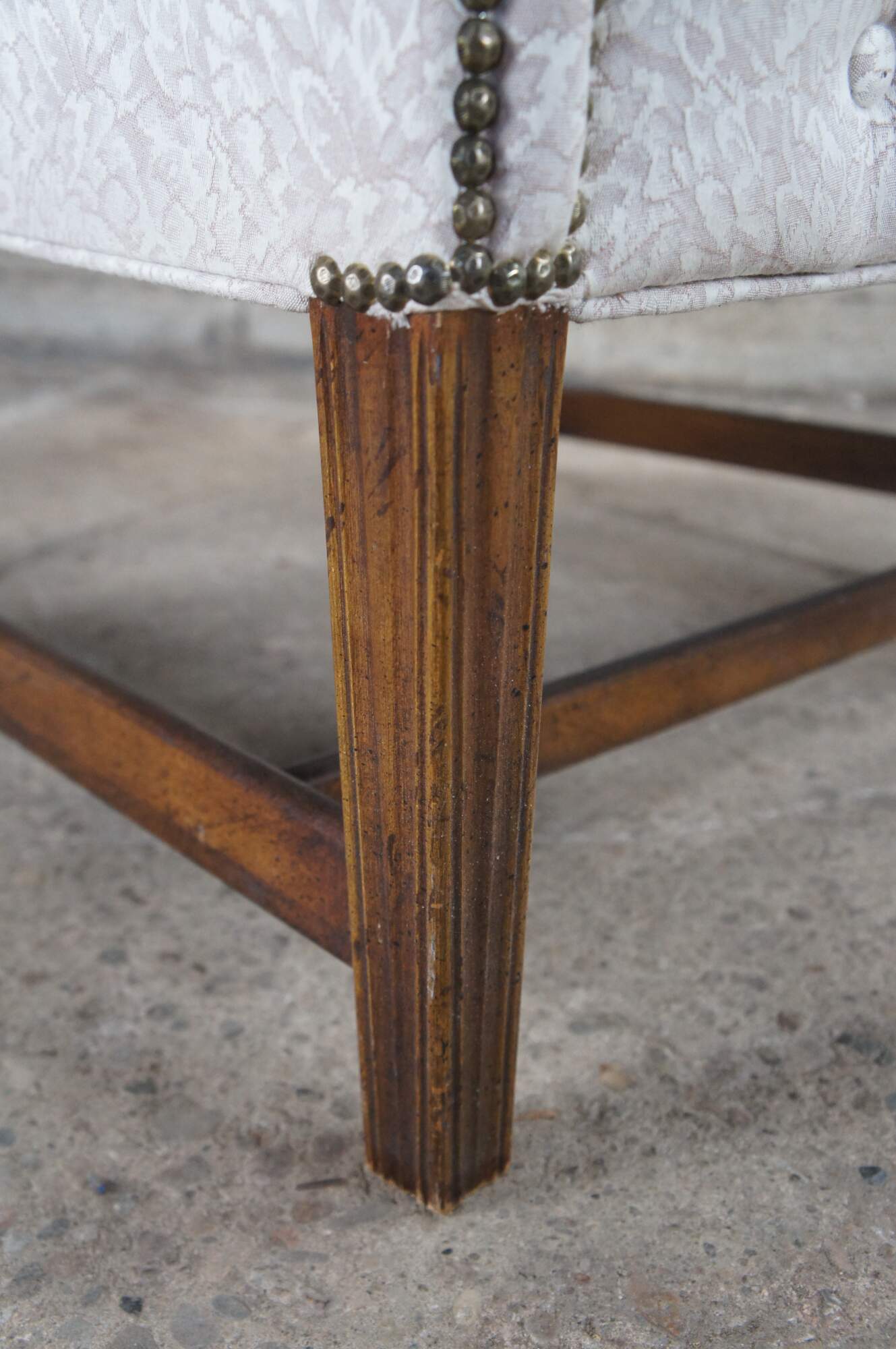 English Chippendale style wingback chair, circa last quarter 20th century. Made from mahogany with a foliate upholstered design, tufted back and nailhead trim. The chair is supported by square tapered legs connected by an H stretcher.