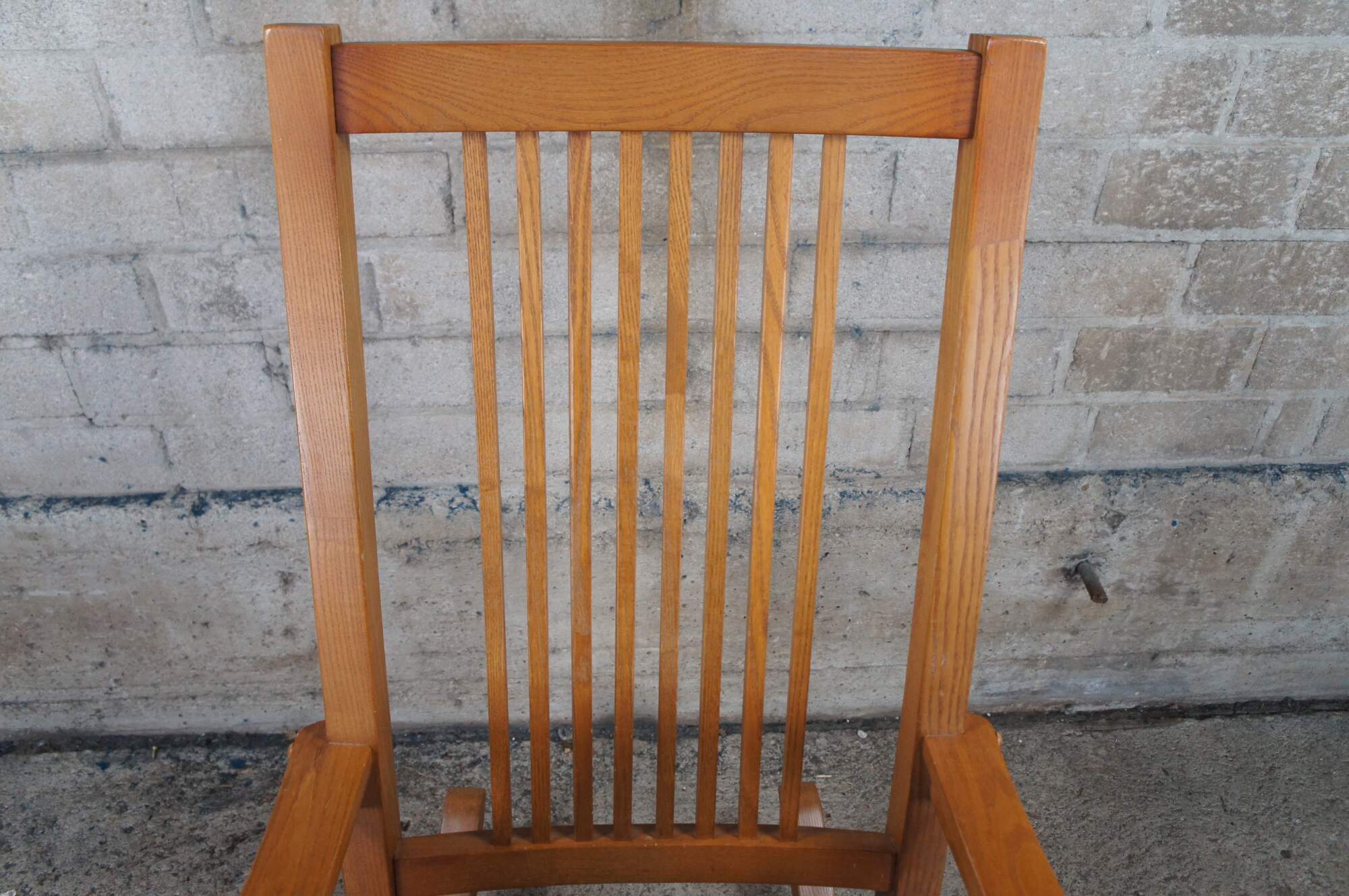 Early 21st Century rocking chair from Bassett Furniture Industries. Made from oak in Mission styling with smooth streamlined slat back and sides. The rocker features a geometric diamond pattern upholstered seat. Circa 2005