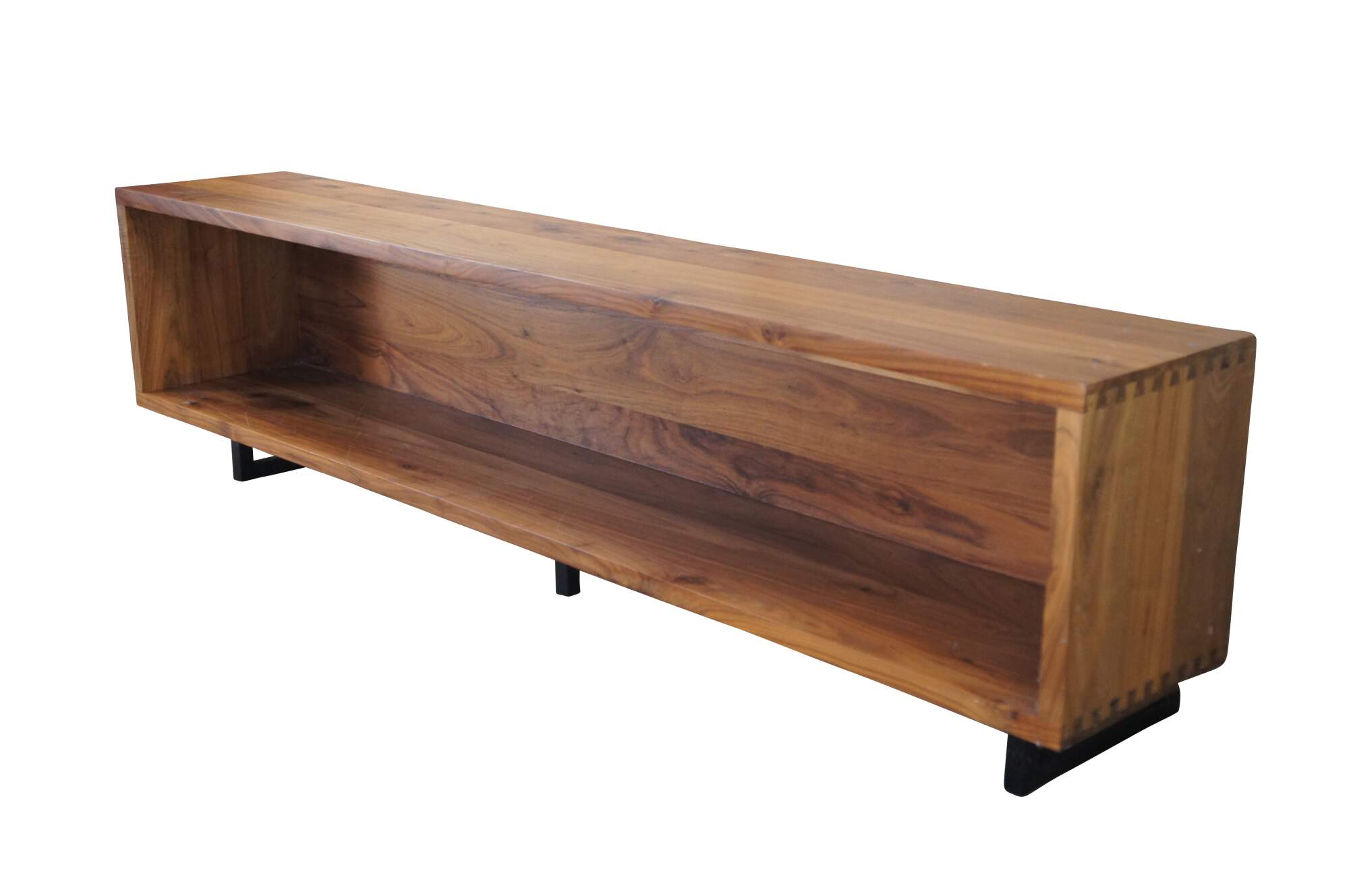 Early 21st Century Crate & Barrel Atwood Footboard. Could be repurposed and used as a console, low bookcase, or tv stand. Made from black walnut with dovetailed joints and a steel base. Originally connected to side rails and tied into a reclaimed poplar headboard.