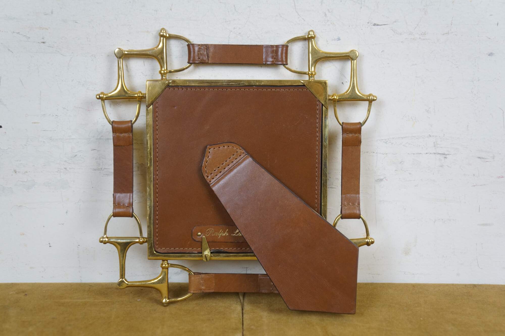 Ralph Lauren Austen Horsebit Corner Frame. Square picture / photo frame trimmed with brass horse bits and brown leather straps. Easel back.