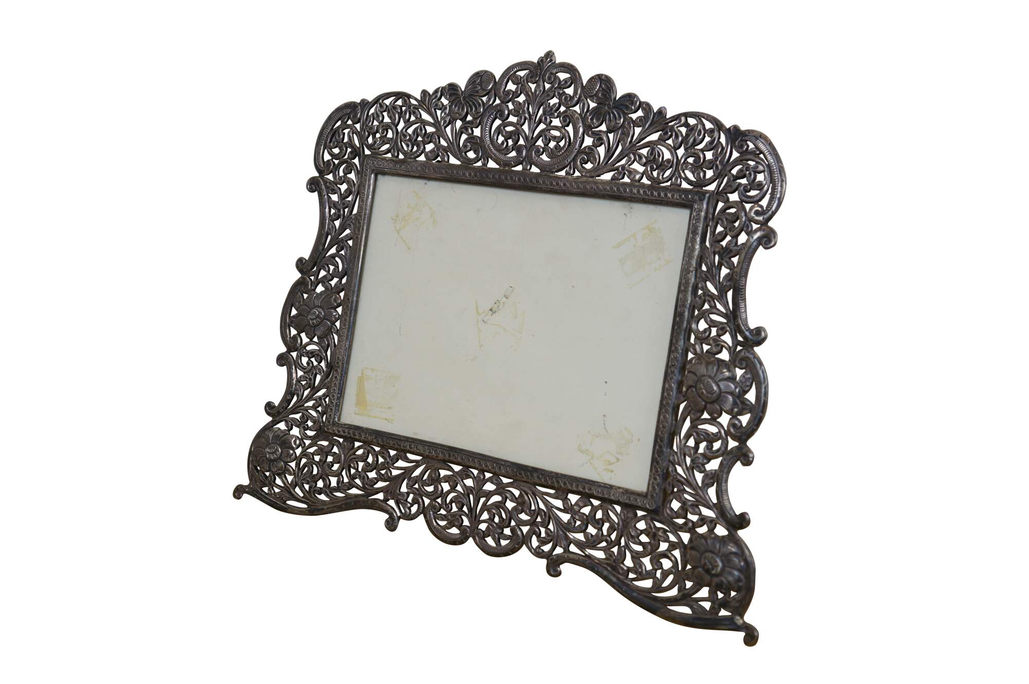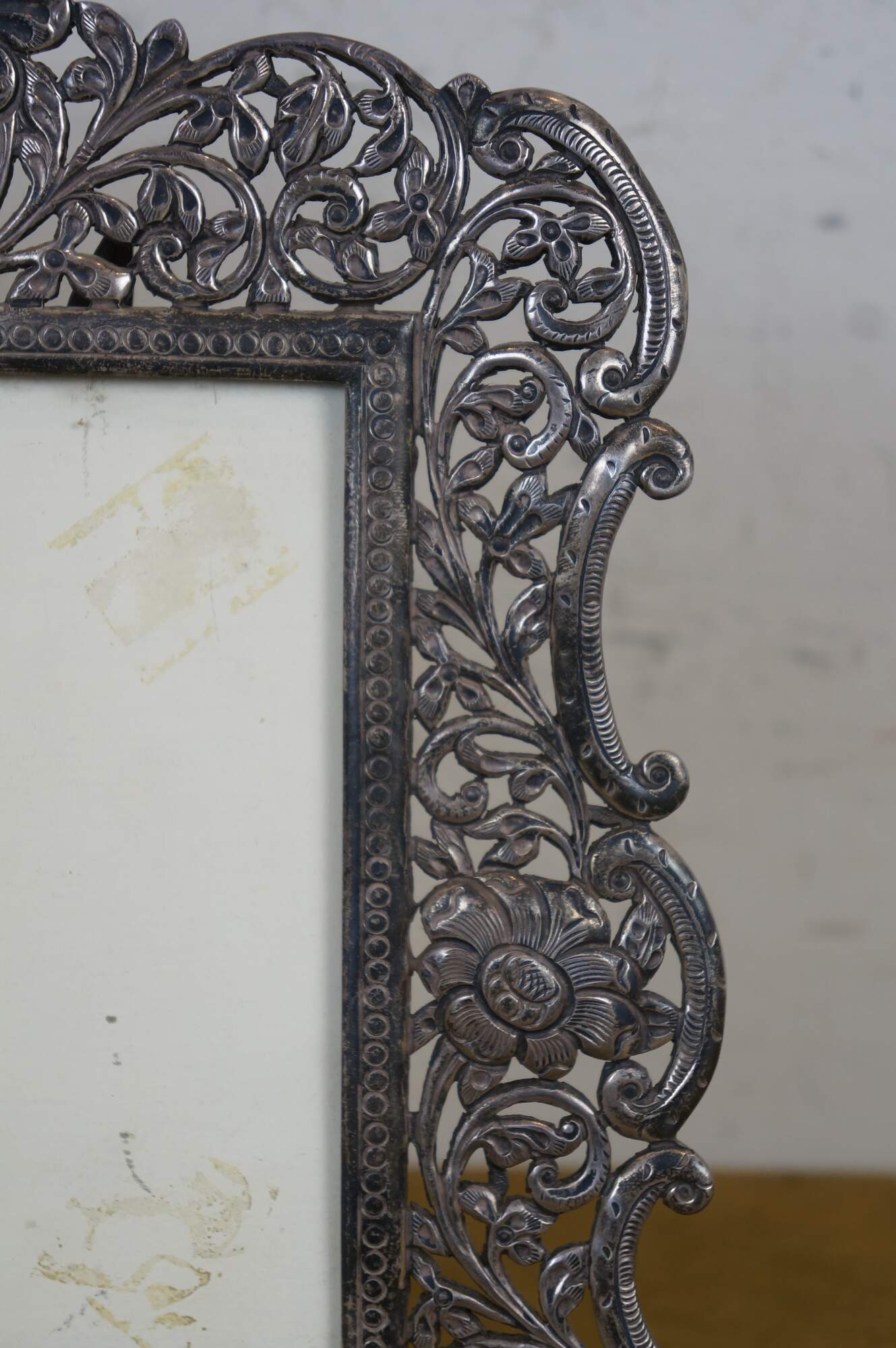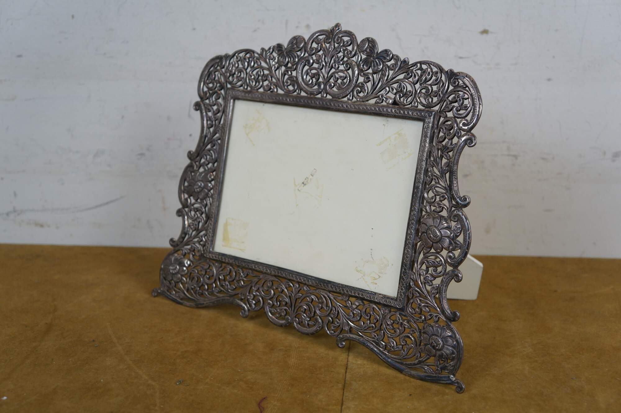 925 sterling silver art nouveau style horizontal rectangular picture / photo frame featuring pierced, swirling floral and foliate filigree. Easel back.