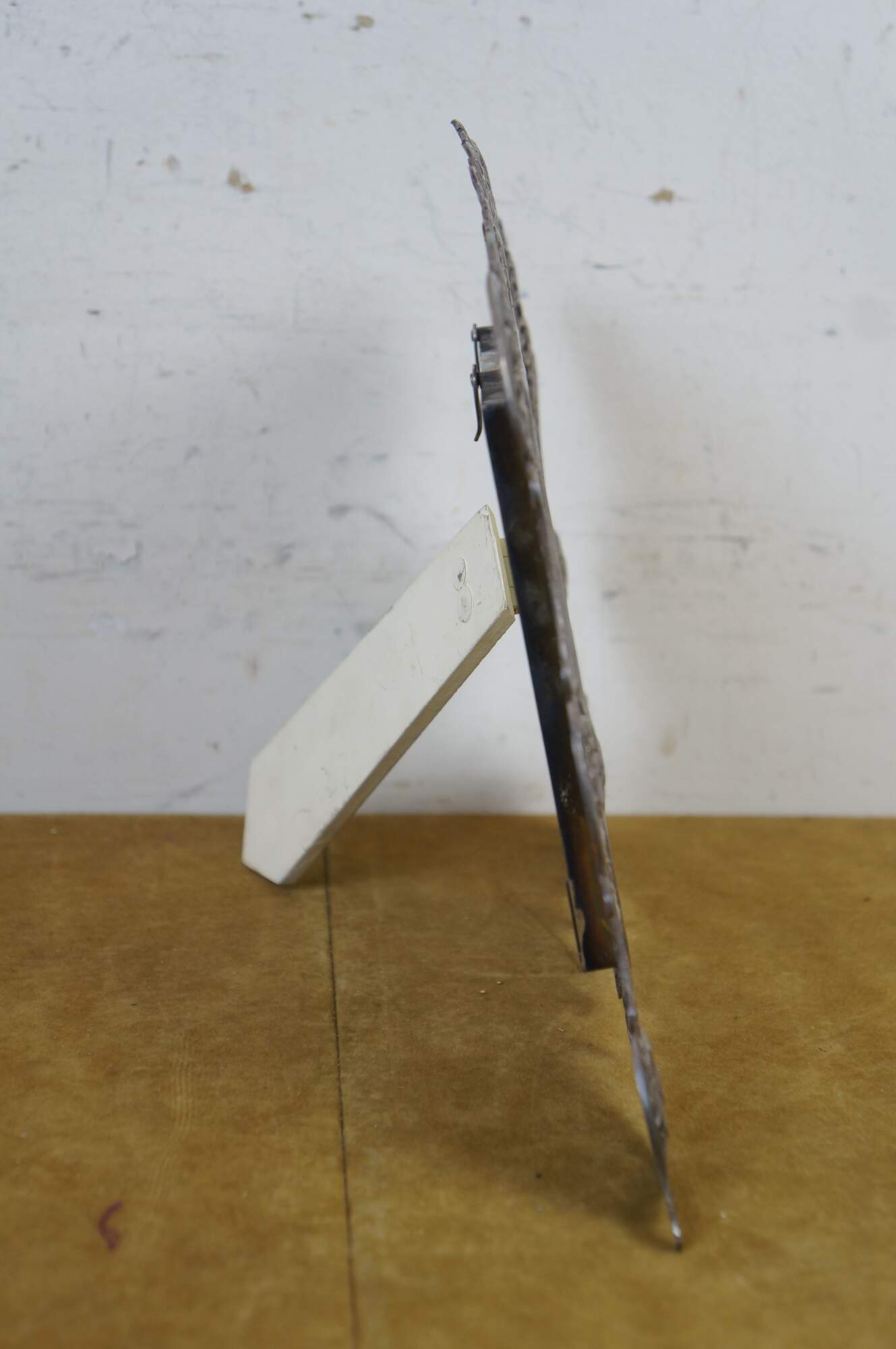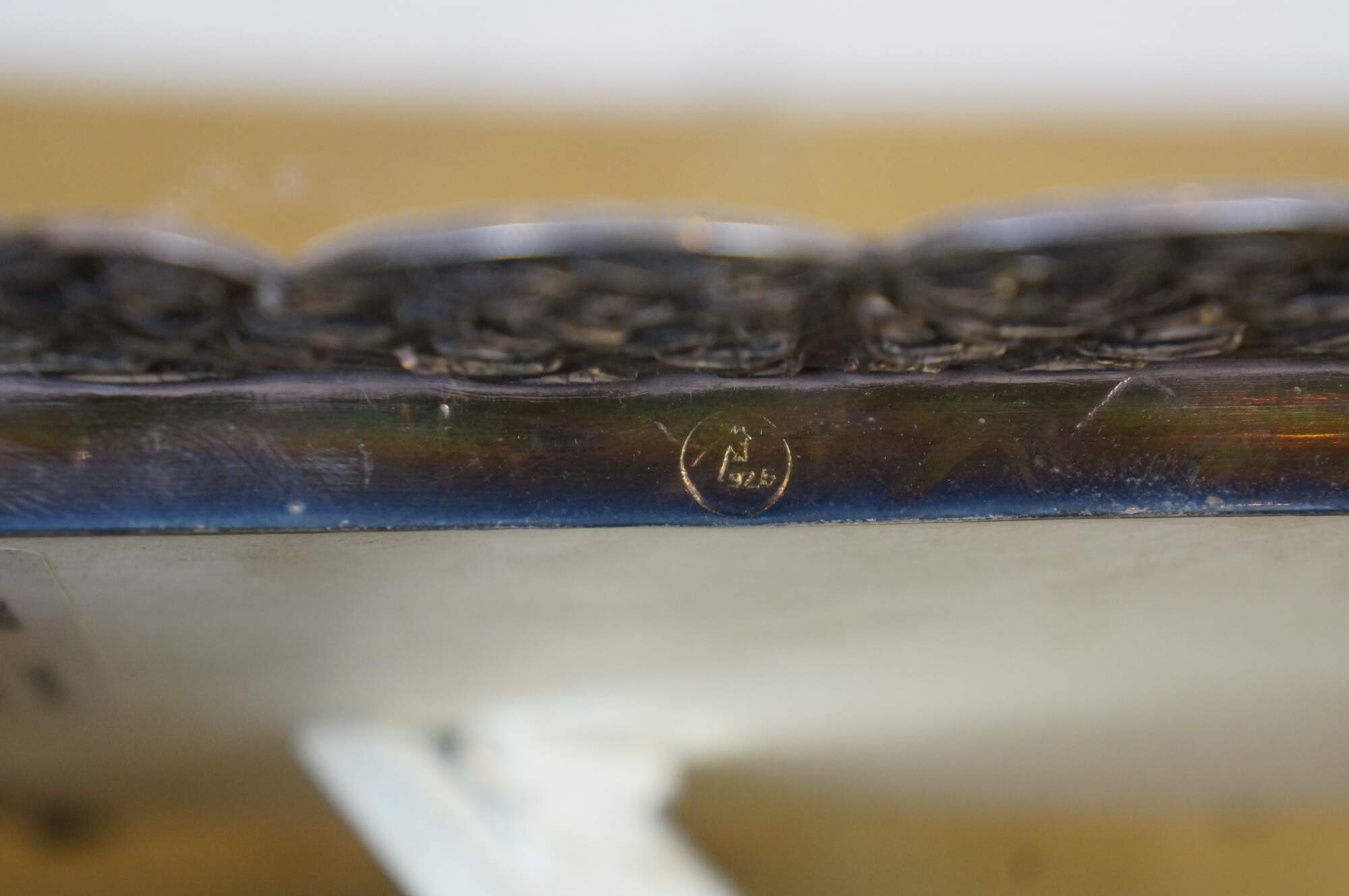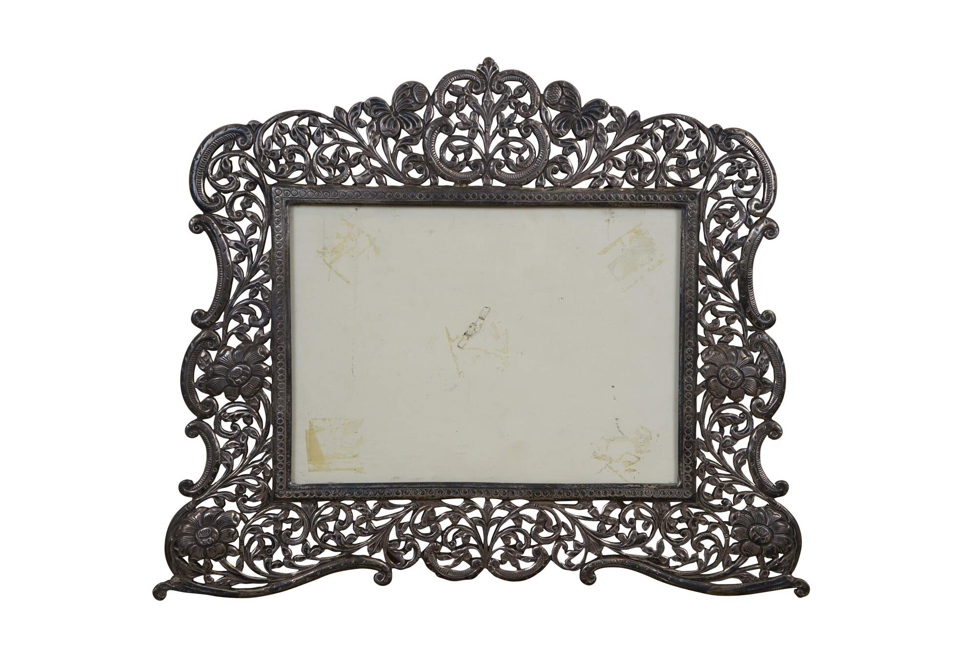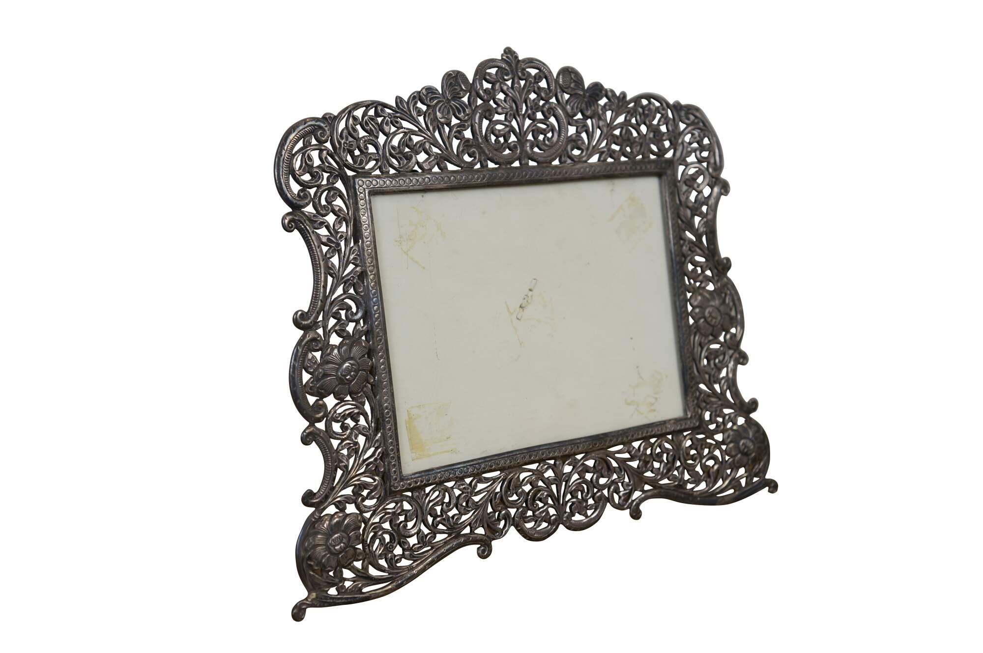 925 sterling silver art nouveau style horizontal rectangular picture / photo frame featuring pierced, swirling floral and foliate filigree. Easel back.