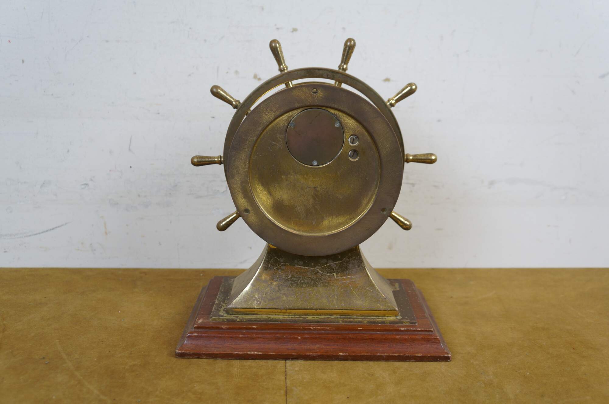 Late 20th century Salem Ships Bell desk / table clock. Brass case in the shape of a porthole surrounded by a ship's wheel / helm, set on a rectangular wood base. Champagne gilt face with black Arabic numerals and hands. Key wound, 8 Day, Jeweled, Switzerland.