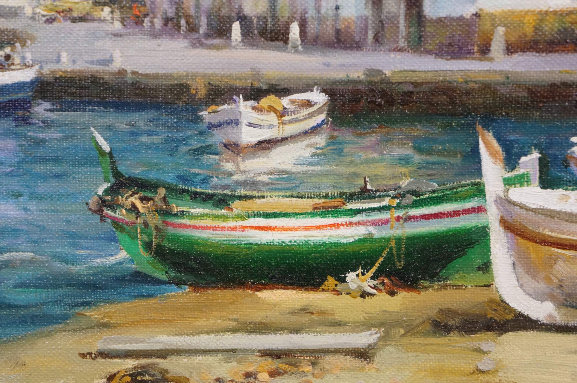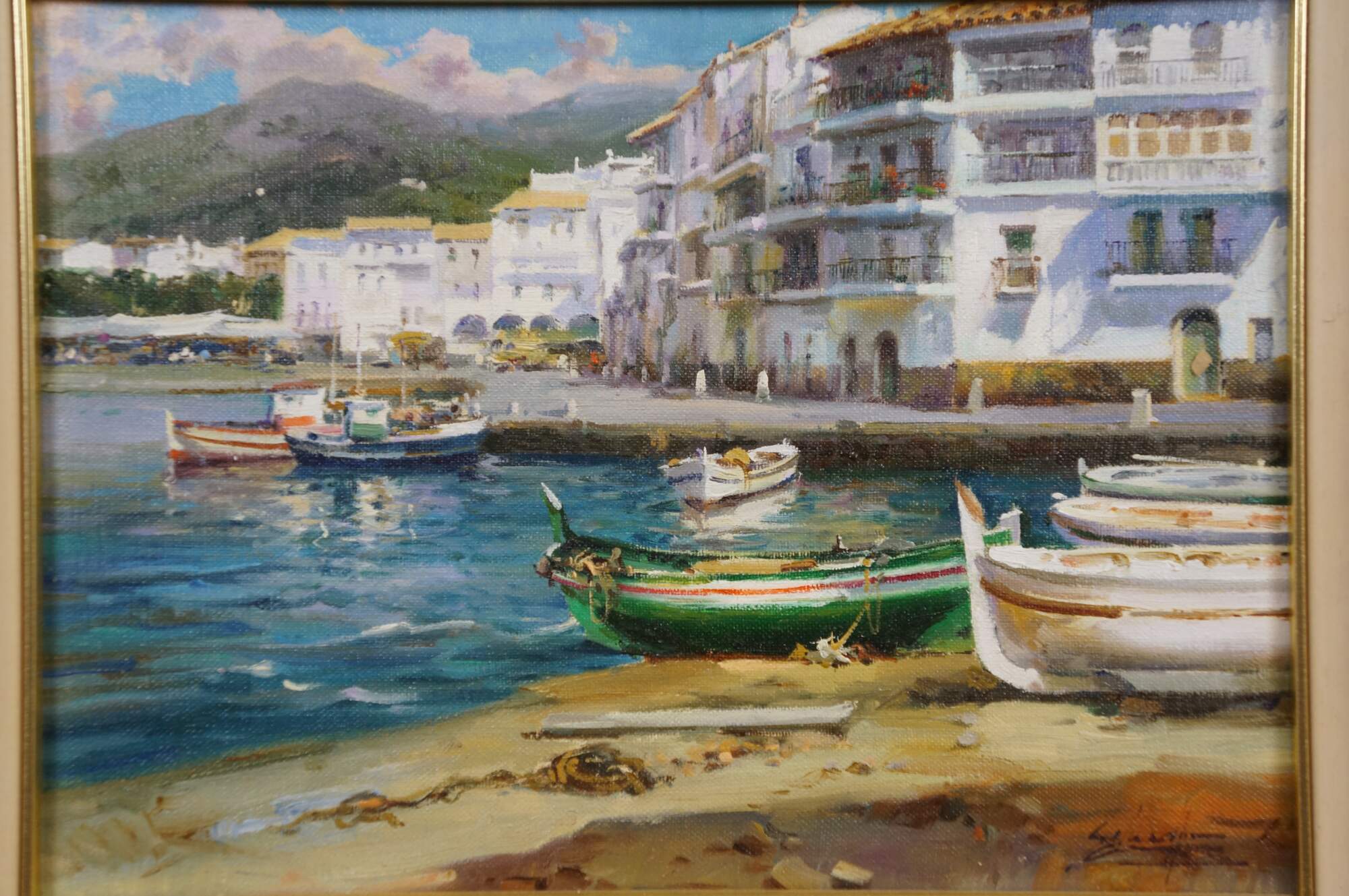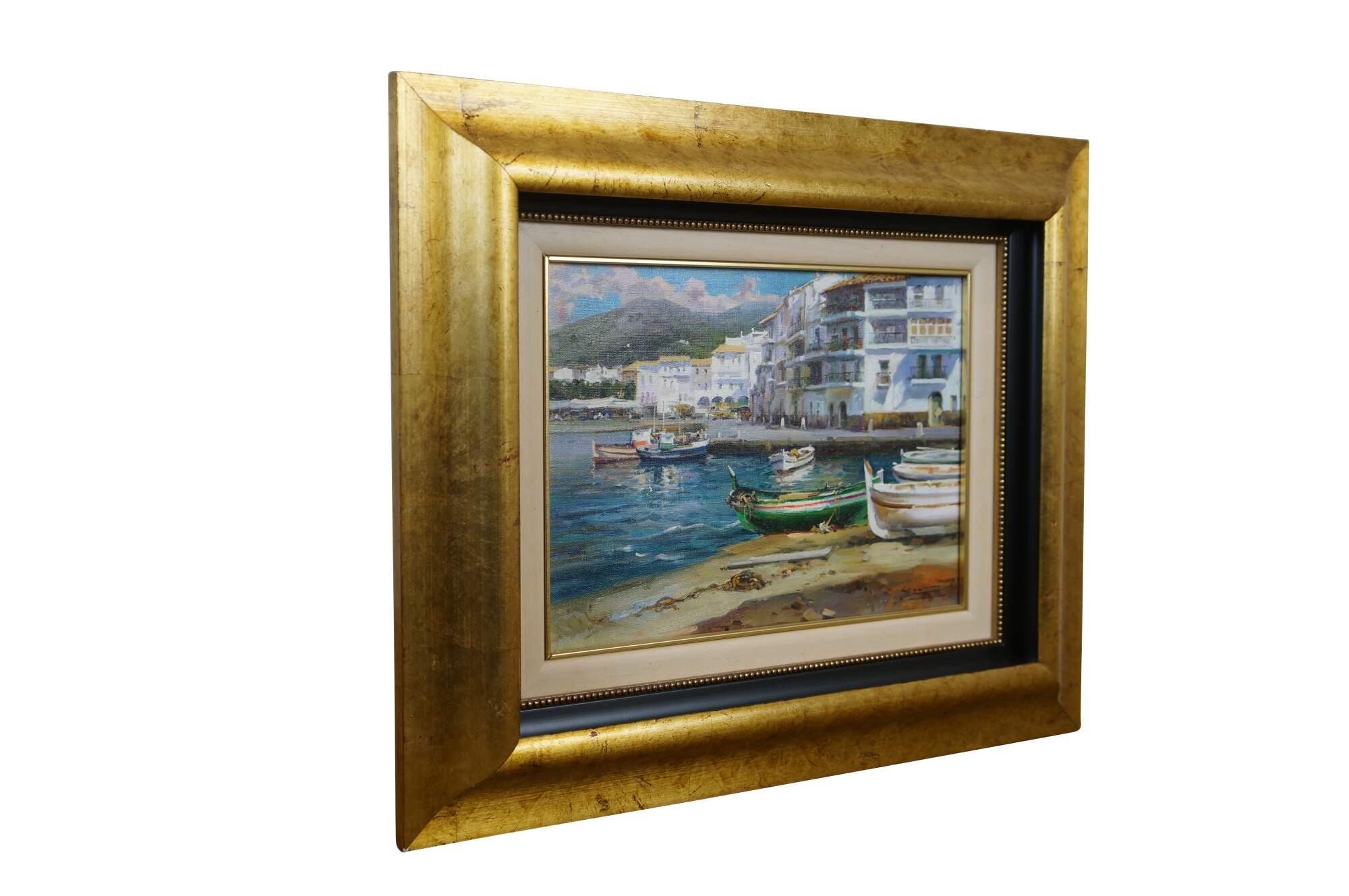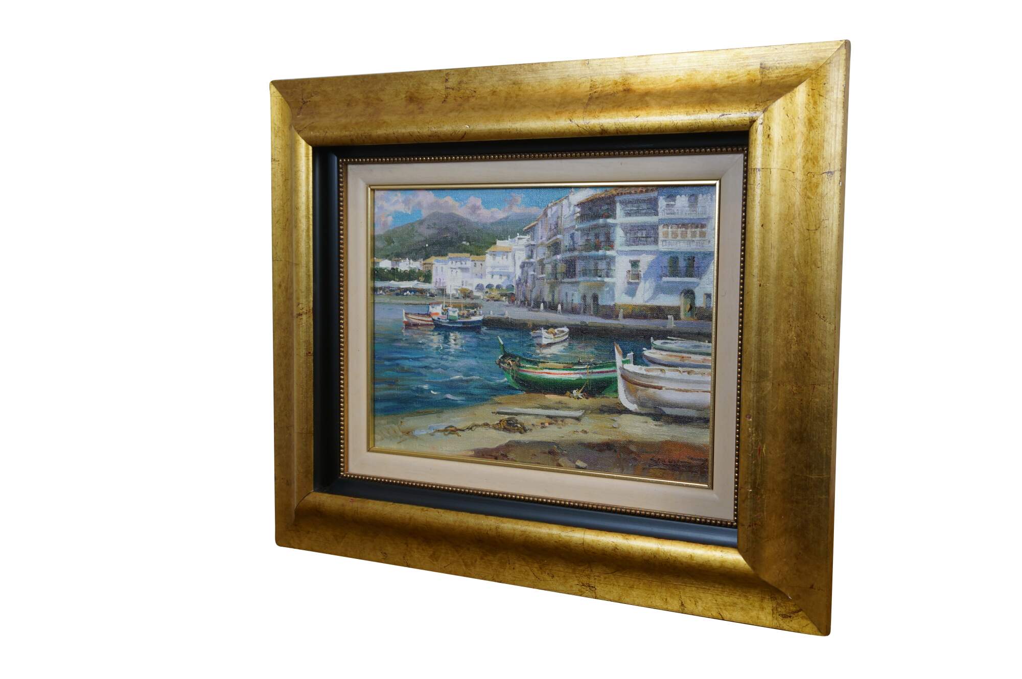 Circa late 20th century oil on canvas painting titled "Rincon de Cadaques - Costa Brava" by Salvador Caballero. Depicts a view from the beach of a street corner and small inlet lined with boats along the waterfront of Cadaques, Spain. Beveled gilt wood frame with black inner border and white fabric mat.