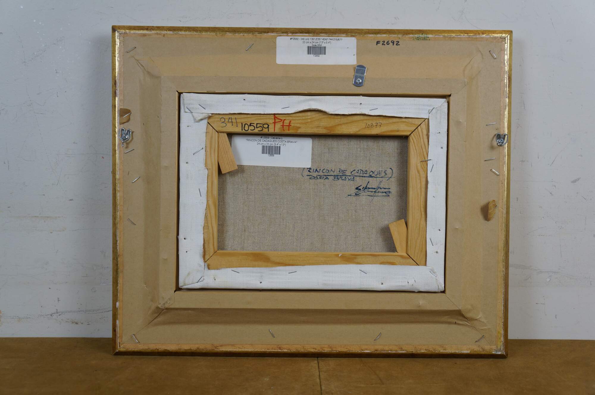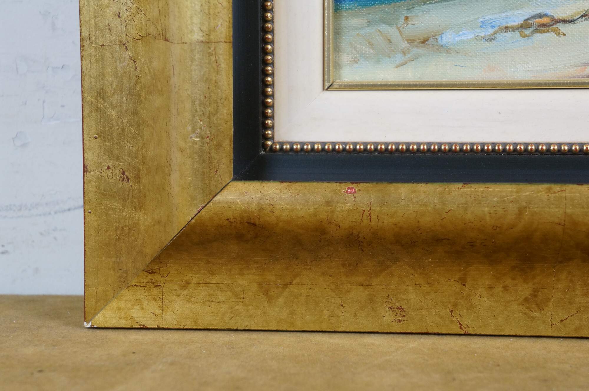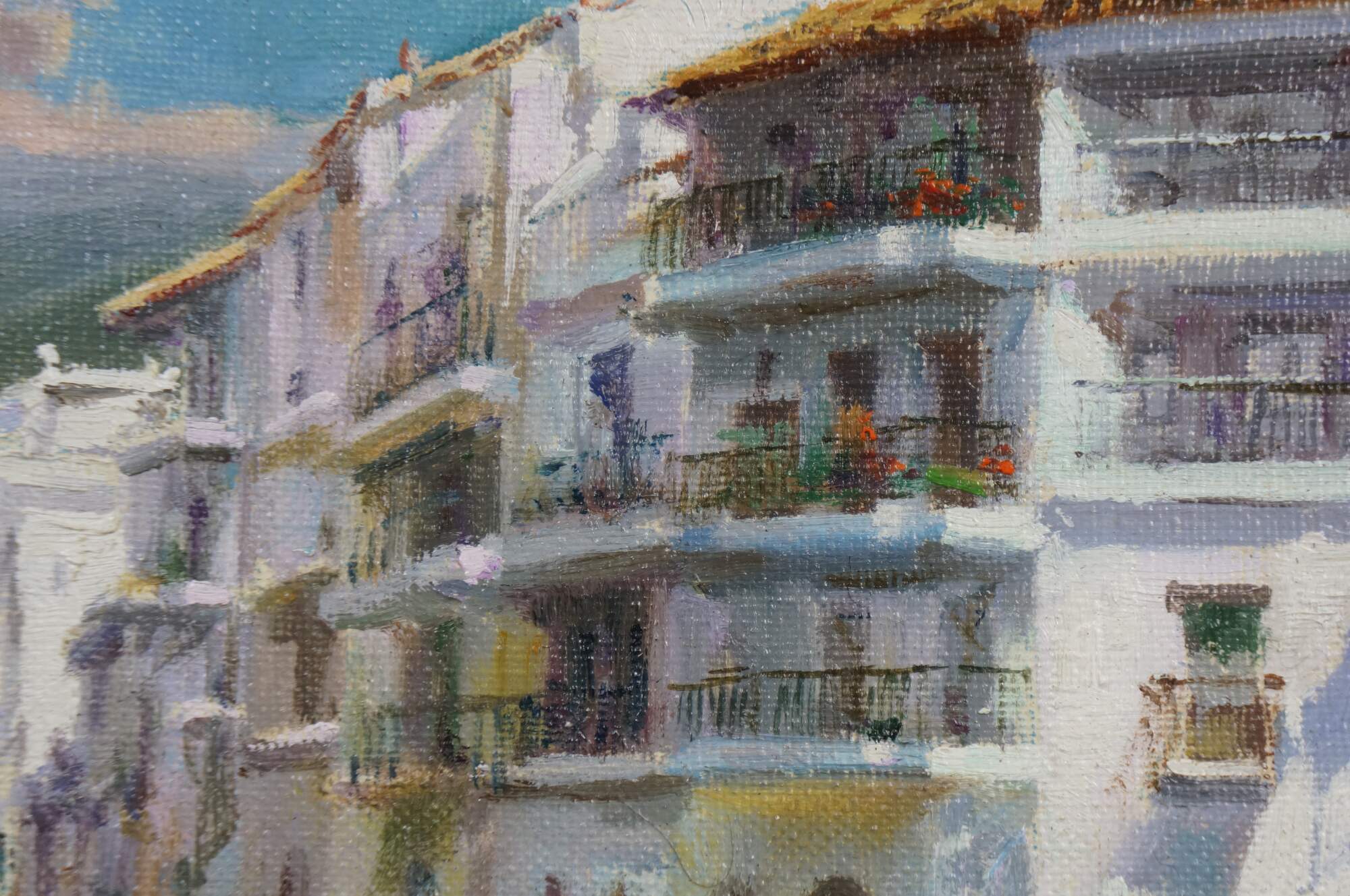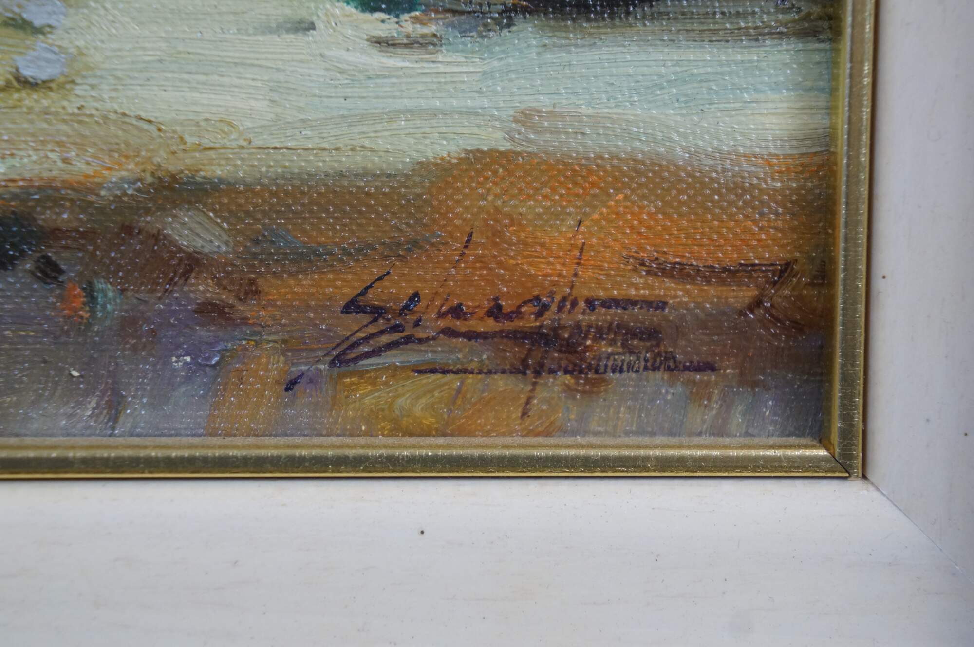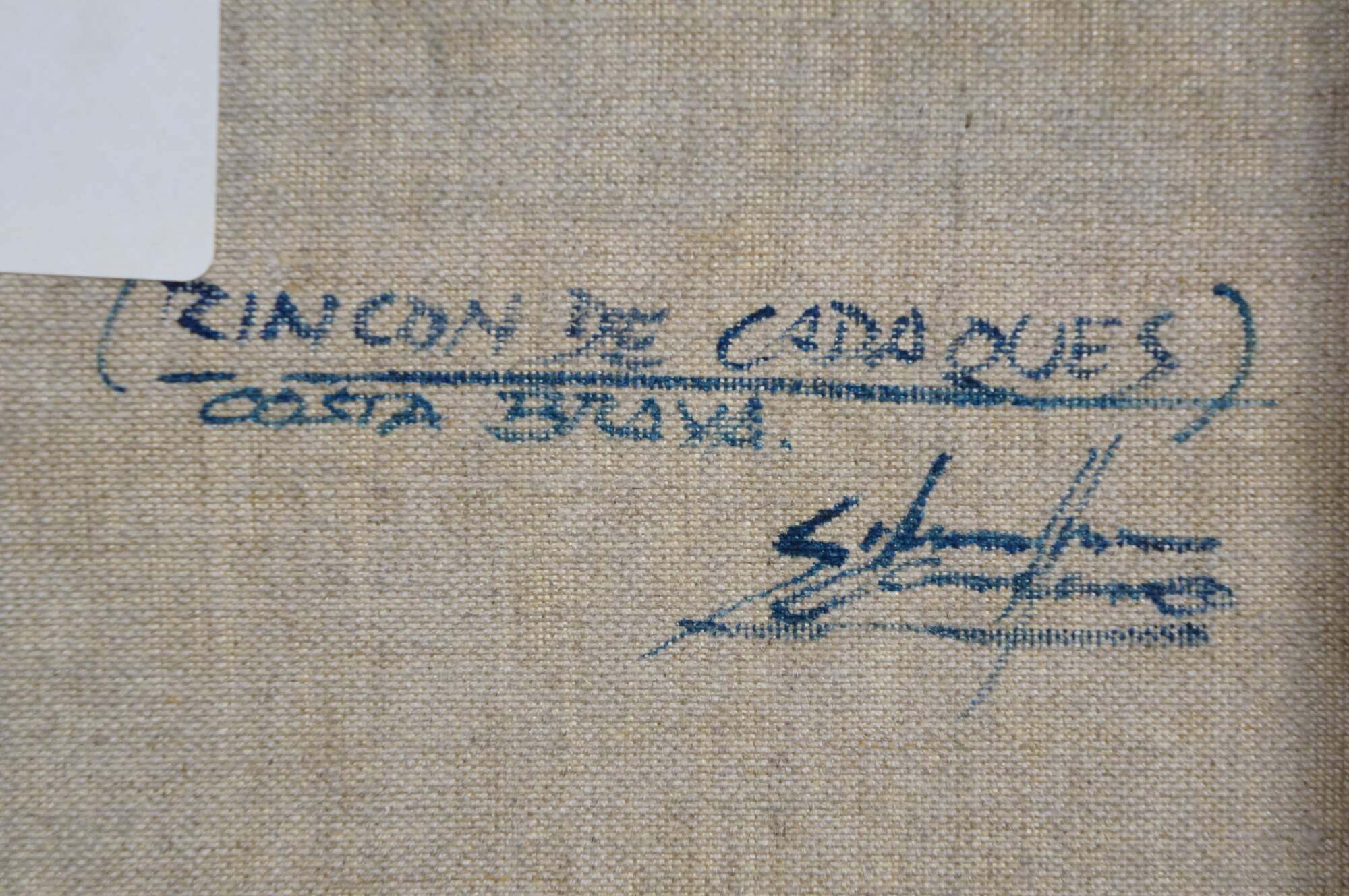 Circa late 20th century oil on canvas painting titled "Rincon de Cadaques - Costa Brava" by Salvador Caballero. Depicts a view from the beach of a street corner and small inlet lined with boats along the waterfront of Cadaques, Spain. Beveled gilt wood frame with black inner border and white fabric mat.