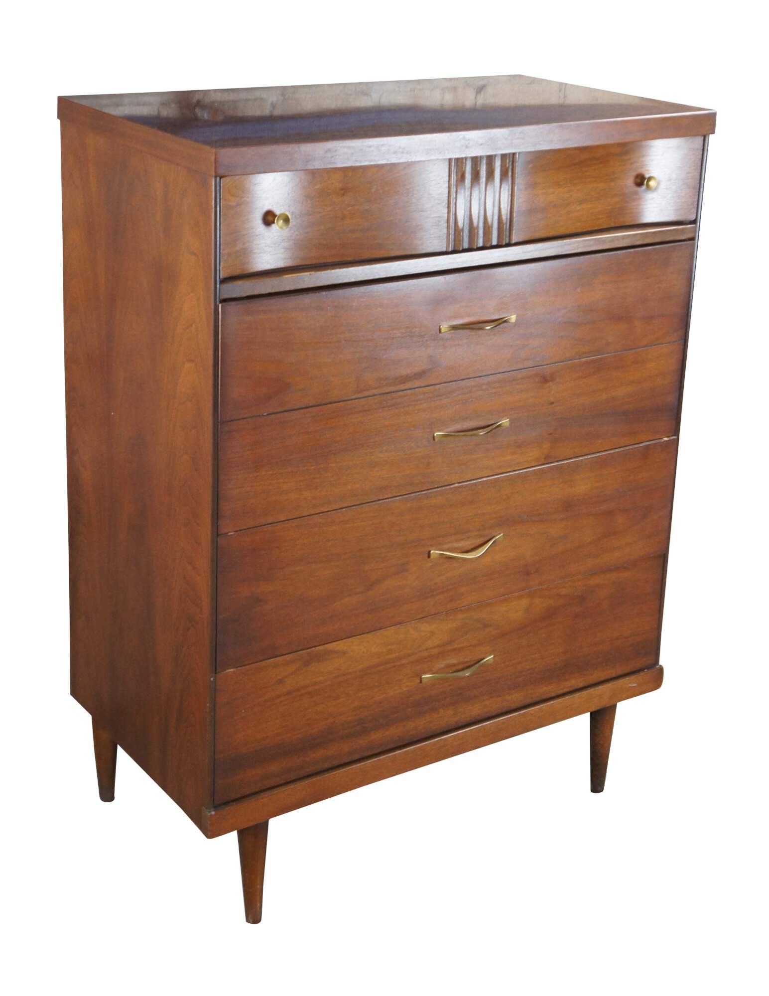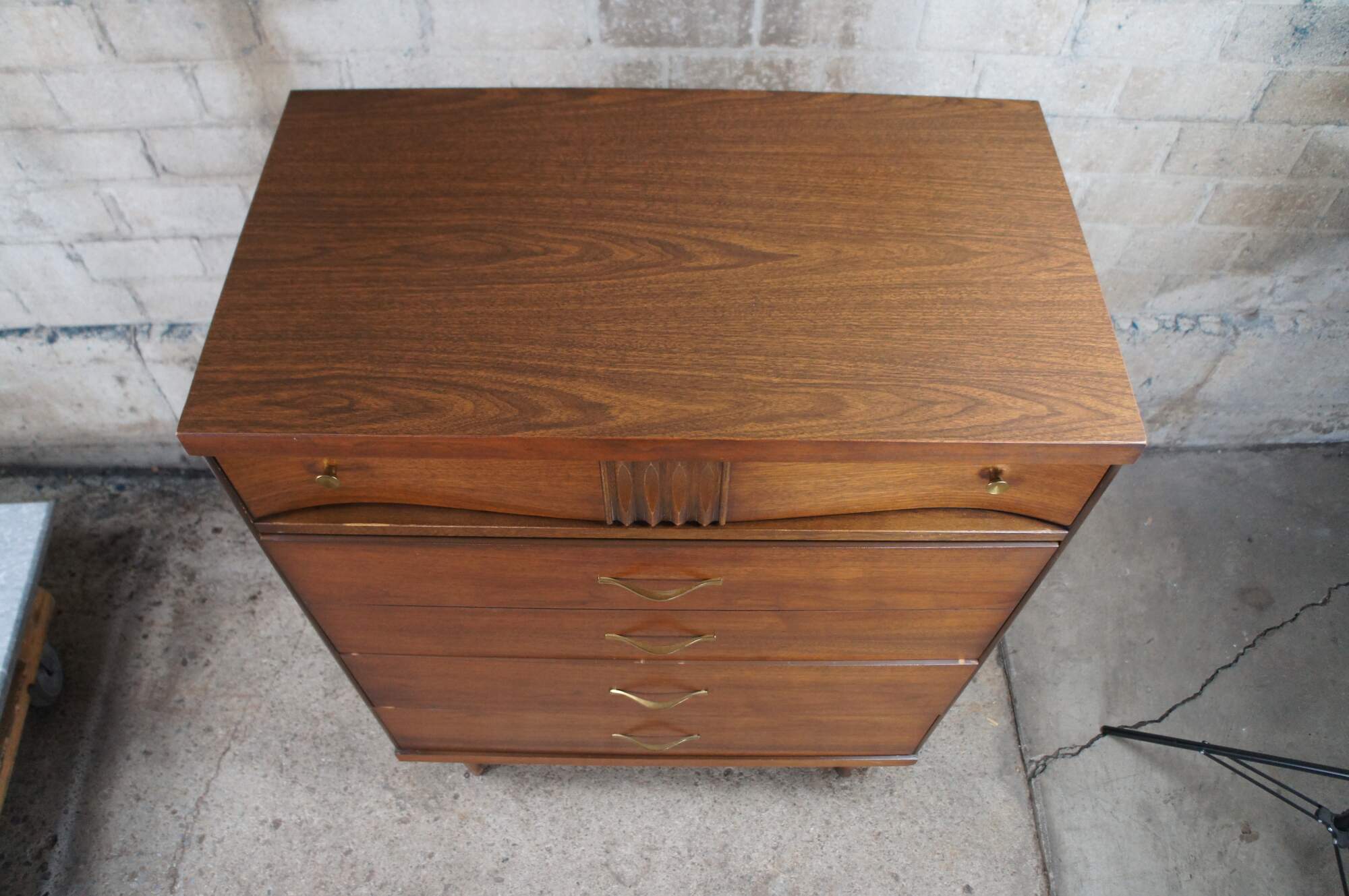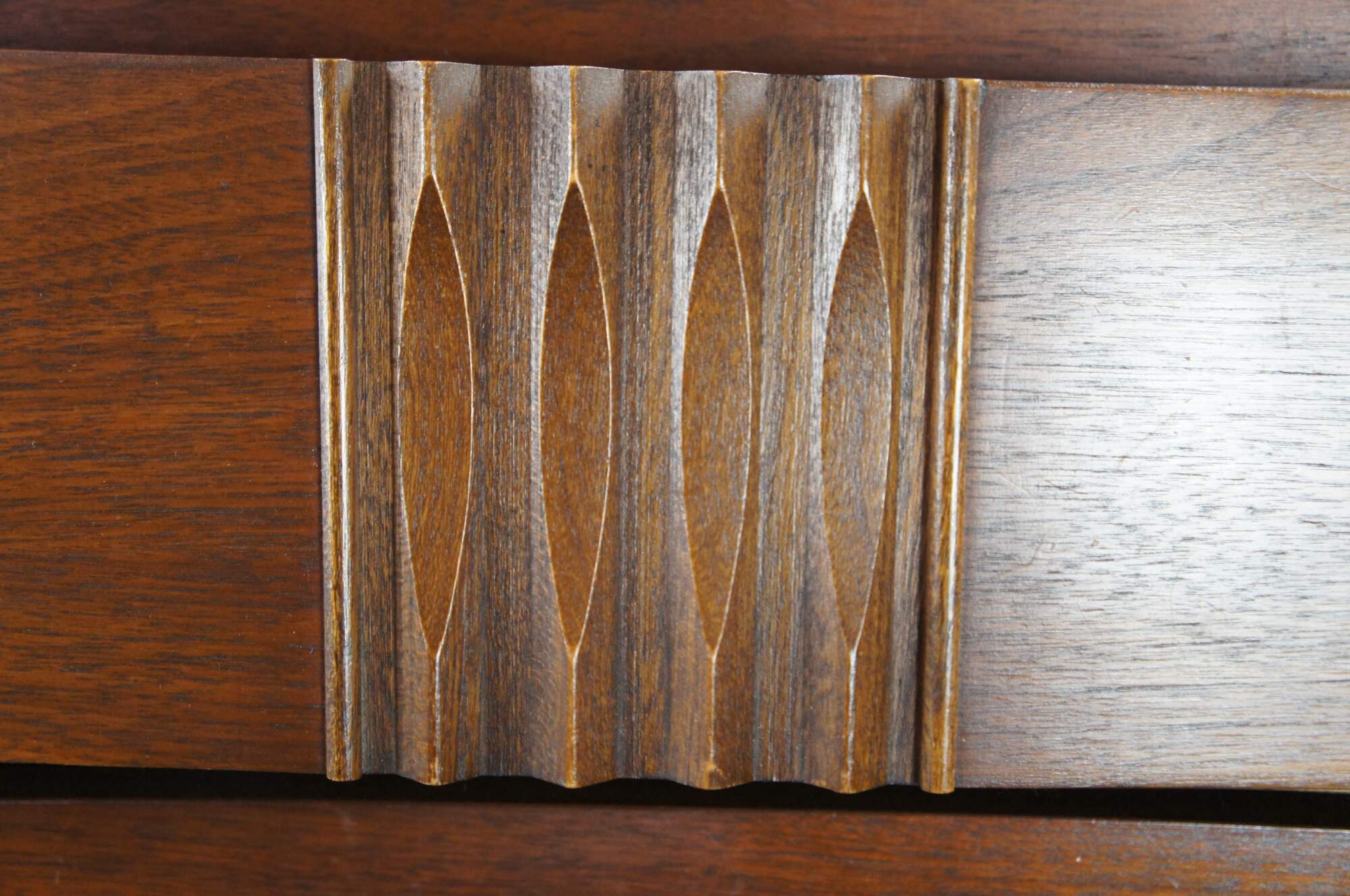 1960s Bassett Furniture Industries Dresser. Made from gunstock walnut with four dovetailed drawers accented by brass pulls. Features a serpentine / oxbow upper drawer with fluted design along the center. The chest is supported by tapered and turned feet.