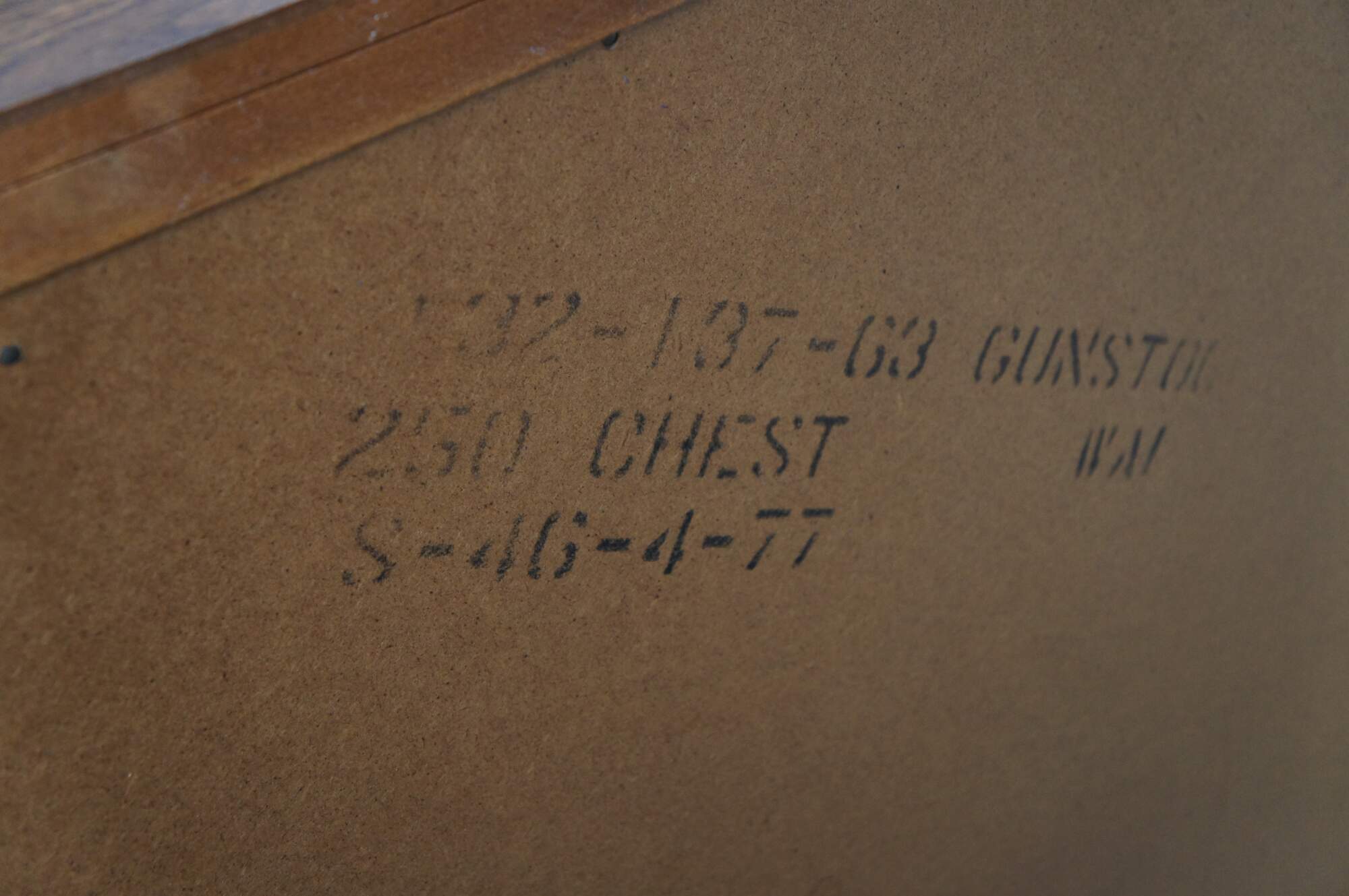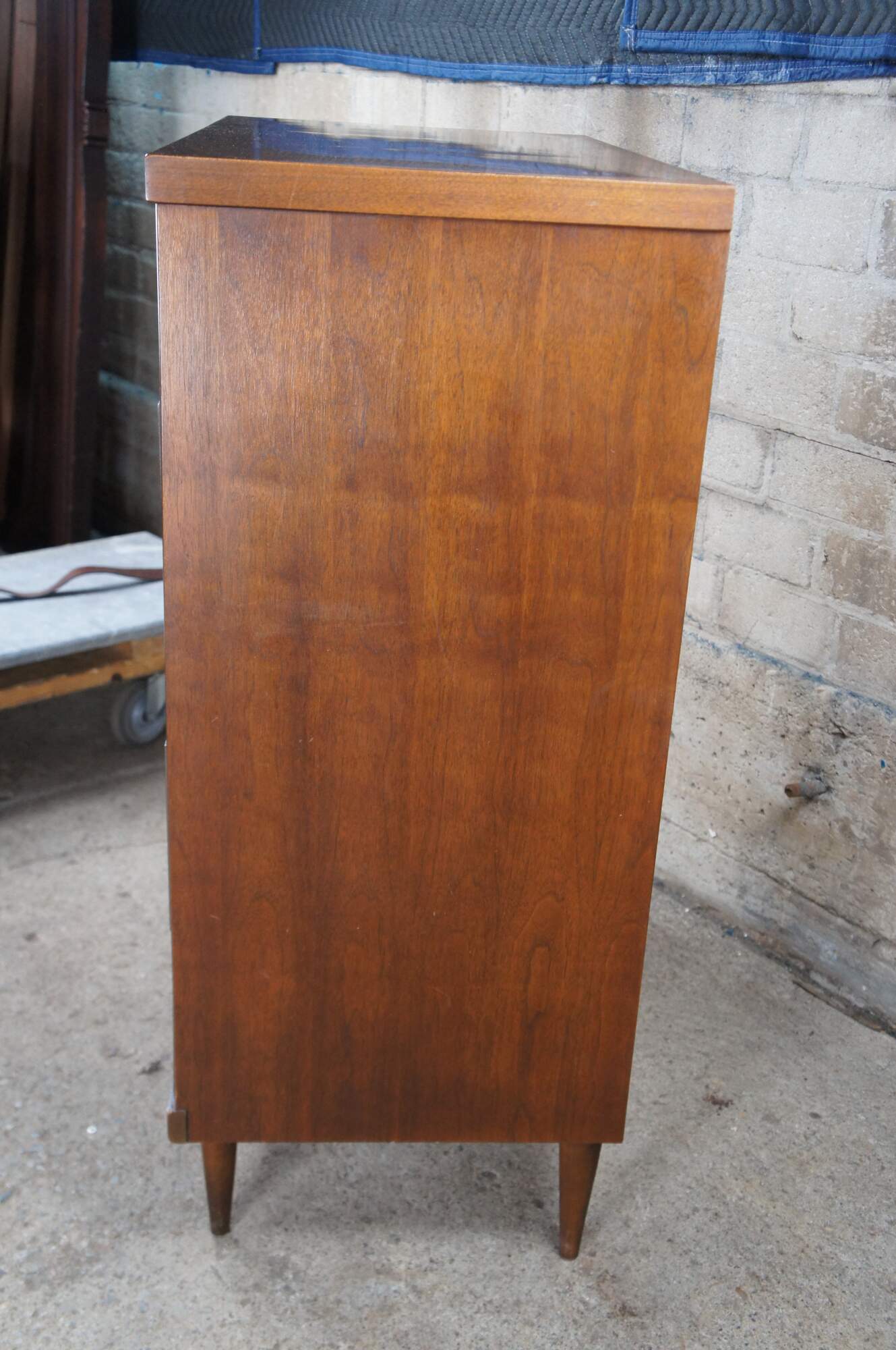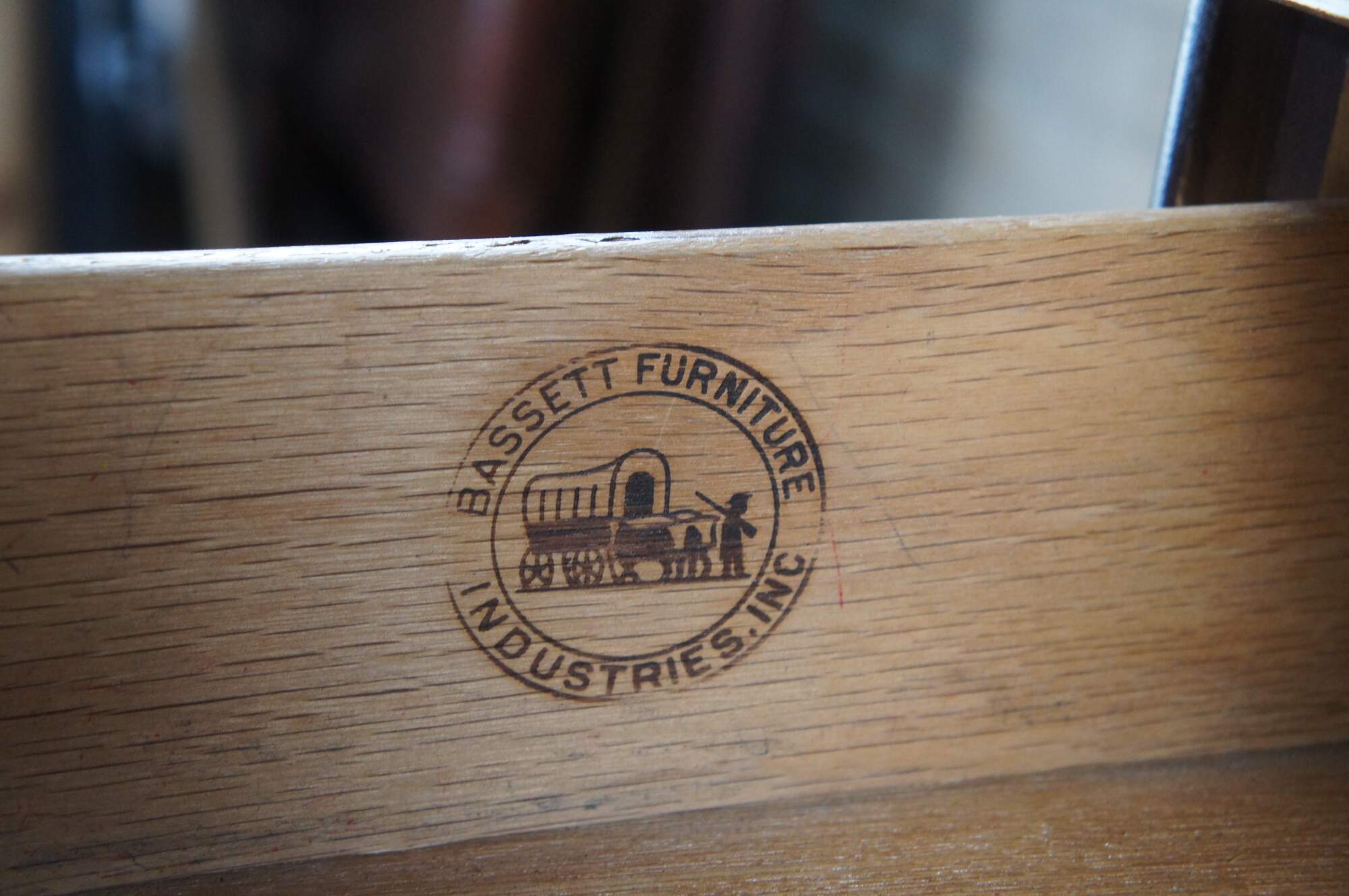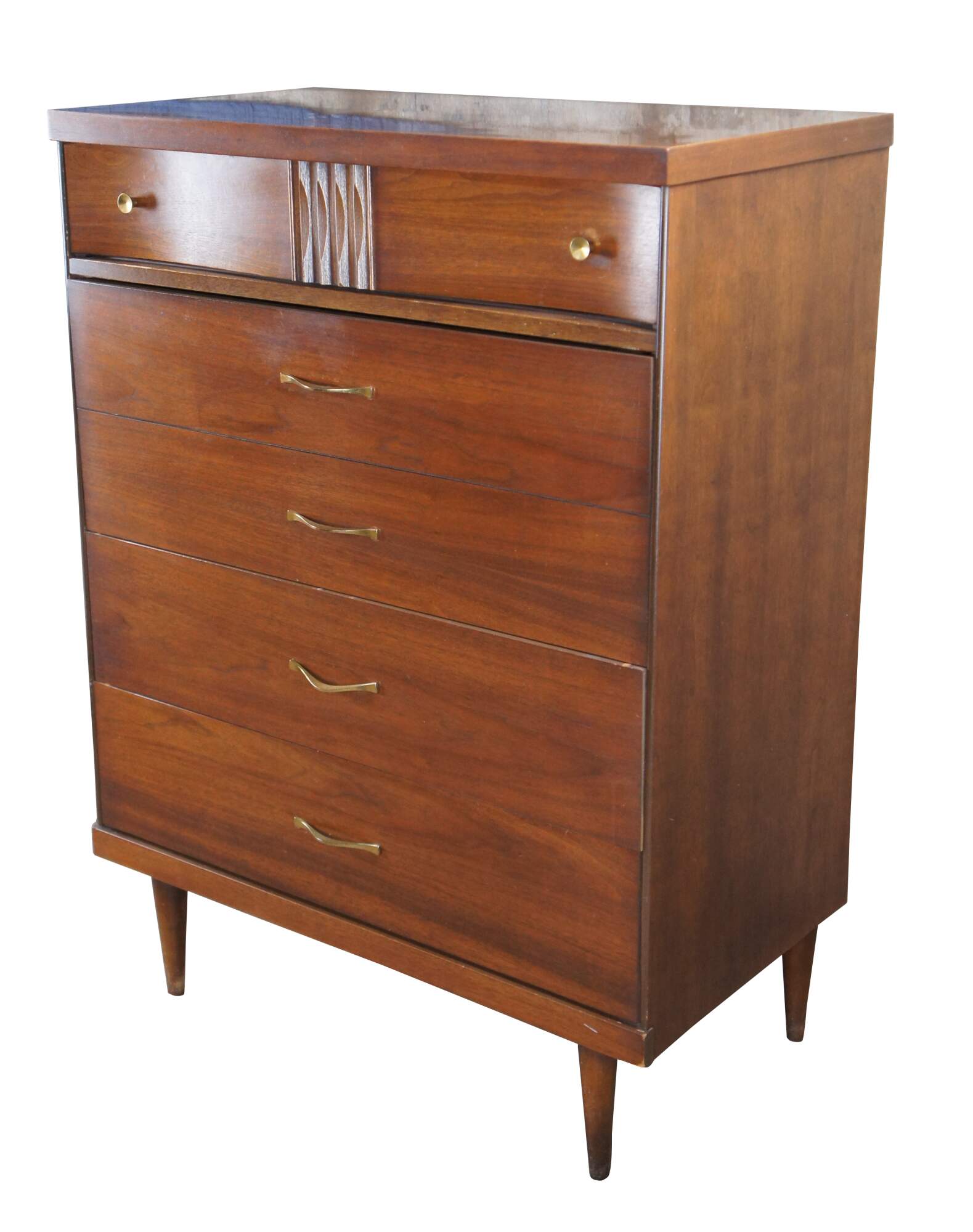 1960s Bassett Furniture Industries Dresser. Made from gunstock walnut with four dovetailed drawers accented by brass pulls. Features a serpentine / oxbow upper drawer with fluted design along the center. The chest is supported by tapered and turned feet.