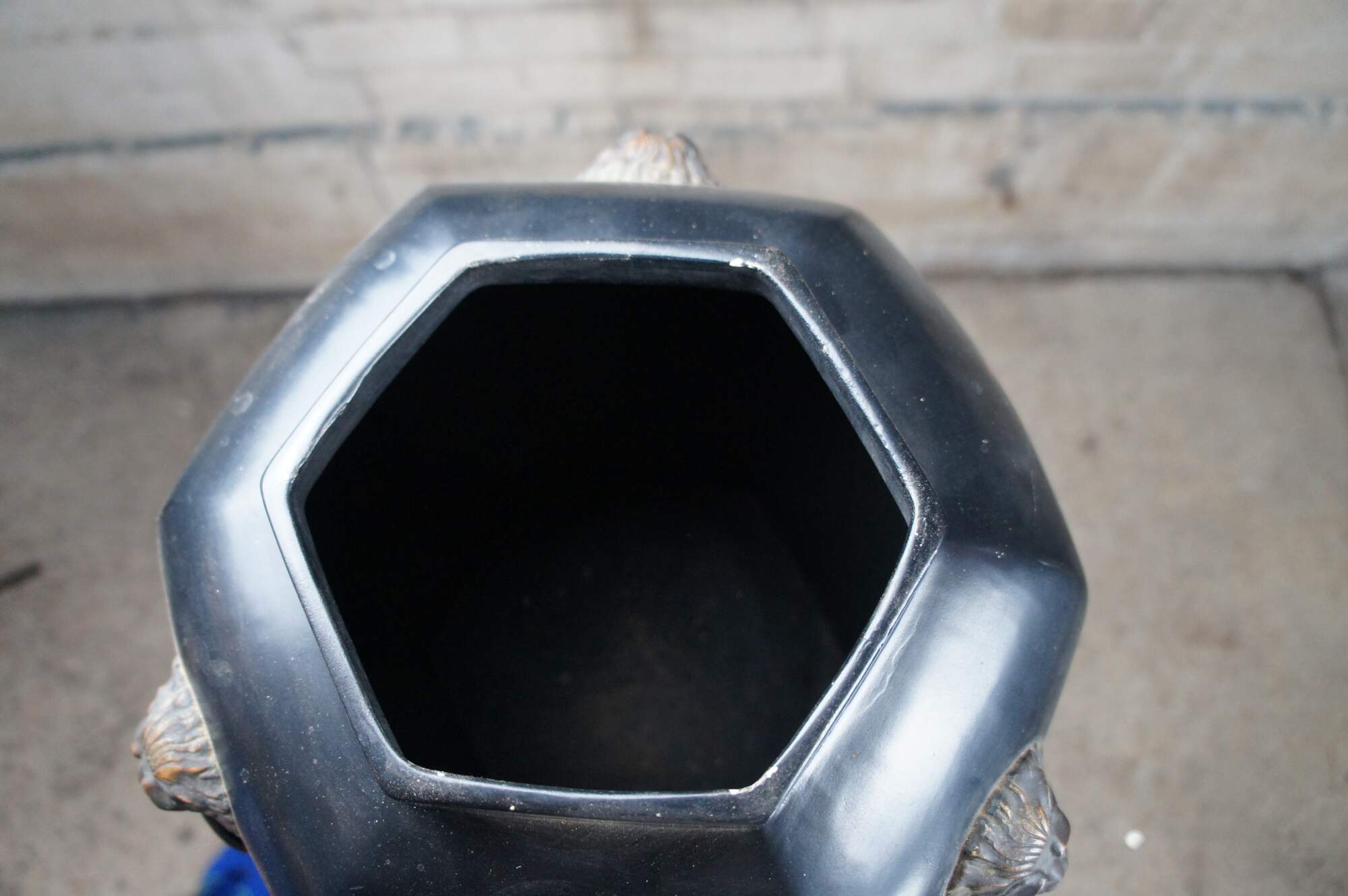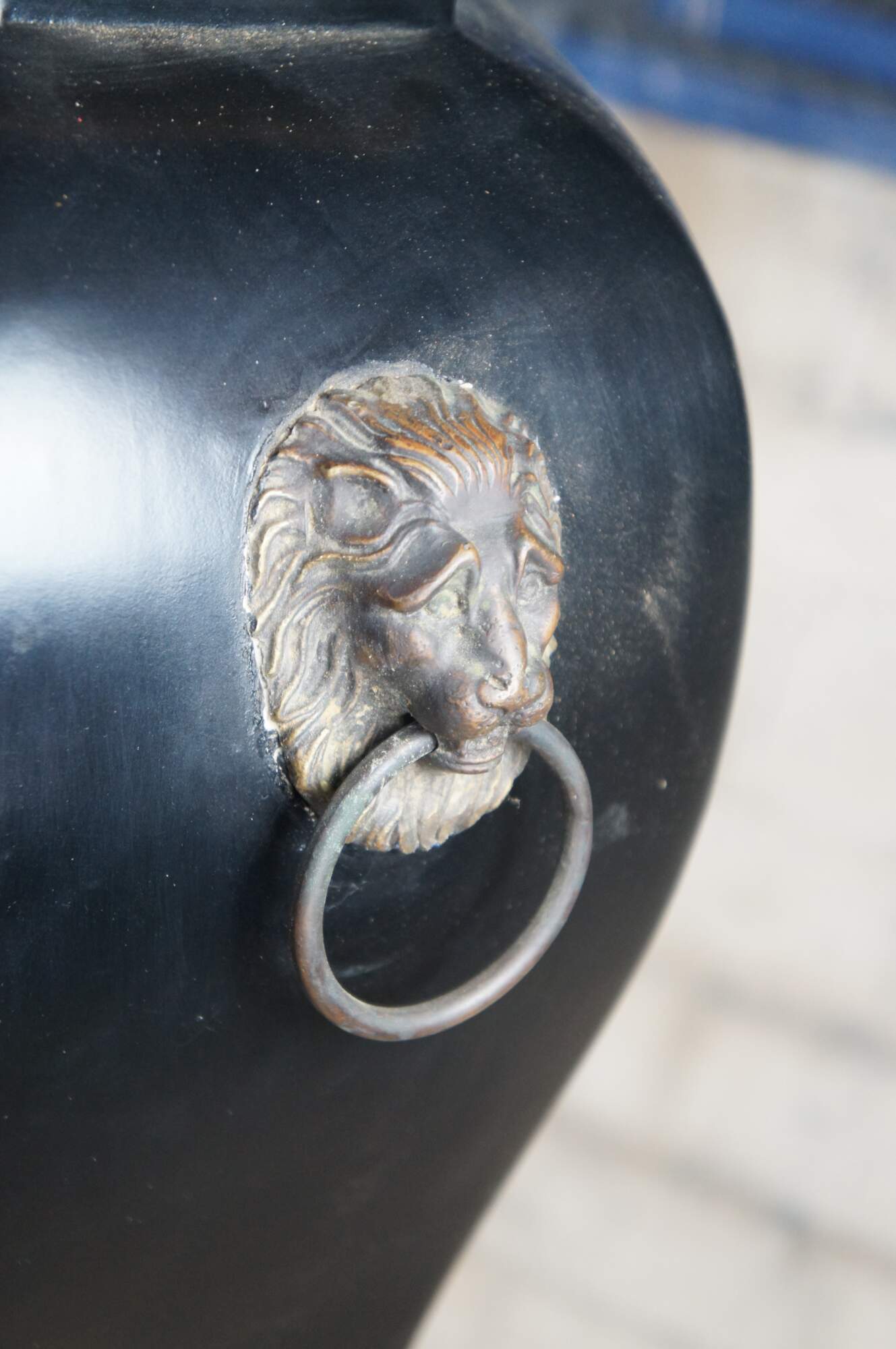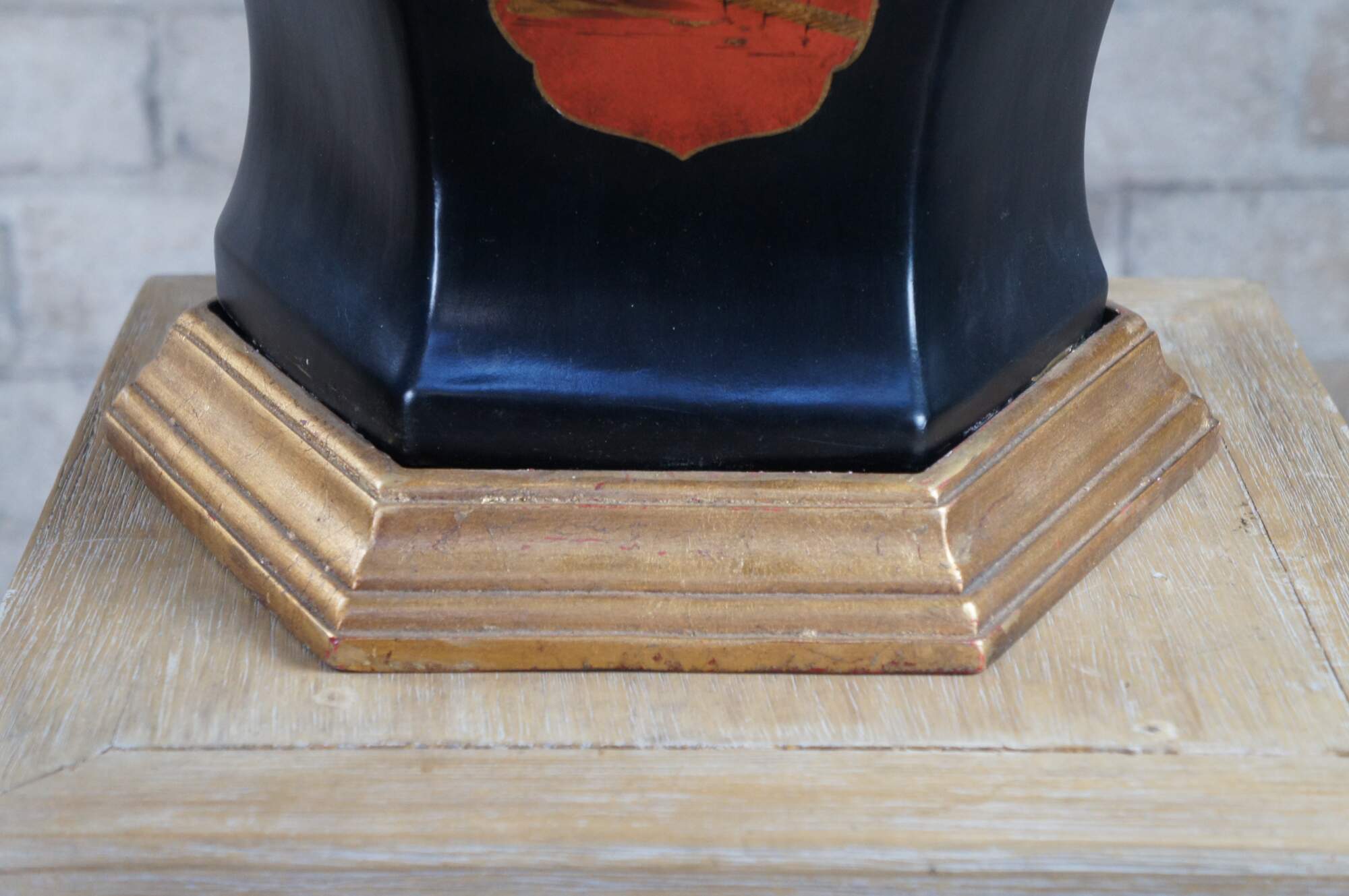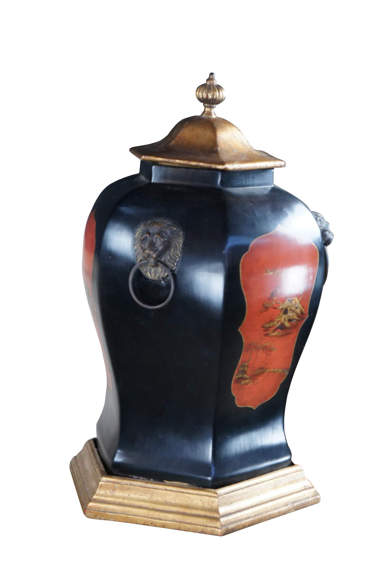 Ceramic Chinoiserie Lidded Ginger Jar Over Plinth Base. Features a ceramic body finished in black with red oriental geisha scene set between brass lion head knockers. The vase rests on a plinth base. Lid and base are wooden.