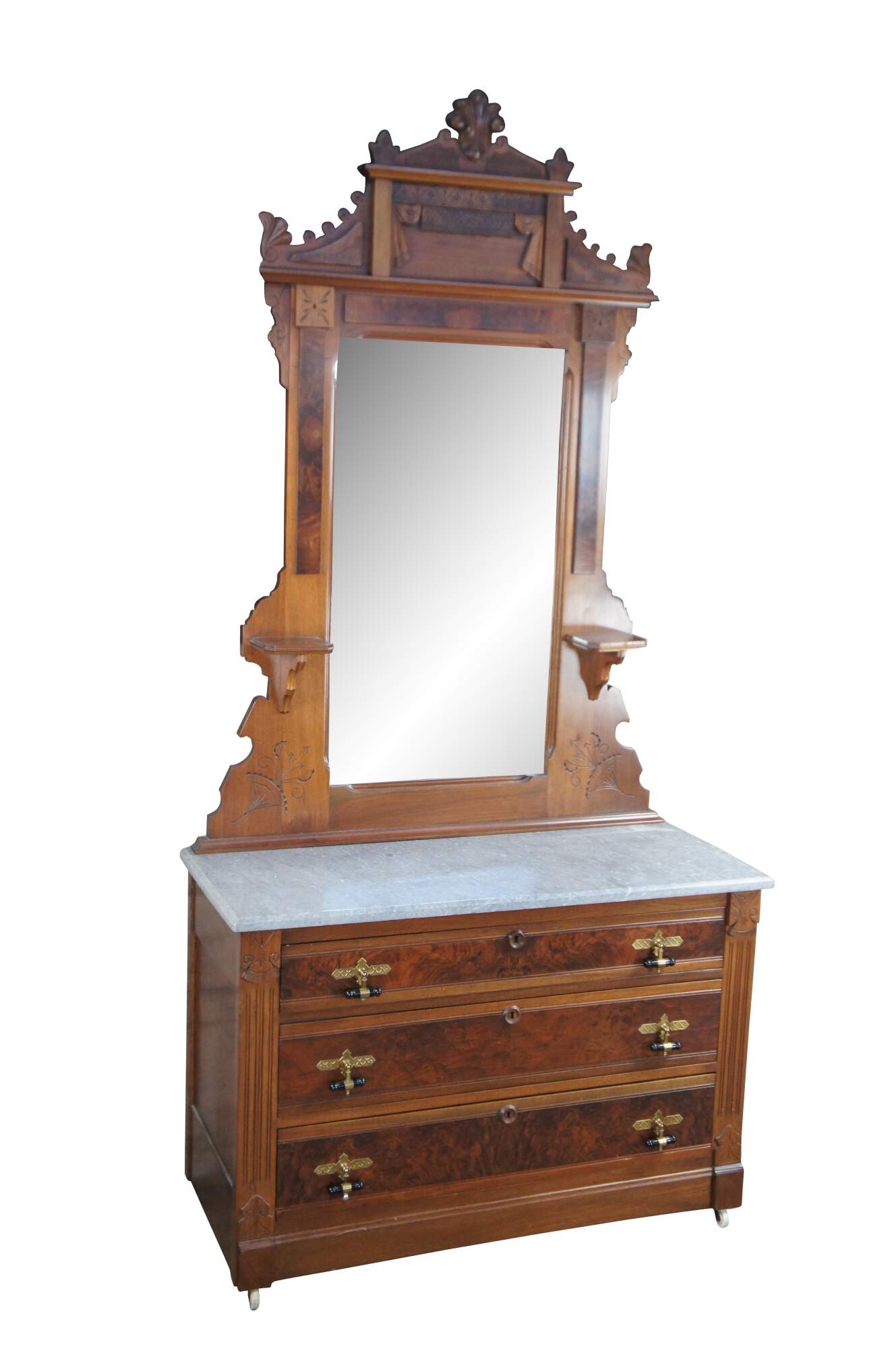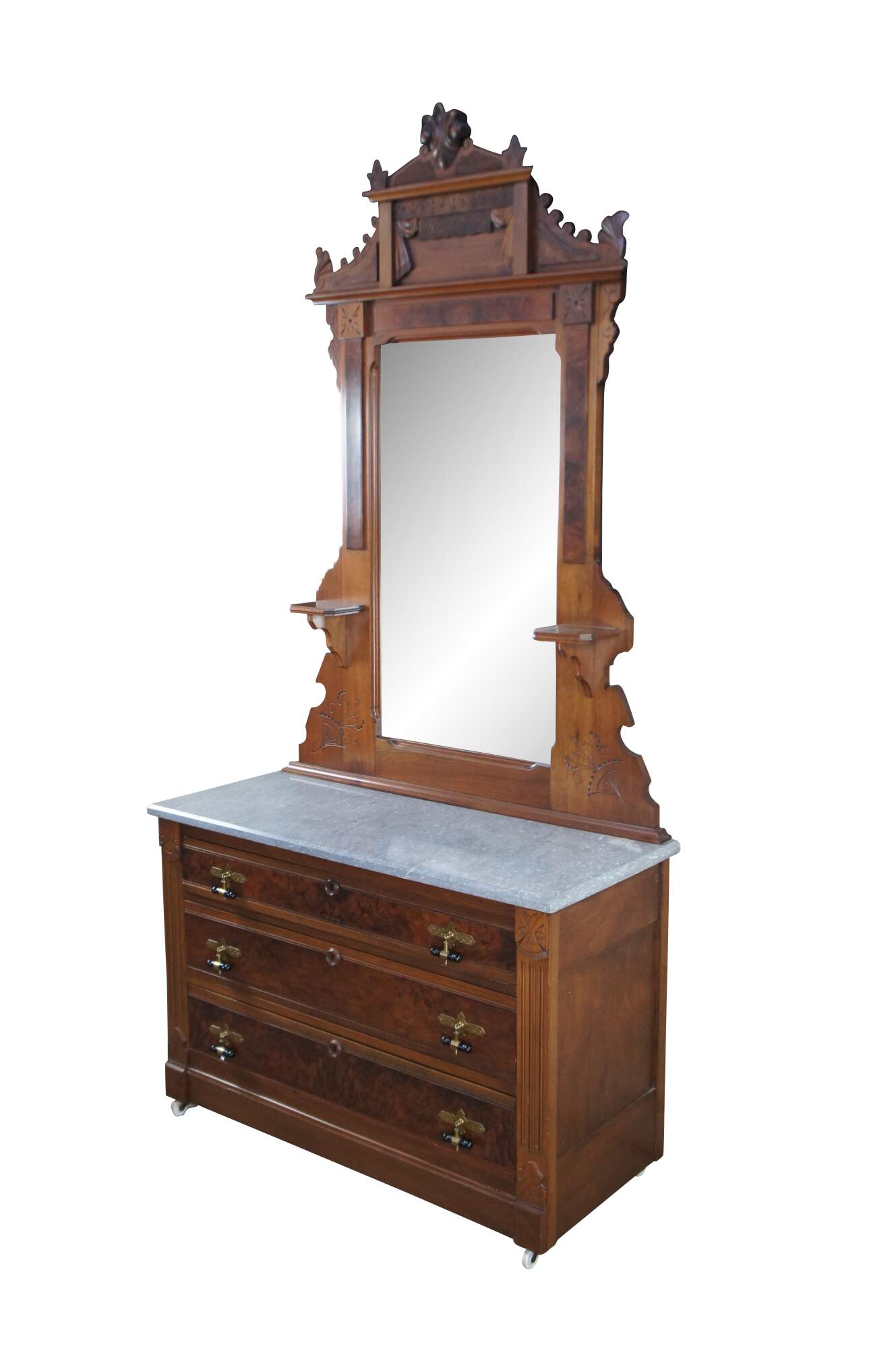 A charming antique Victorian Renaissance Revival dresser & mirror, circa 1880s. Made from walnut with vibrant burled panels along the front and matchbook burling along the sides. It features a large ornately carved mirror with looking glass set between two shelves over a marble chest of drawers. Dovetailed drawers are between fluted stiles with ornate brass knocker pulls and keyhole escutcheons. The dresser is set over porcelain casters for ease of movement.