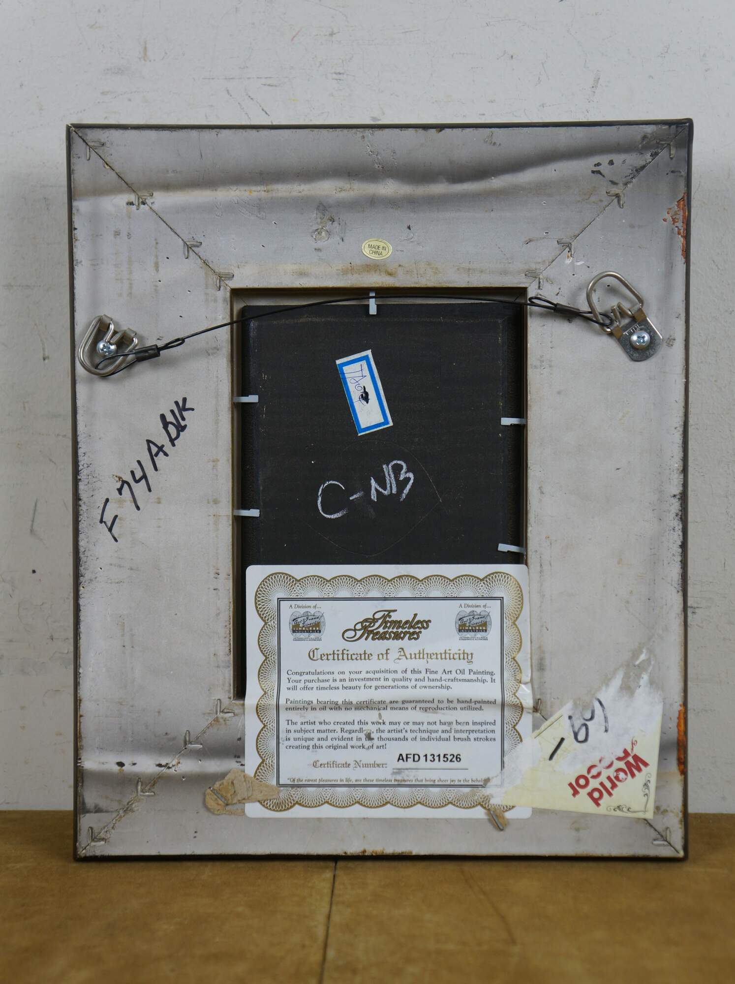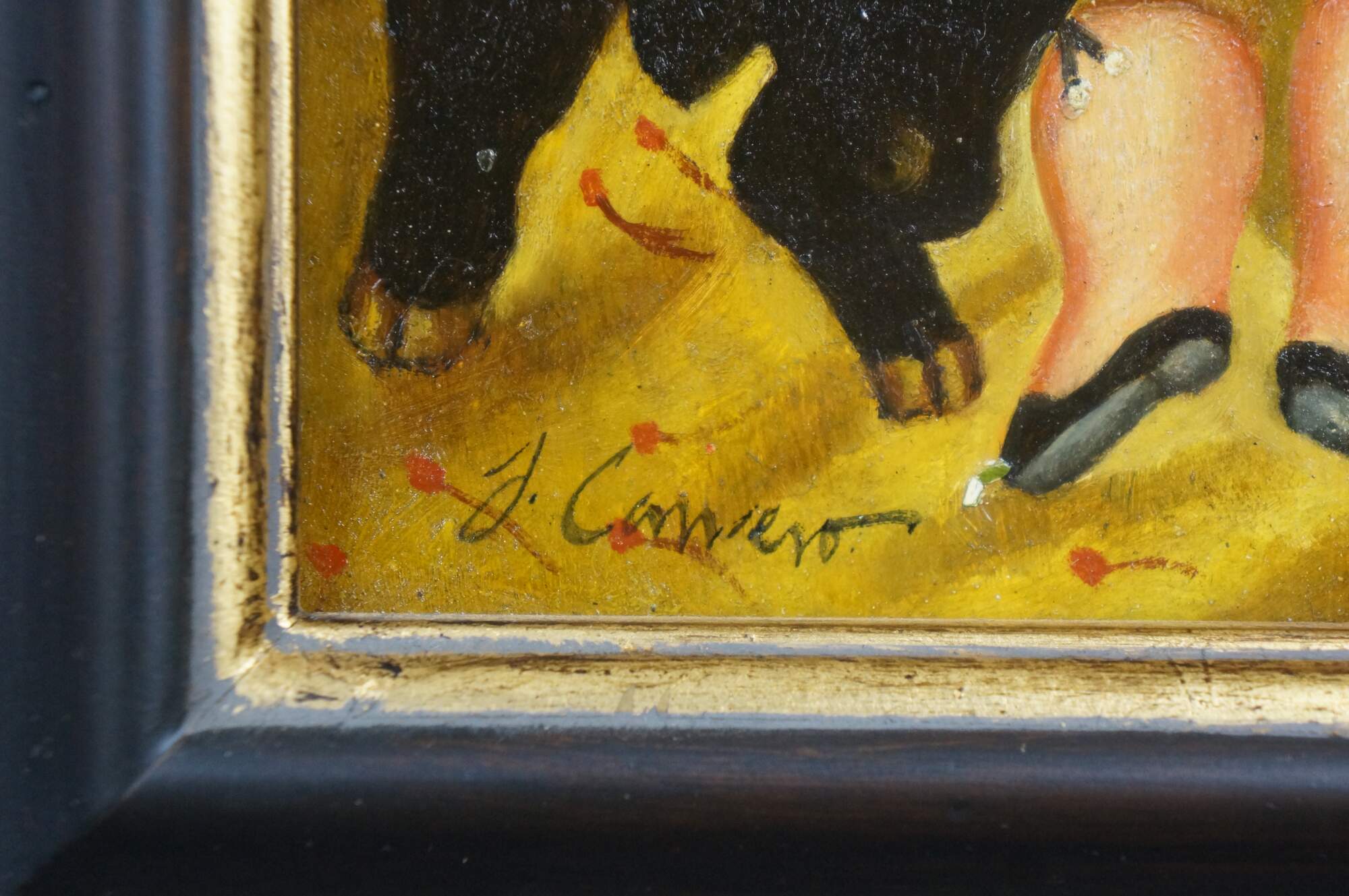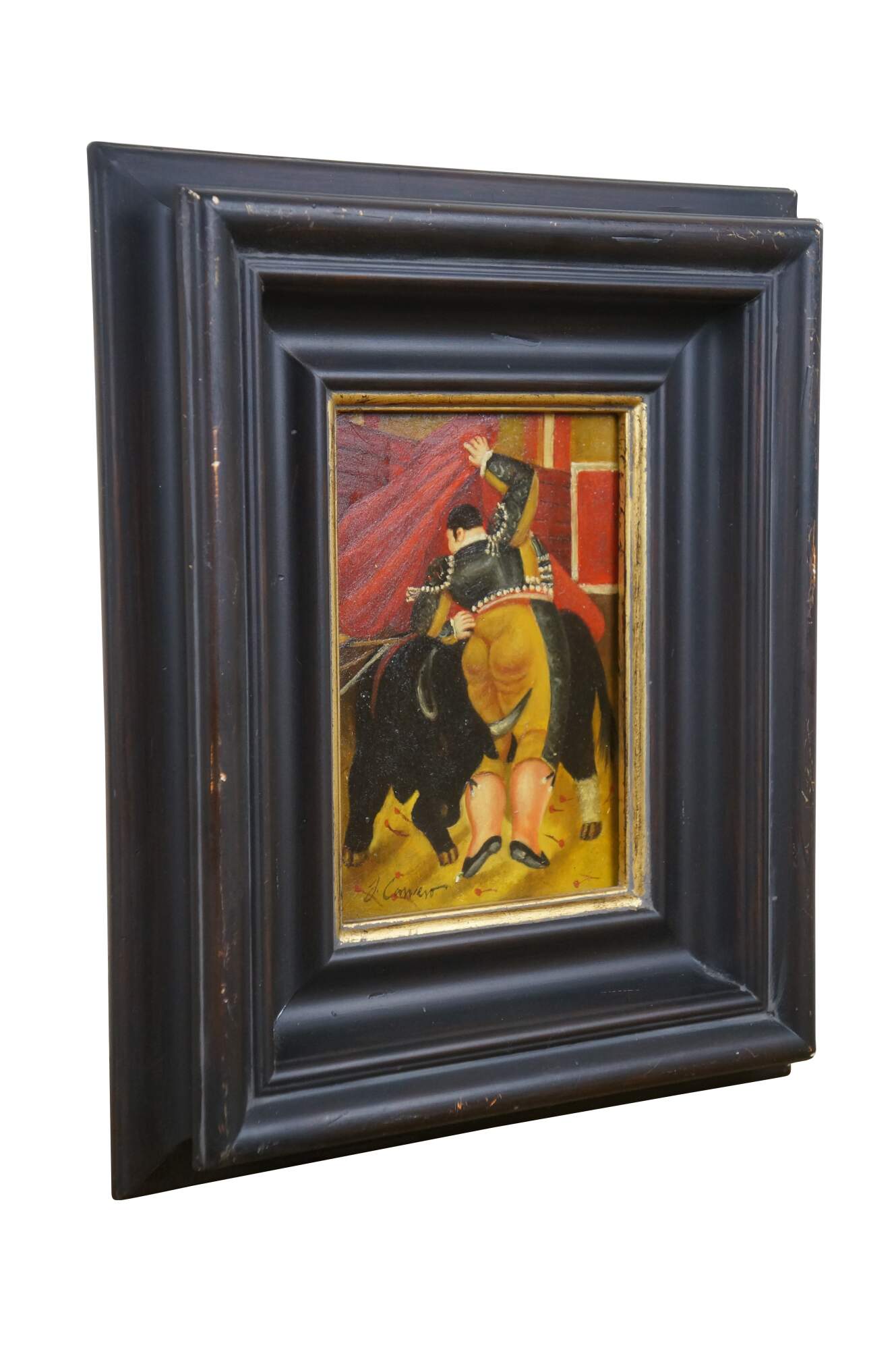 Late 20th century Timeless Treasures oil on board painting styled after Fernando Botero's "El Matador." Depicts a black bull dashing around the legs of a matador in gold and black as he swirls his red cape in the air. Signed in lower left corner. Includes Certificate of Authenticity Number: AFD131526. Beveled wood tone composite frame. Frame made in China.