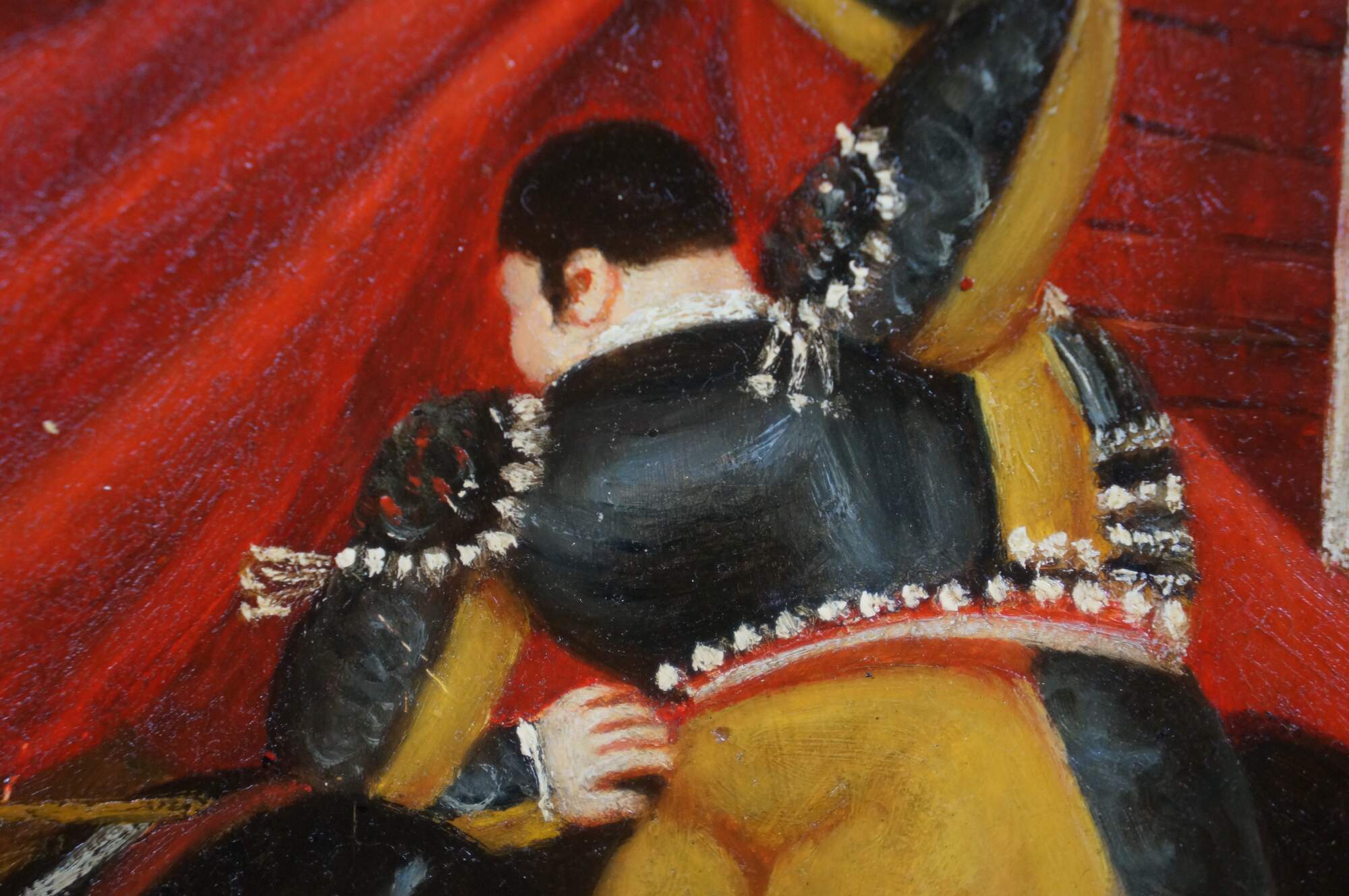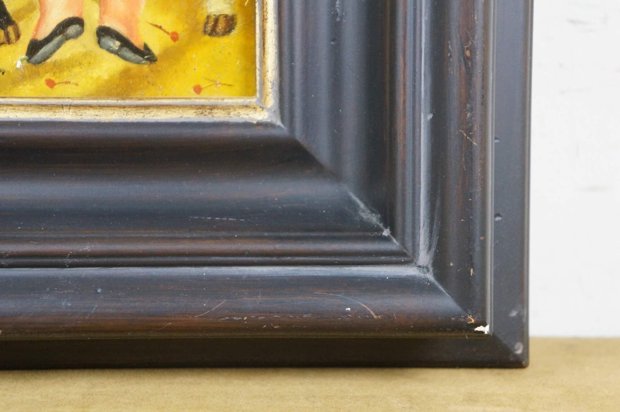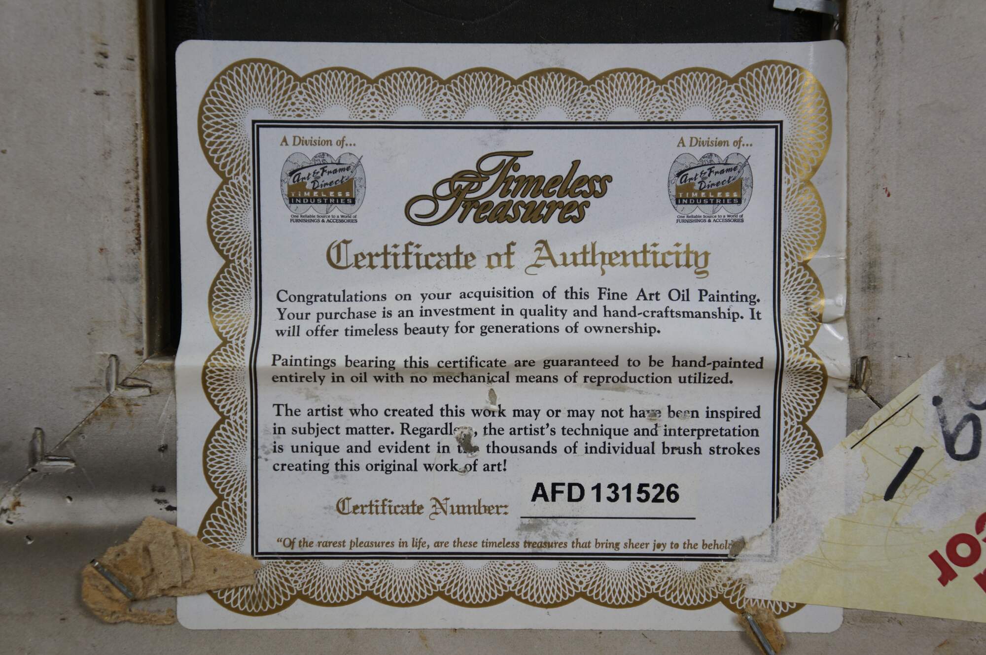 Late 20th century Timeless Treasures oil on board painting styled after Fernando Botero's "El Matador." Depicts a black bull dashing around the legs of a matador in gold and black as he swirls his red cape in the air. Signed in lower left corner. Includes Certificate of Authenticity Number: AFD131526. Beveled wood tone composite frame. Frame made in China.