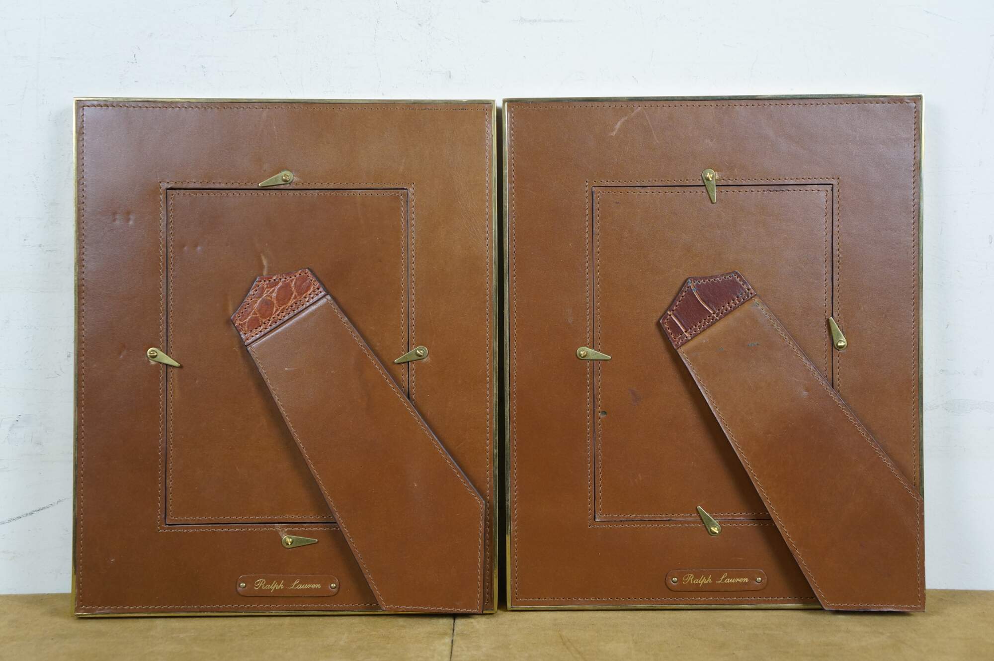 Pair of two vintage Ralph Lauren Webb photo / picture frames. Brown alligator / embossed leather with brass trim and horsebit accent. Rectangular frame, horizontal or vertical orientation; easel back.