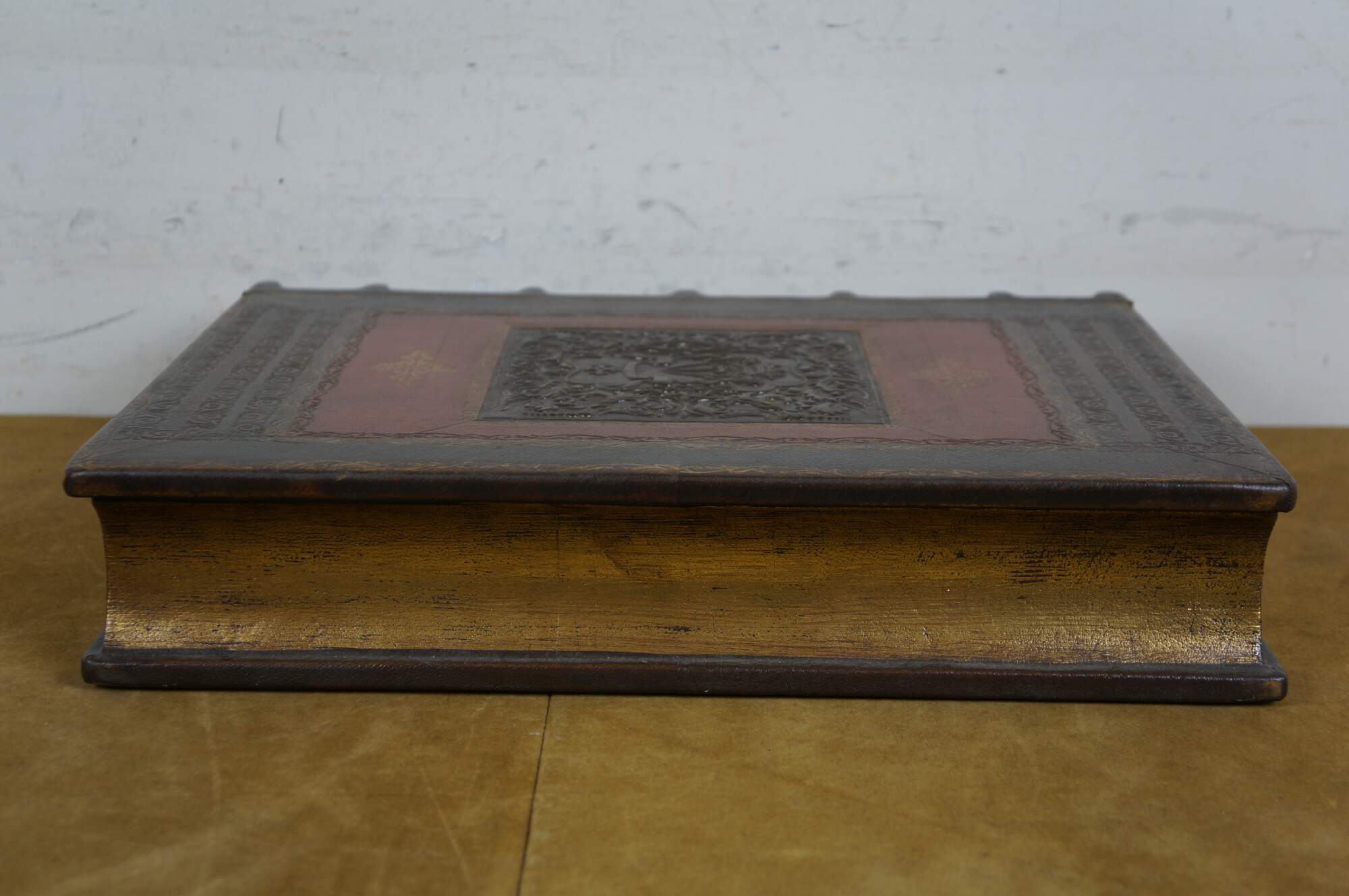 Vintage Theodore Alexander faux book trinket / keepsake box emulating a copy of The Quiver 1882 bound in red and dark brown tooled and gilded leather, with a embossed brass plate on the front, featuring a coat of arms surrounded by swirling foliate vines. Item Number: 1133.053. Hand Made in Vietnam.