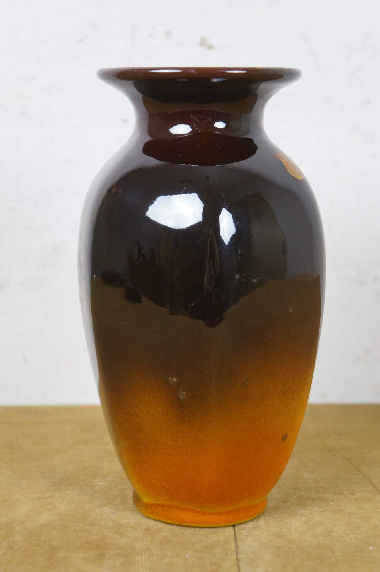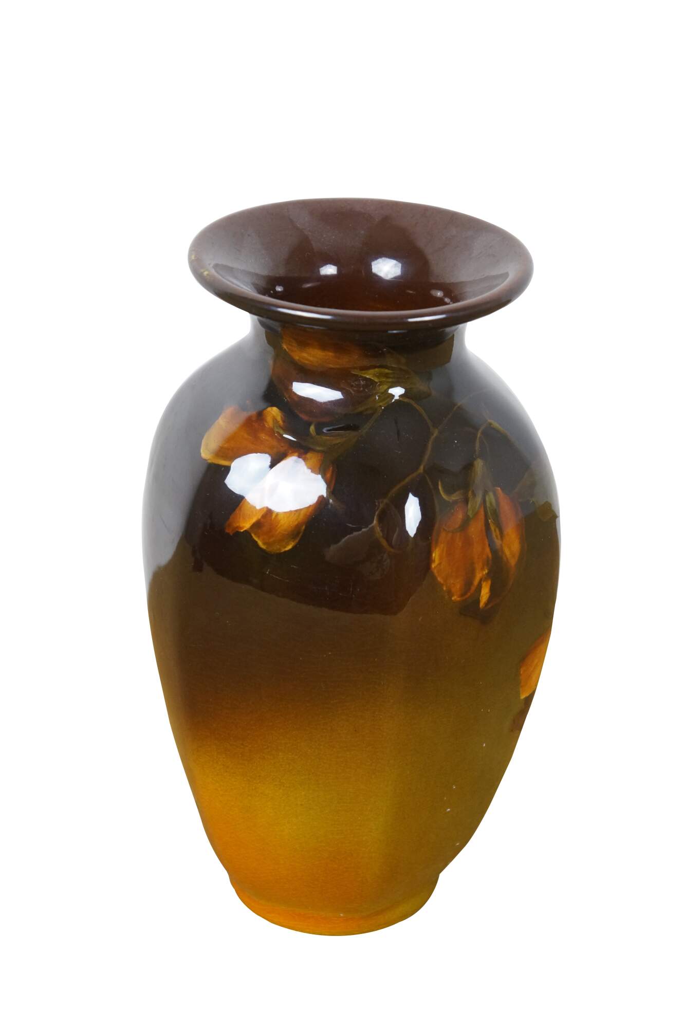 Antique 1899 Rookwood Pottery 705 ceramic flower vase. Simply styled vase with tapered base and flared mouth, decorated with a golden green to dark brown ombré and painted under the glaze with drooping soft orange flowers.